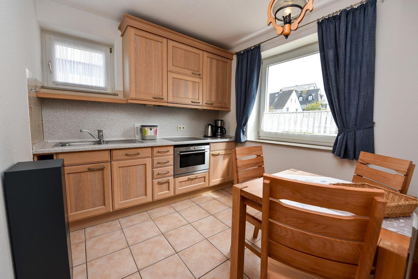 Zur Ausstattung gehören u.a. Kühlschrank, E-Herd mit Cerankochfeld, Kaffeemaschine, Wasserkocher, Toaster, Geschirrspüler, und auch ein Flachbildfernseher ist vorhanden. Selbstverständlich verfügt die Wohnung auch über kostenfreies WLAN sowie einen nummerierten Pkw-Stellplatz.