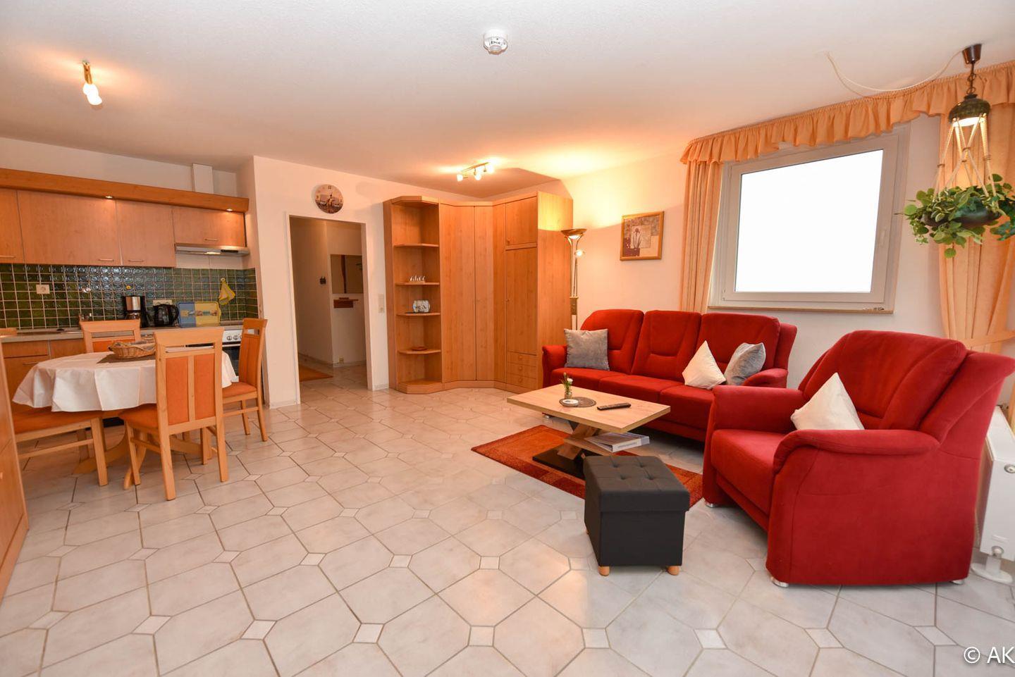 1 Wohn-/Schlafraum mit Schrankklappbetten; Küchenzeile mit Kühlschrank, Kaffeemaschine, E-Herd; Flachbildfernseher vorhanden; Bad mit Dusche und WC; Pkw-Tiefgaragenstellplatz; Lage: 3. Etage mit Balkon, Seesicht