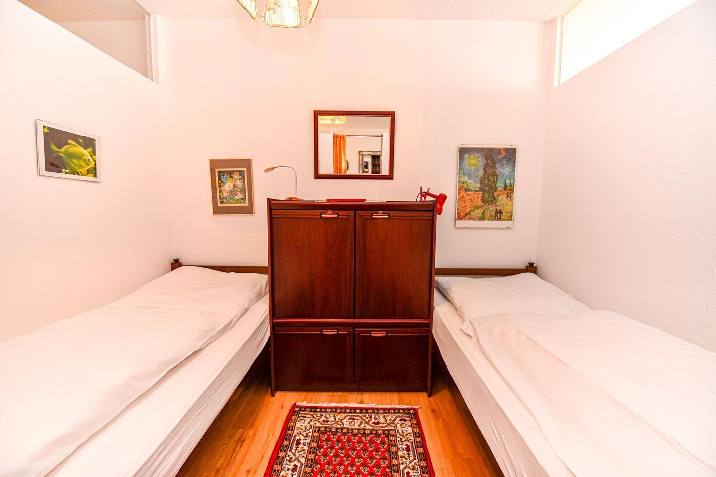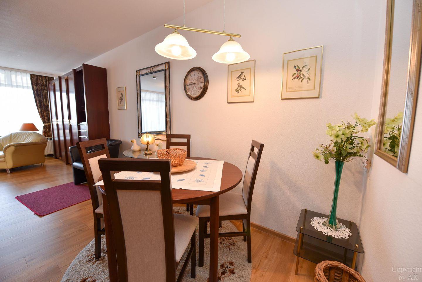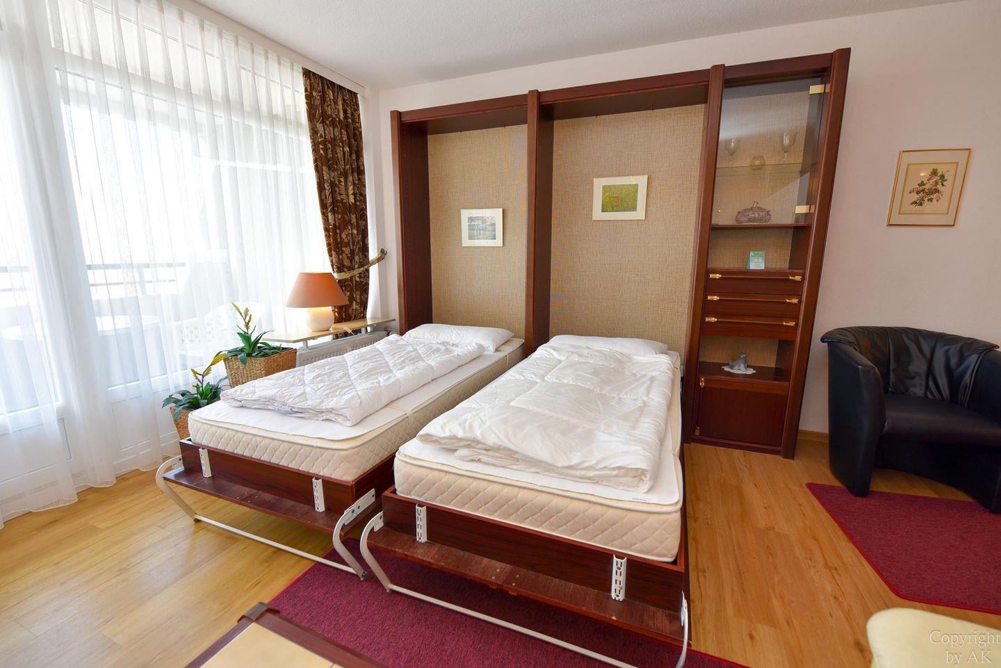 1 Wohnzimmer, 1 Schlafnische mit 2 Einzelbetten; Küchenzeile mit Kühlschrank, Kaffeemaschine, E-Herd; Flachbildfernseher vorhanden; Bad mit Dusche und WC; Pkw-Tiefgaragenstellplatz. Lage: 4. Etage mit Balkon, Seesicht