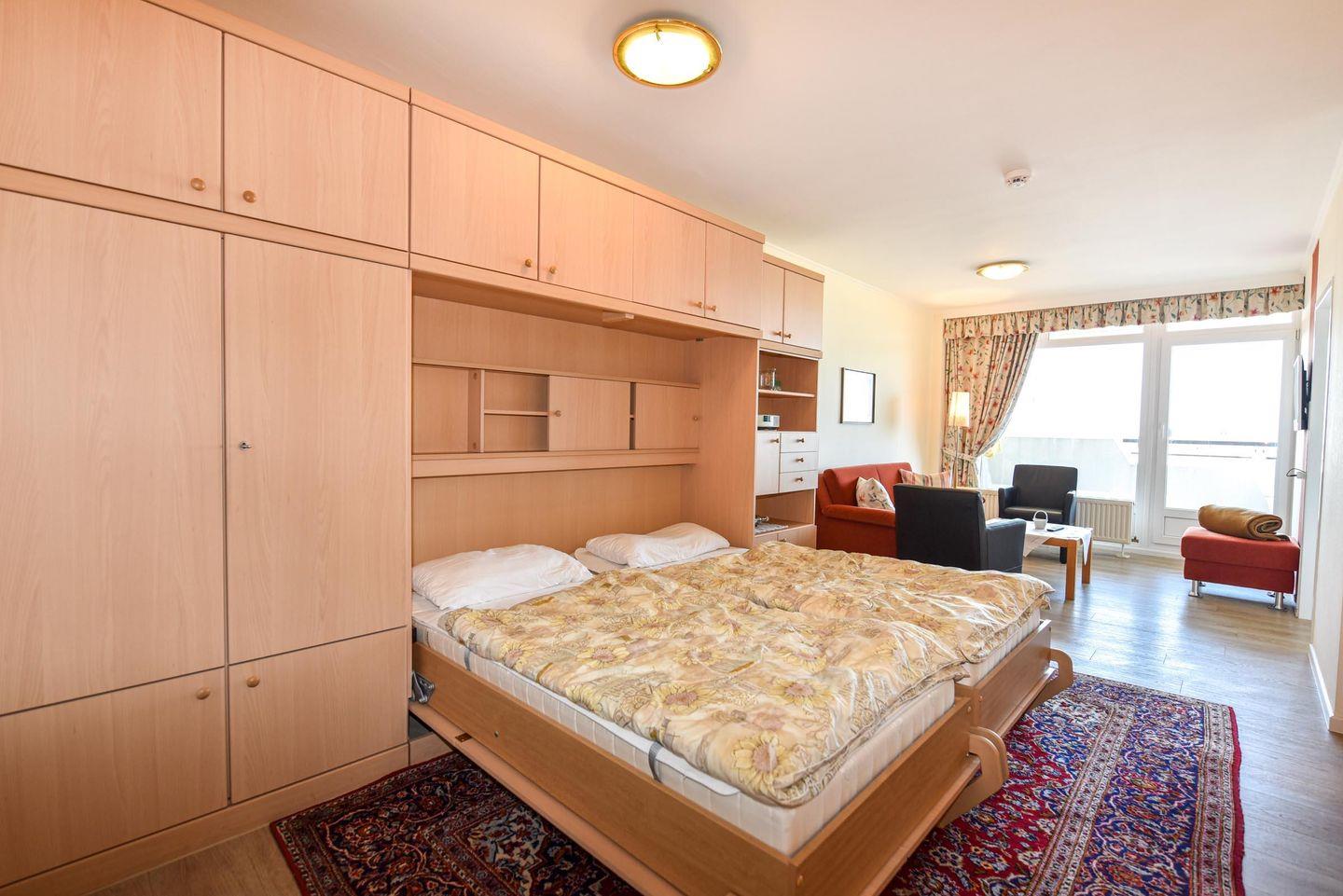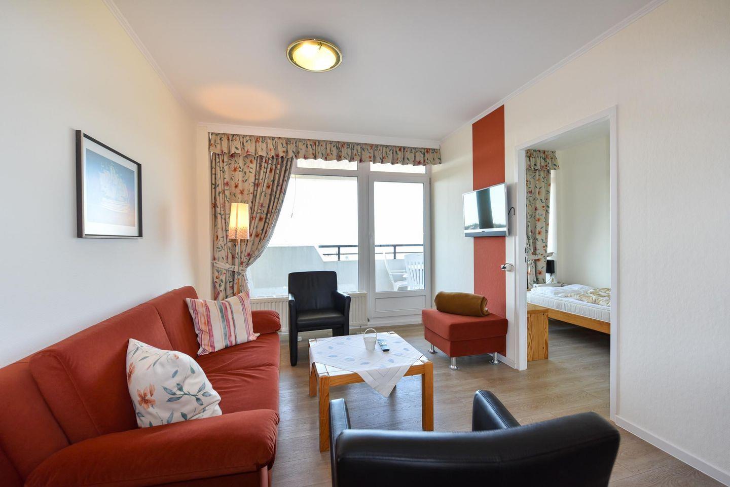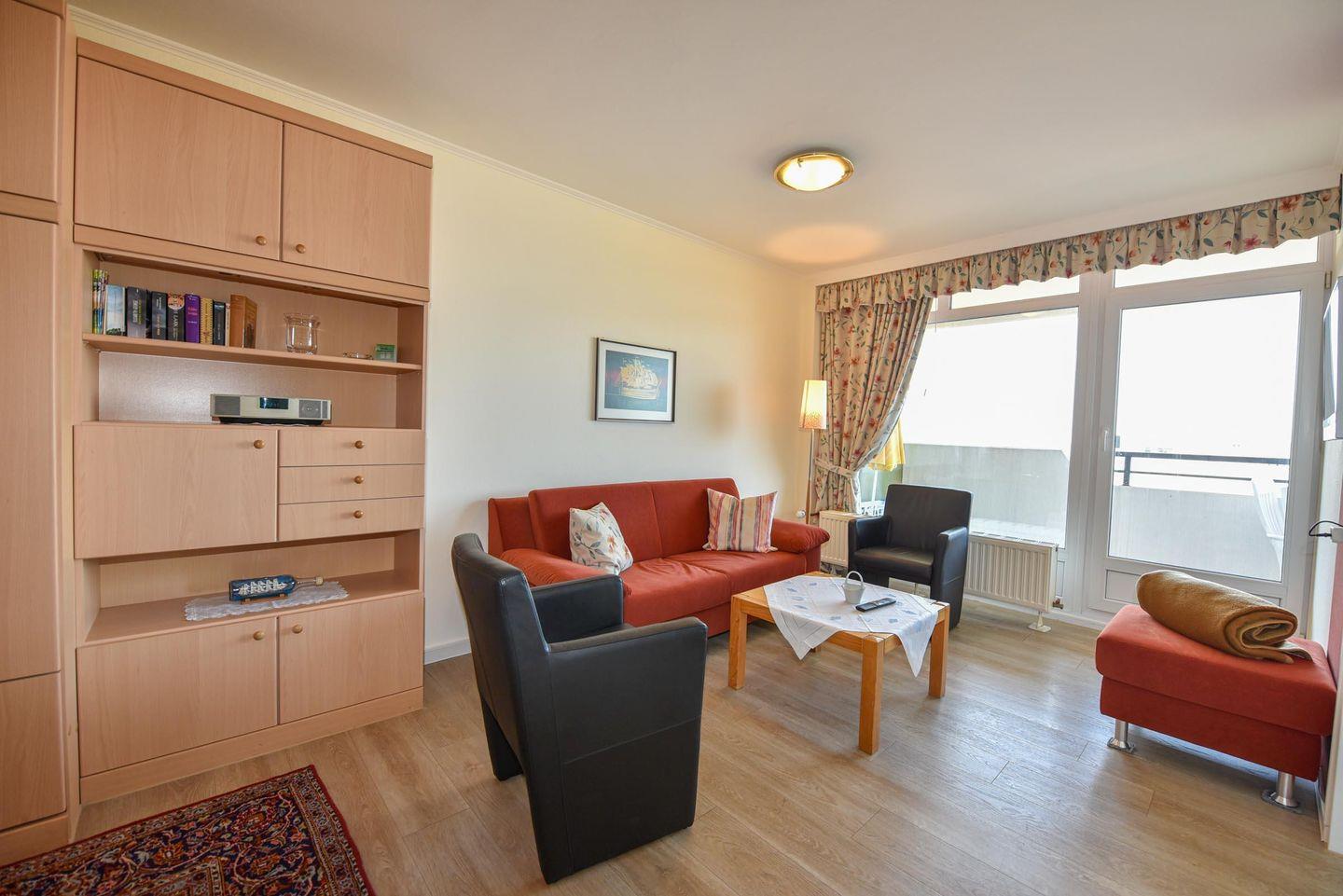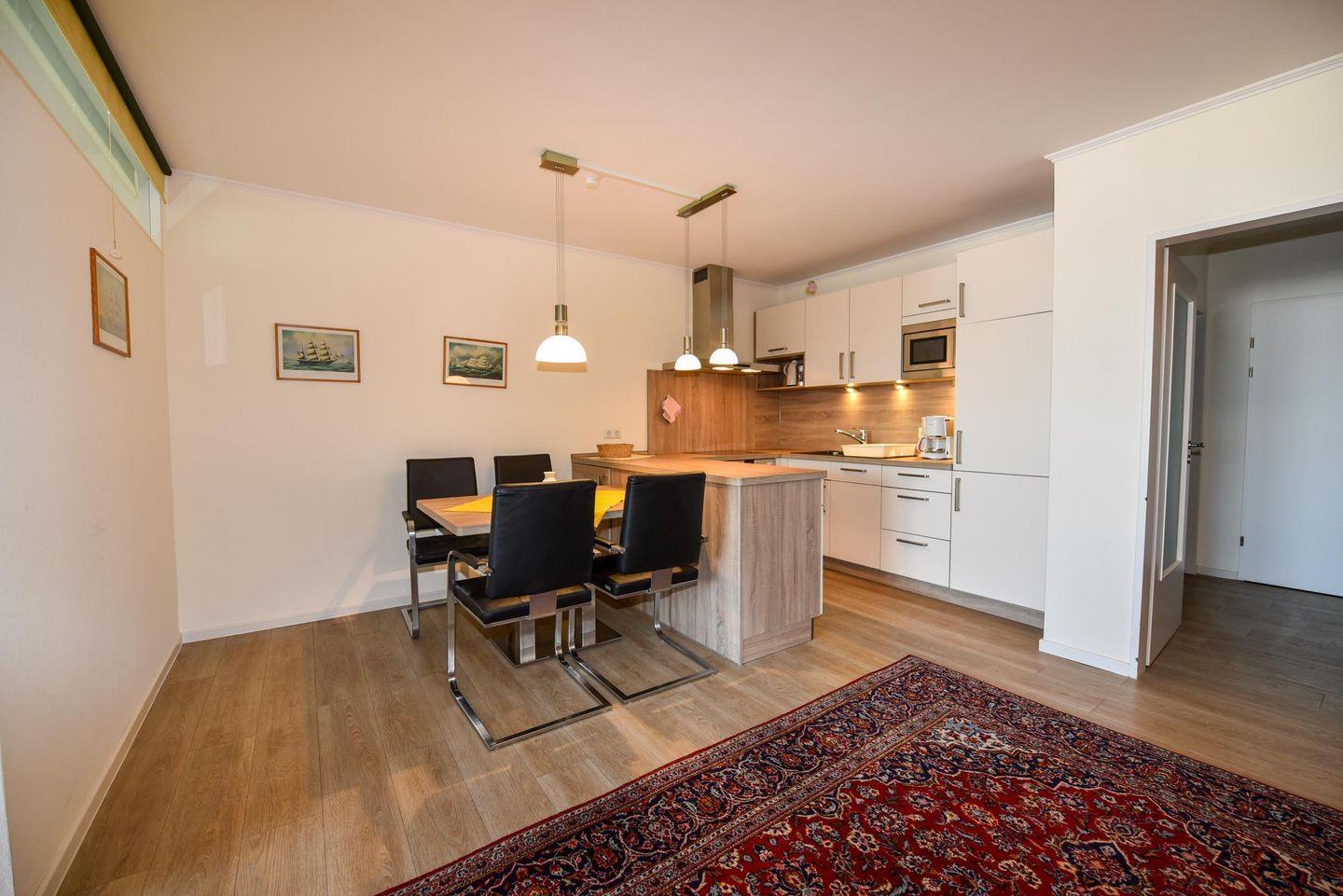 Die Wohnung ist geschickt aufgeteilt in einen gemütlichen Schlaf-/Wohnbereich mit einem Schrankbett sowie einer gut ausgestatteten Küchenzeile, die u.a. einen Kühlschrank, Kaffeemaschine, Wasserkocher, Toaster, Mikrowelle und E-Herd beinhaltet. Ein separates Schlafzimmer mit zwei Einzelbetten und ein Badezimmer mit Dusche und WC stehen Ihnen ebenfalls zur Verfügung. Ein Flachbildfernseher sorgt für Unterhaltung, und der Balkon lädt dazu ein, die frische Meeresluft zu genießen. Ein eigener Pkw-Tiefgaragenstellplatz ist für Ihre Bequemlichkeit vorhanden.