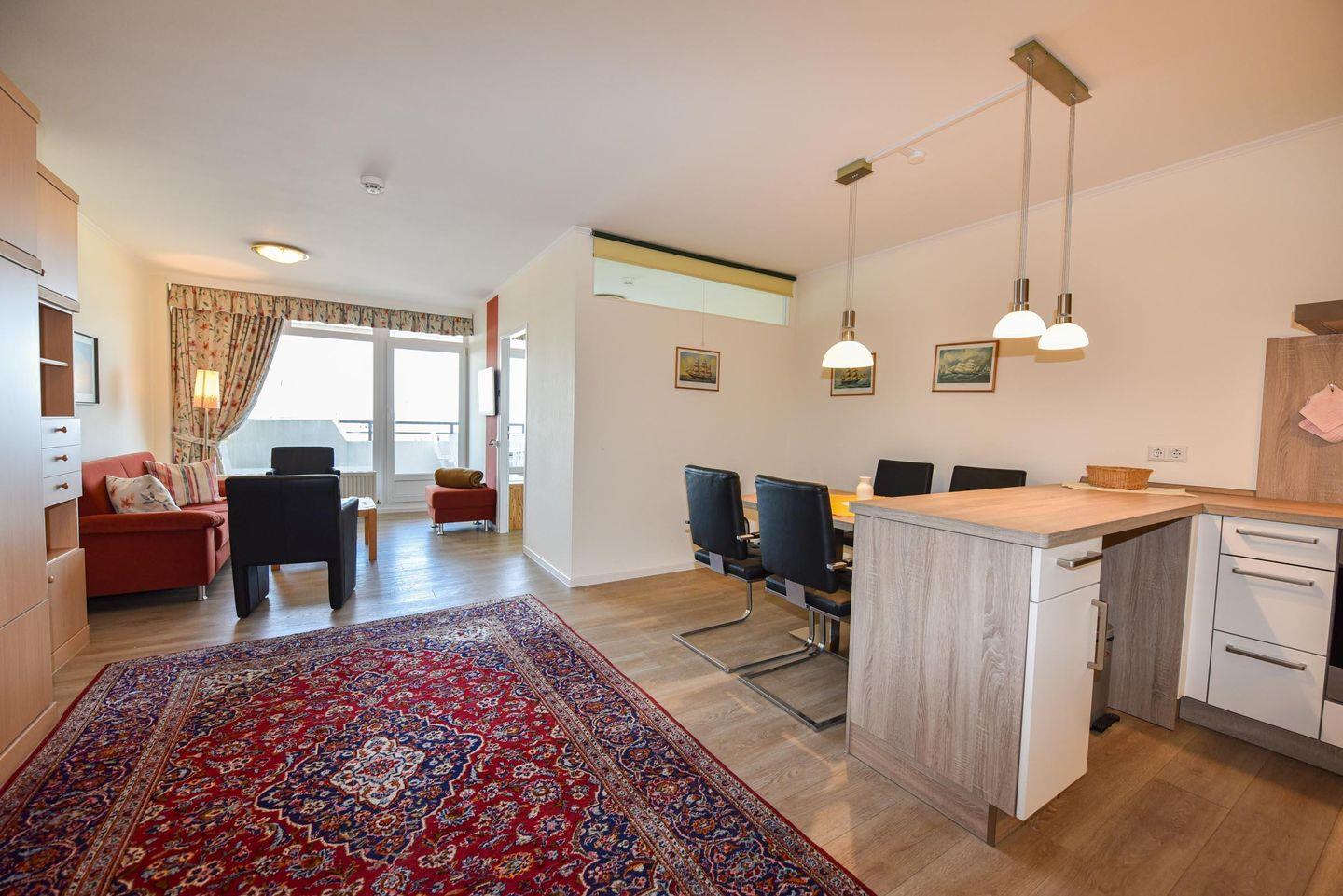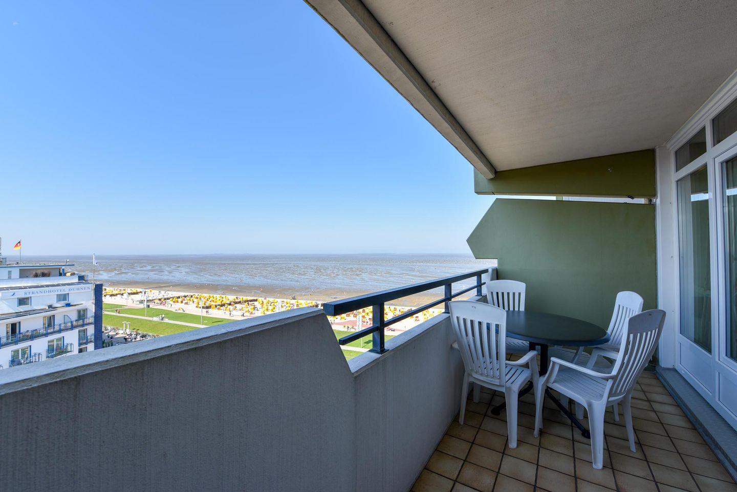 Die charmante Wohnung Nr. 99 erwartet Sie im 7. Stock des Haus Panorama und bietet einen atemberaubenden Blick auf die Nordsee in Richtung der Insel Neuwerk.