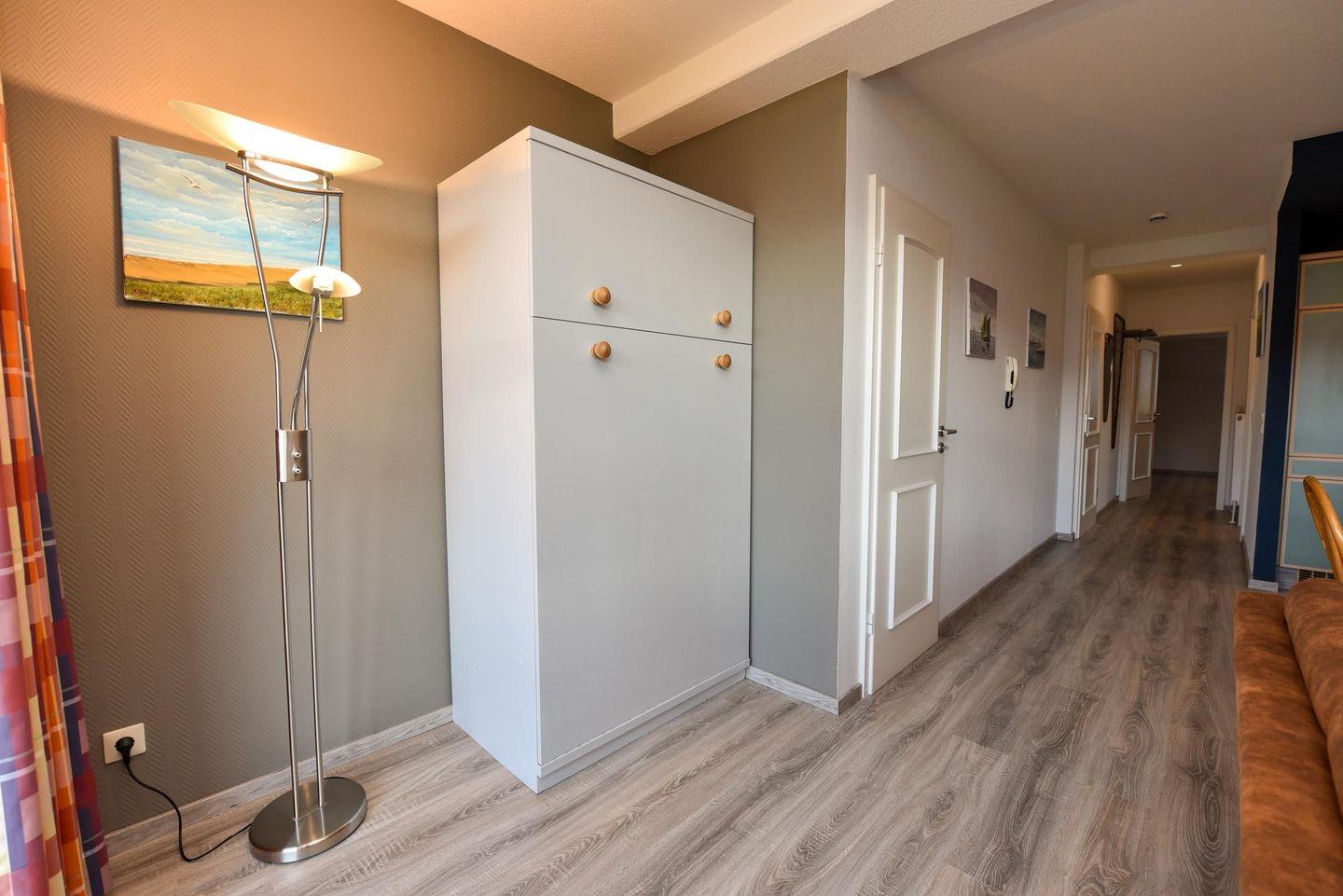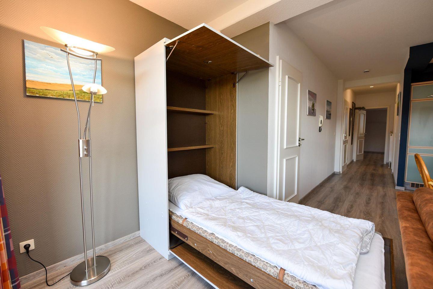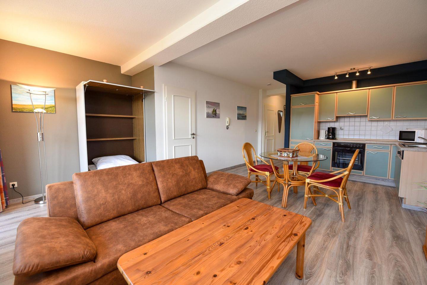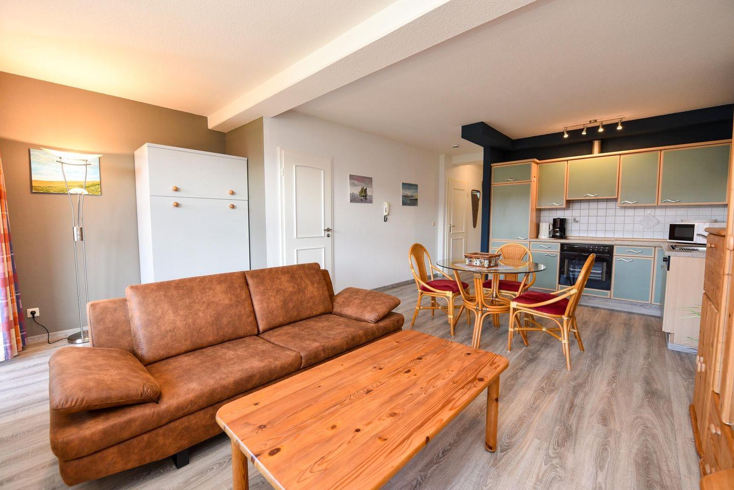 Das gemütliche Nichtraucher-Appartement SEE204 im Haus Seeland 2 befindet sich im ersten Stock und umfasst ein Schlafzimmer, ein Wohnzimmer mit integrierter Küche und ein Badezimmer.