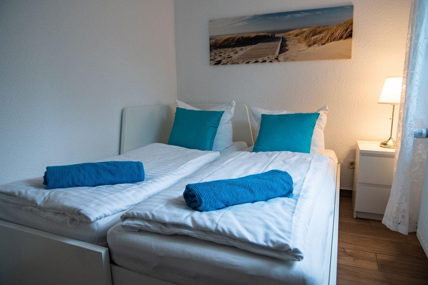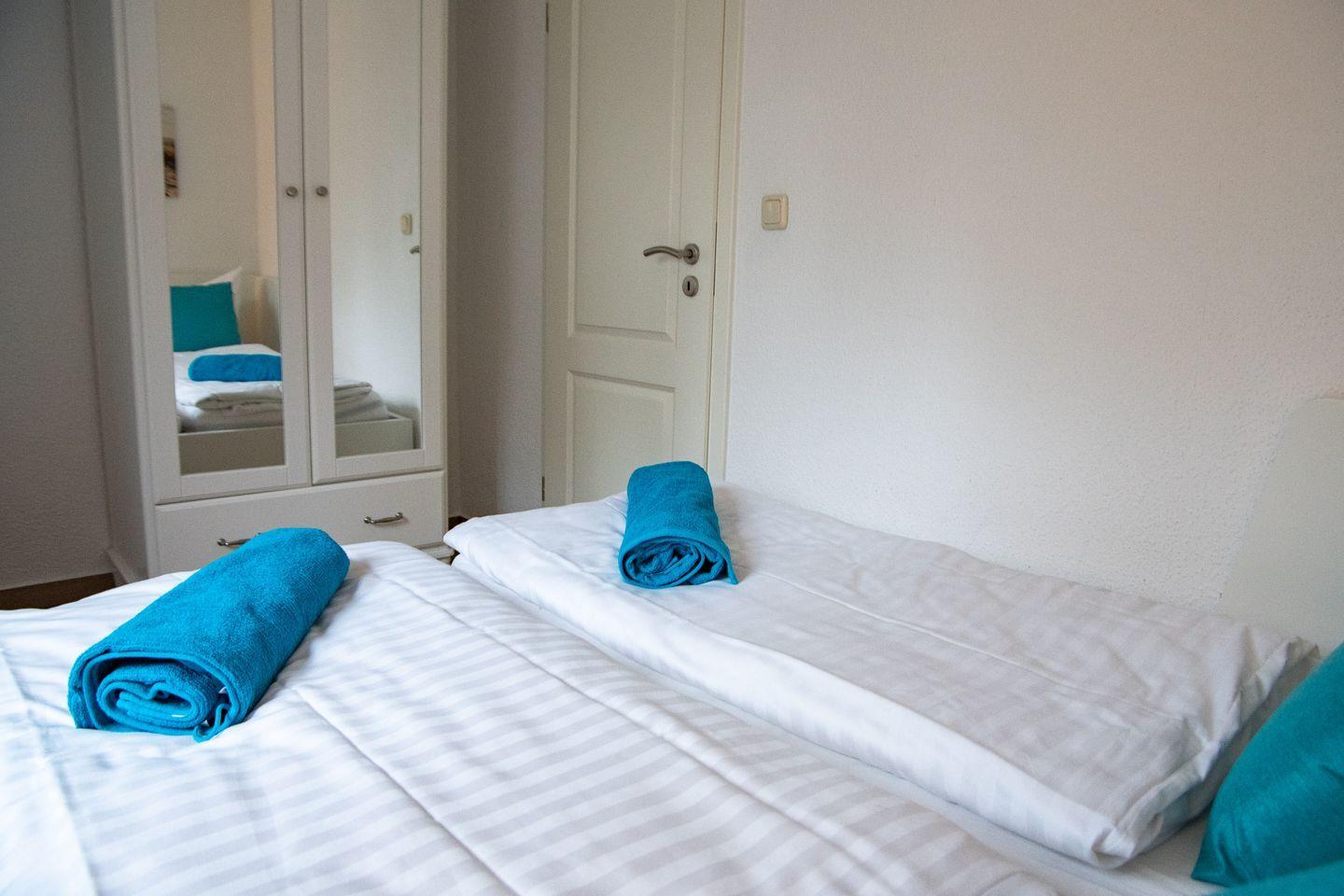 60qm große Ferienwohnung mit 2 separaten Schlafzimmern. Das große Schlafzimmer ist mit einem Doppelbett ausgestattet, im zweiten Schlafzimmer befindet sich ein