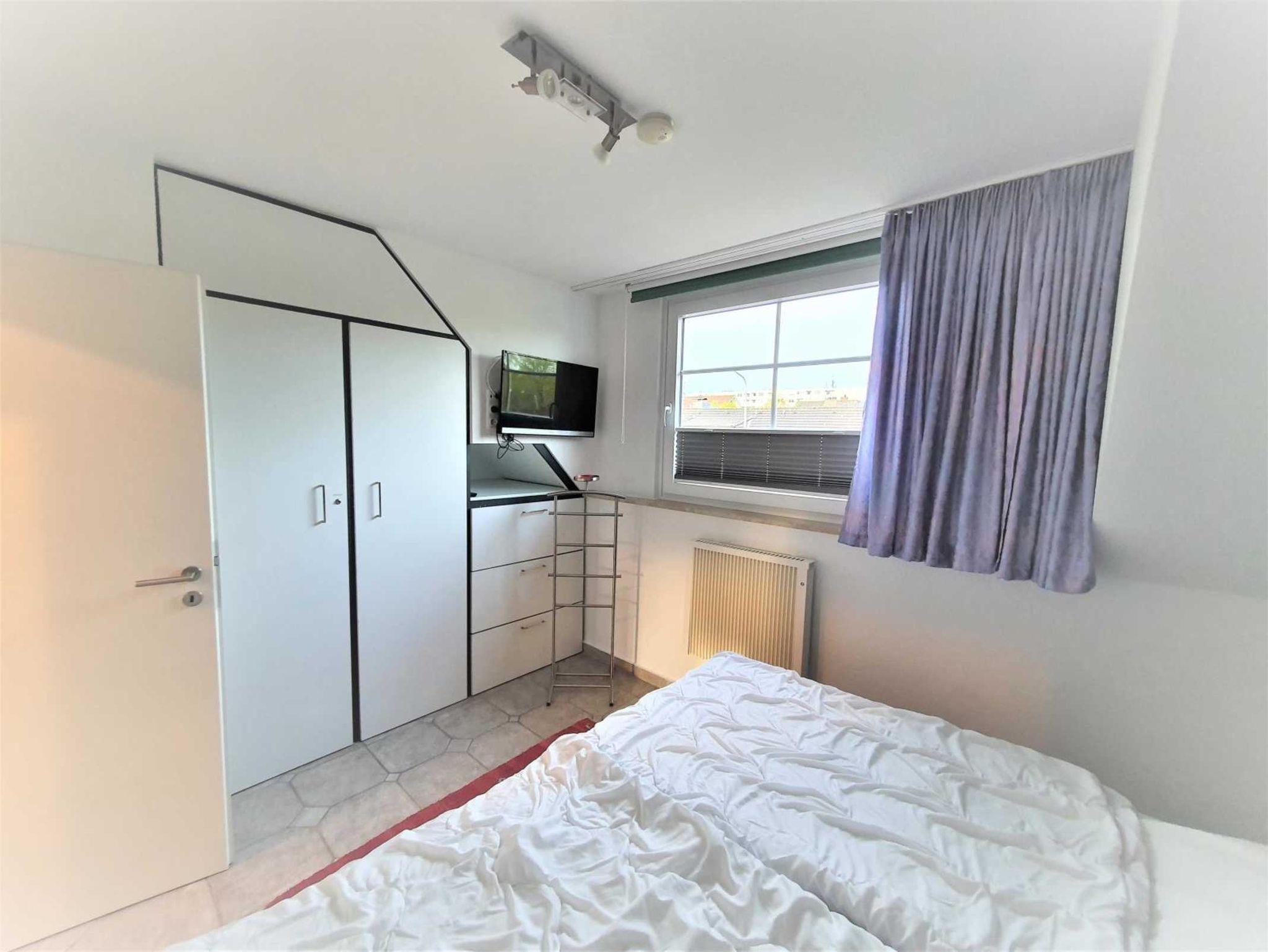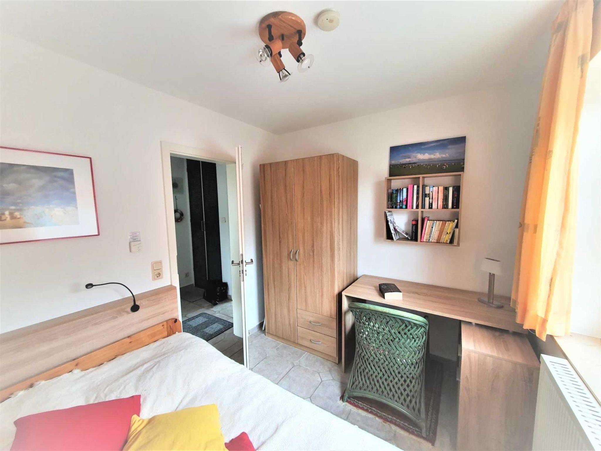 Das zweiteSchlafzimmer hat ein Doppelbett (140 cm x 200 cm) mit einer durchgehenden Matratze, einen Schrank und eine kleine Sitz-/Spielecke.