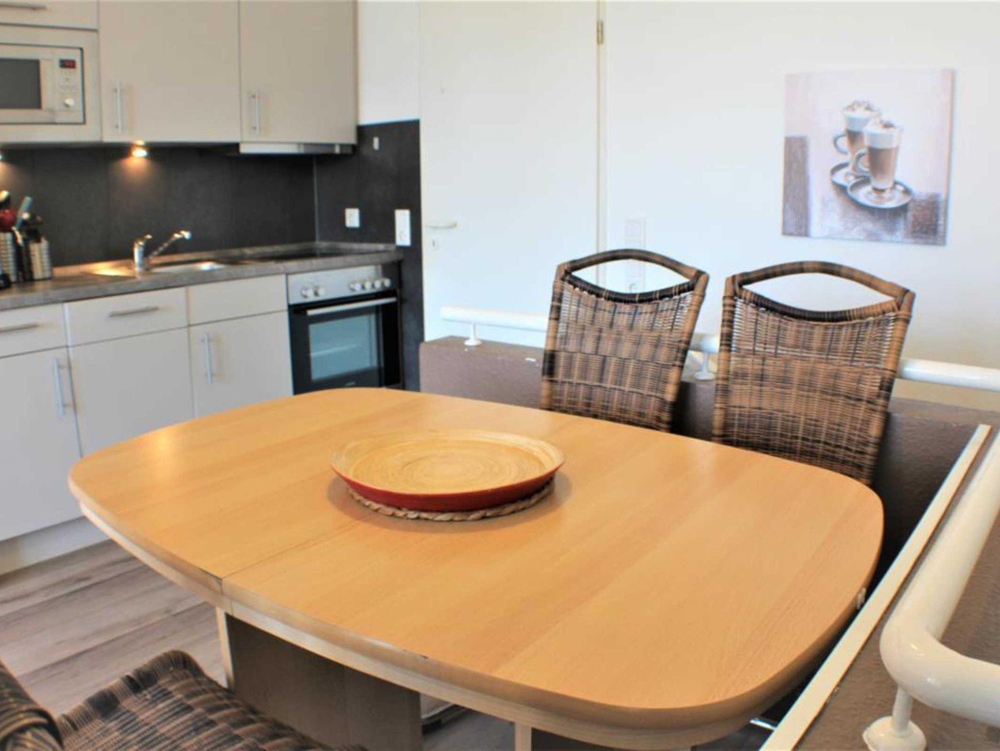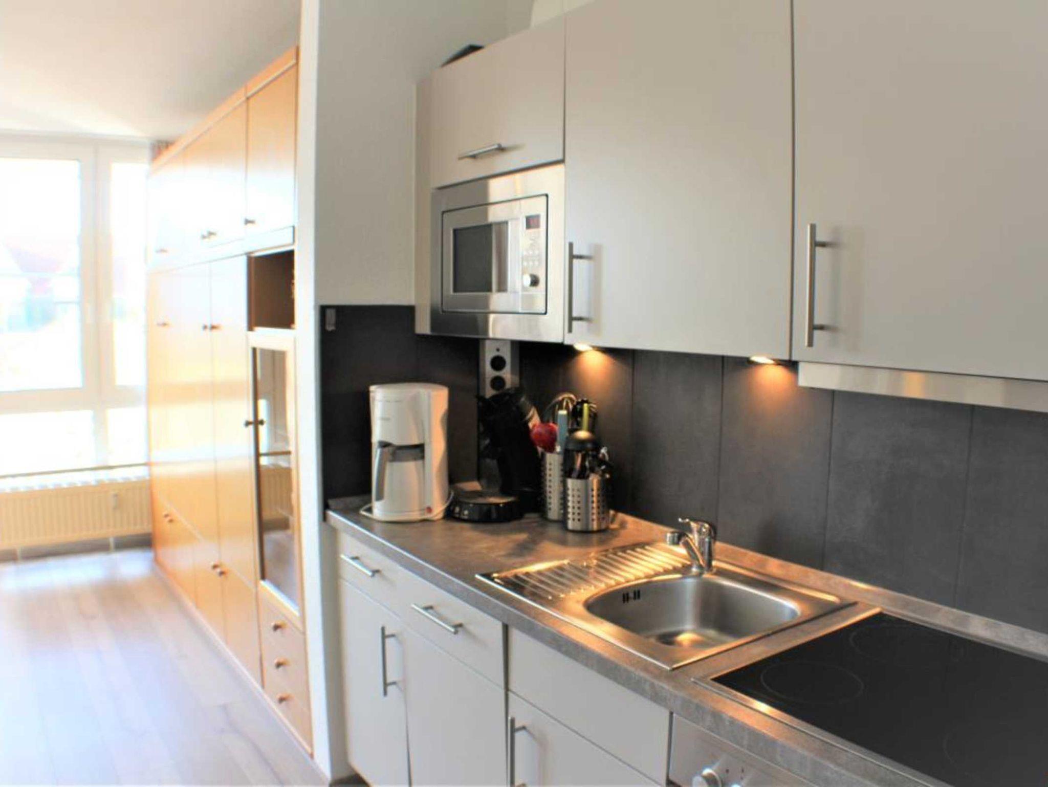 Die Essecke bietet Platz für bis zu 6 Personen und eine komplett ausgestattete Küchenzeile mit Herd (vier Kochfelder + Backofen), Mikrowelle, Geschirrspüler, Kühlschrank mit Gefrierfach, Kaffeemaschine (Standard und Senseo/Kaffeepads), Toaster, Wasserkocher, Geschirr usw. lädt zum Kochen ein.