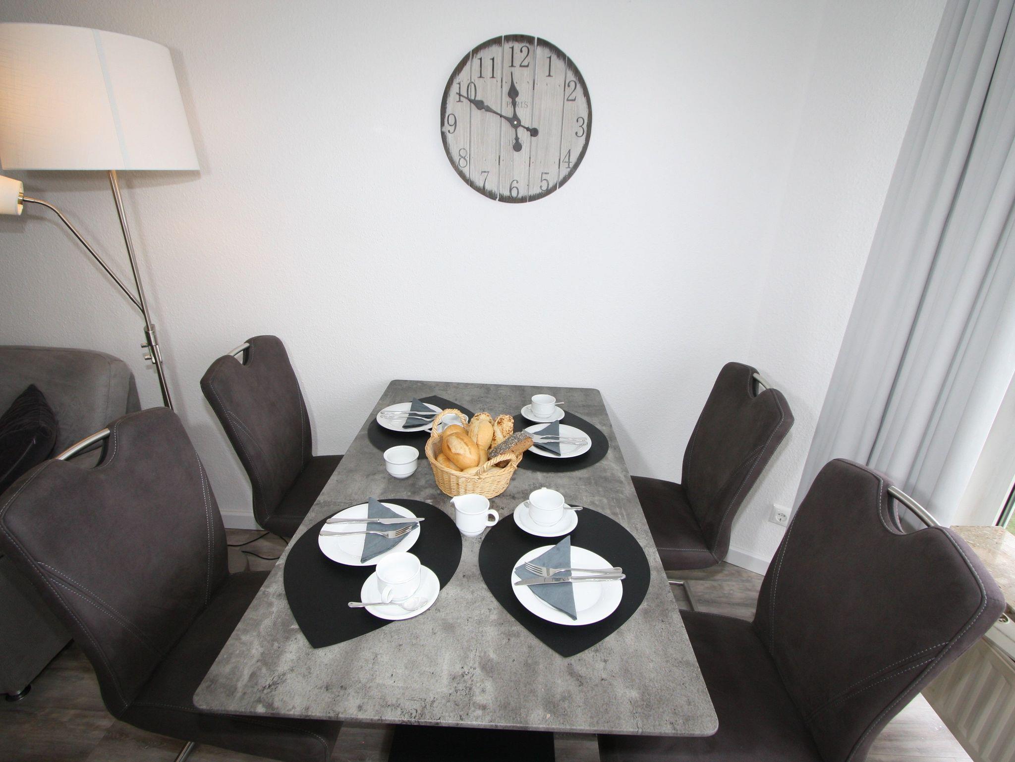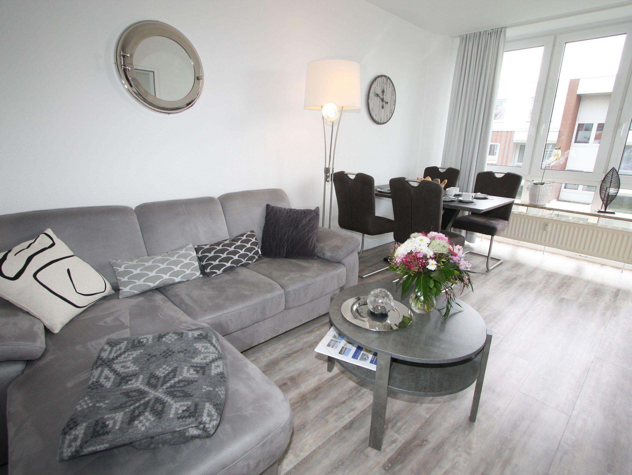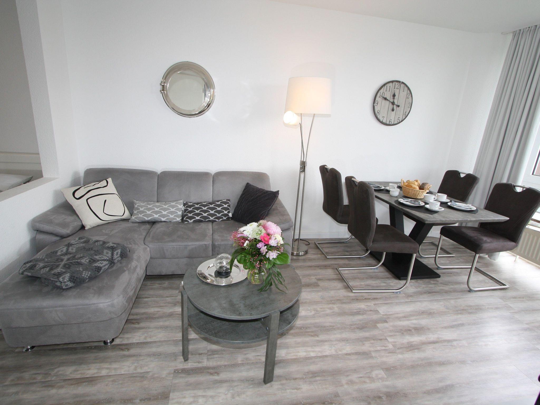 Sie erwartet ein großer und heller Wohn-/Schlafraum mit zwei hochwertigen Einzelbetten. Die neuwertige und bequeme Clubgarnitur, der separate Essplatz im Esserker und der voll ausgestattete Küchenbereich mit Mikrowelle, Geschirrspüler und Backofen runden den Komfort ab.