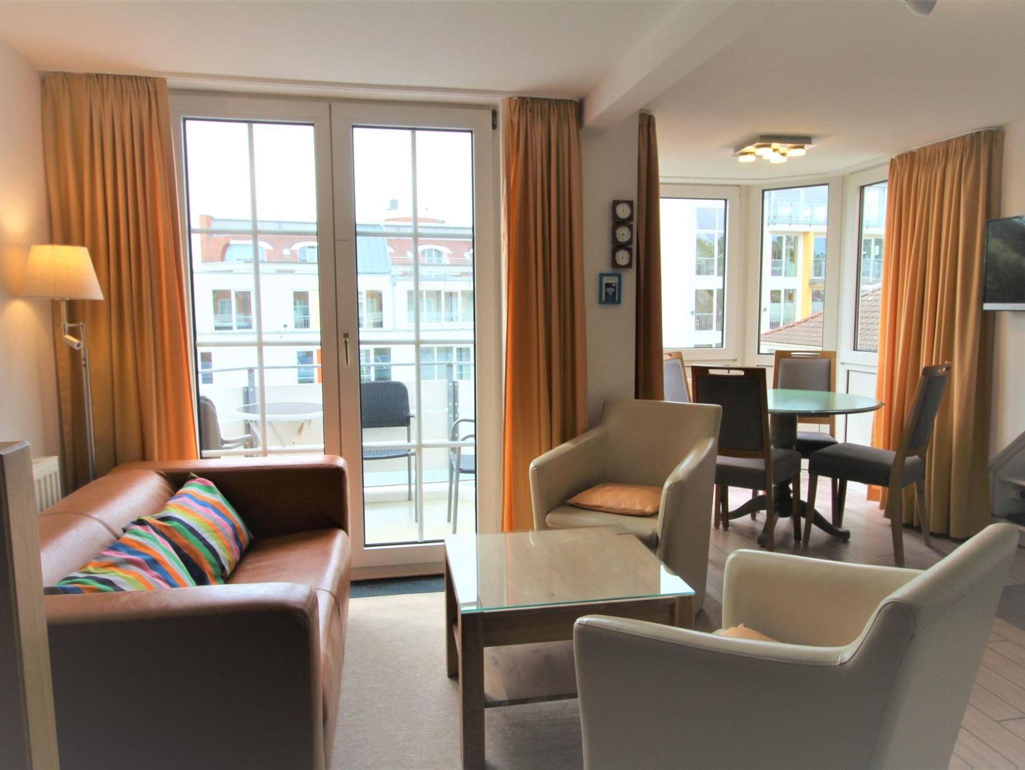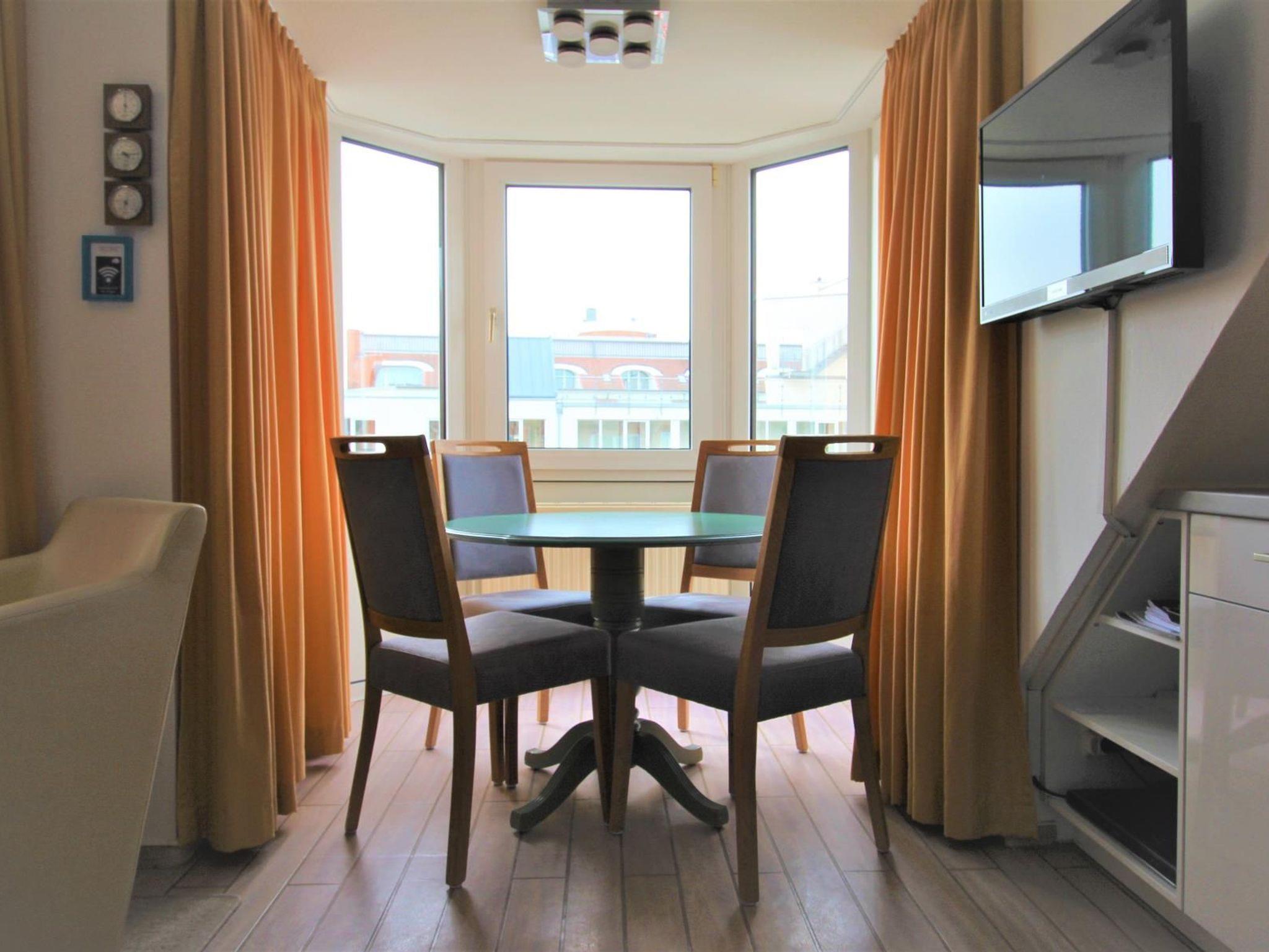 2-Zimmer-Appartement für bis zu 4 Personen auf ca. 40-45 m². Schlafzimmer mit Balkon und Doppelbett, Wohn-Schlafraum mit Balkon und bequemer Doppelbettcouch, TV, separatem Essplatz im Erker und voll ausgestattetem Küchenbereich. Bad mit Dusche/WC. WLAN und PKW-Stellplatz vorhanden.