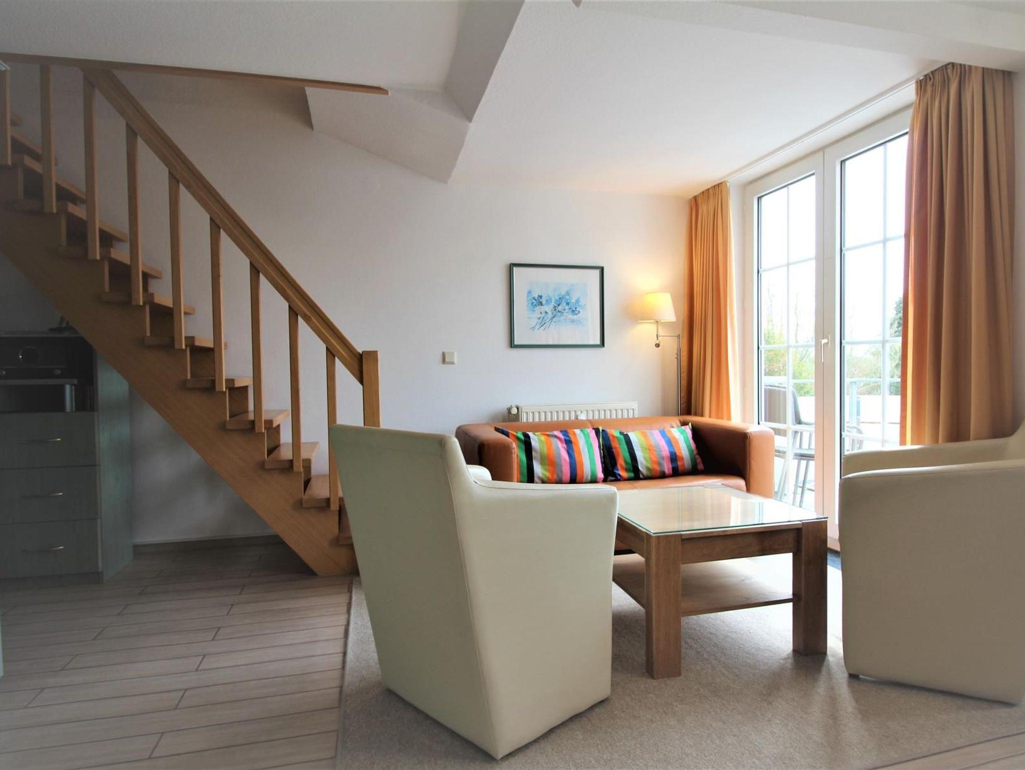 Sie wohnen in einem sehr schönen Appartement mit drei Zimmern über zwei Etagen. Im Dachgeschoss gibt es einen Wohnraum mit bequemer Ledersitzgarnitur und mit einem durch Raumteiler abgetrennten Bereich mit zwei getrennten Betten.