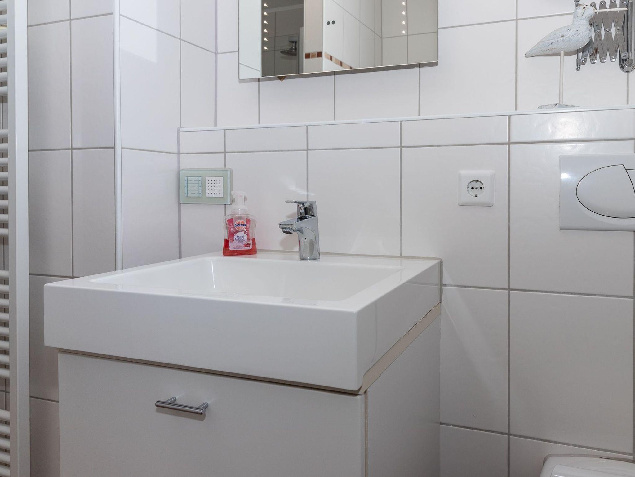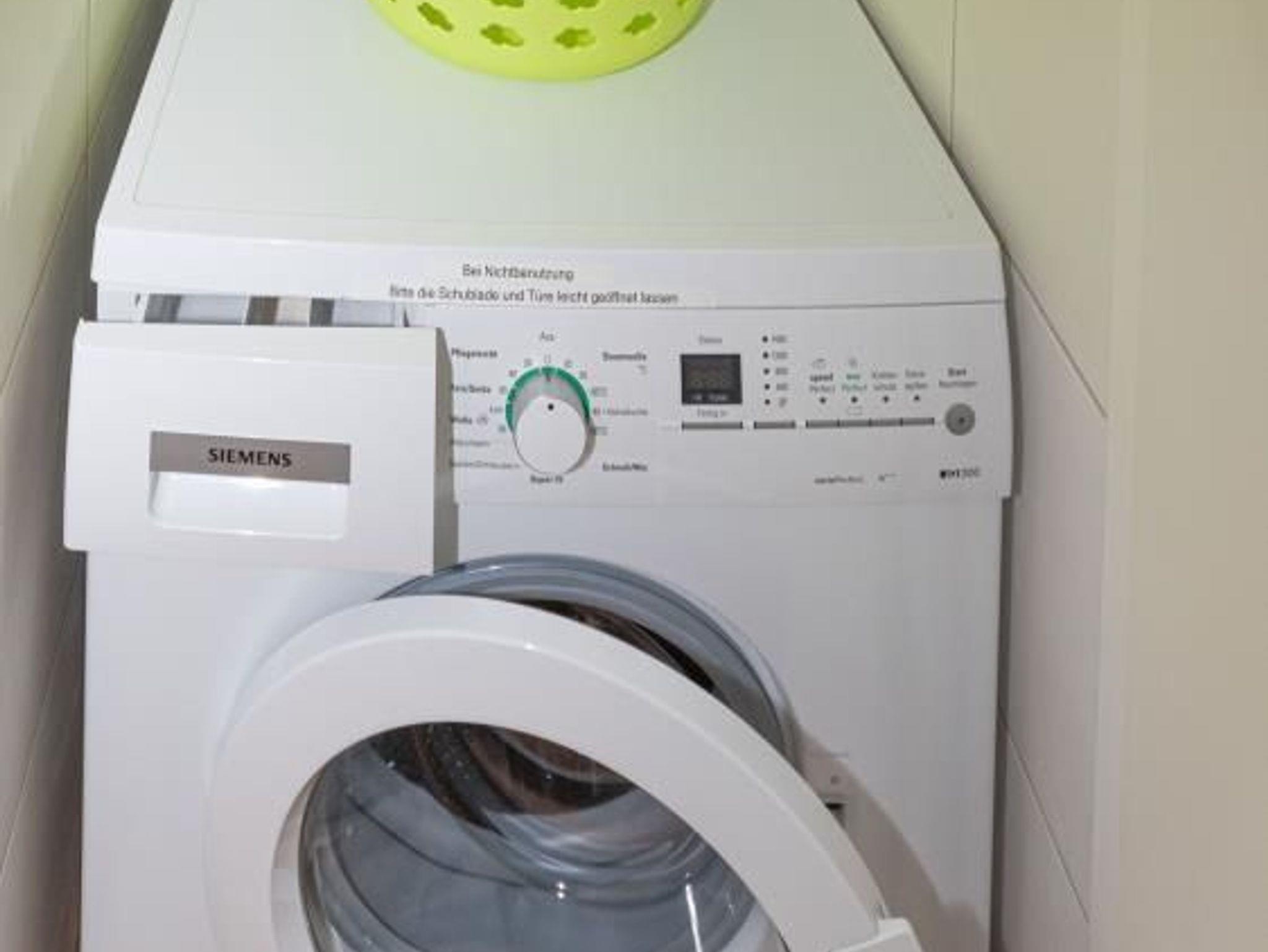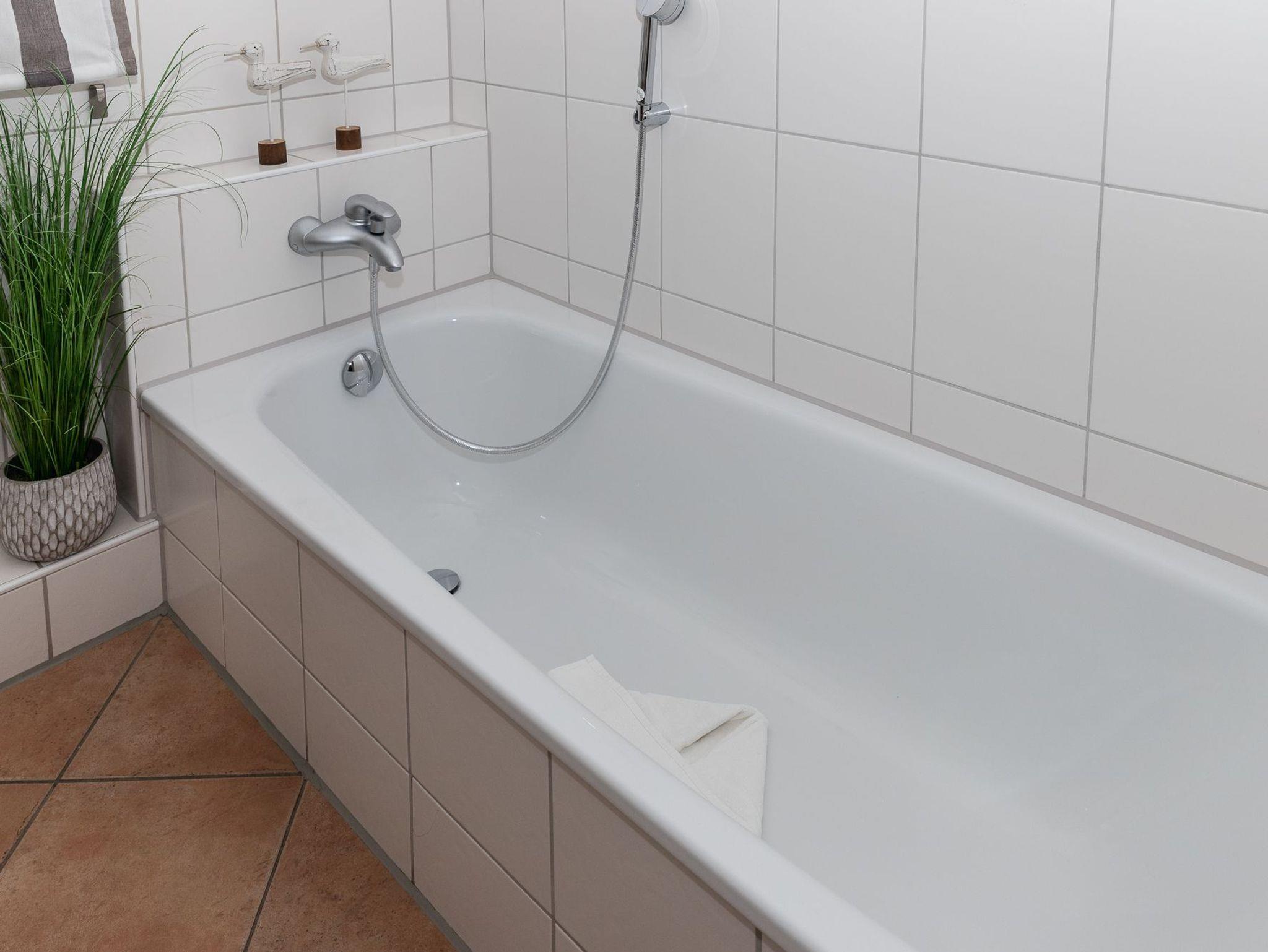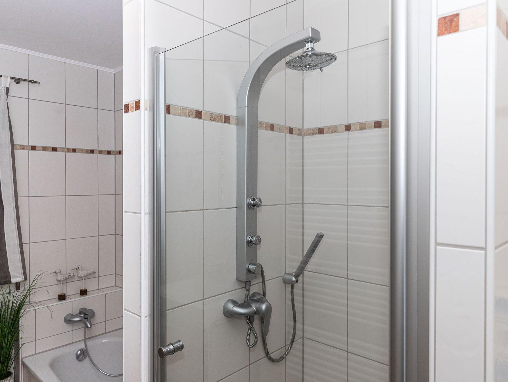 Das helle Badezimmer verfügt über Dusche, Badewanne, WC und Waschmaschine.