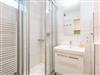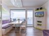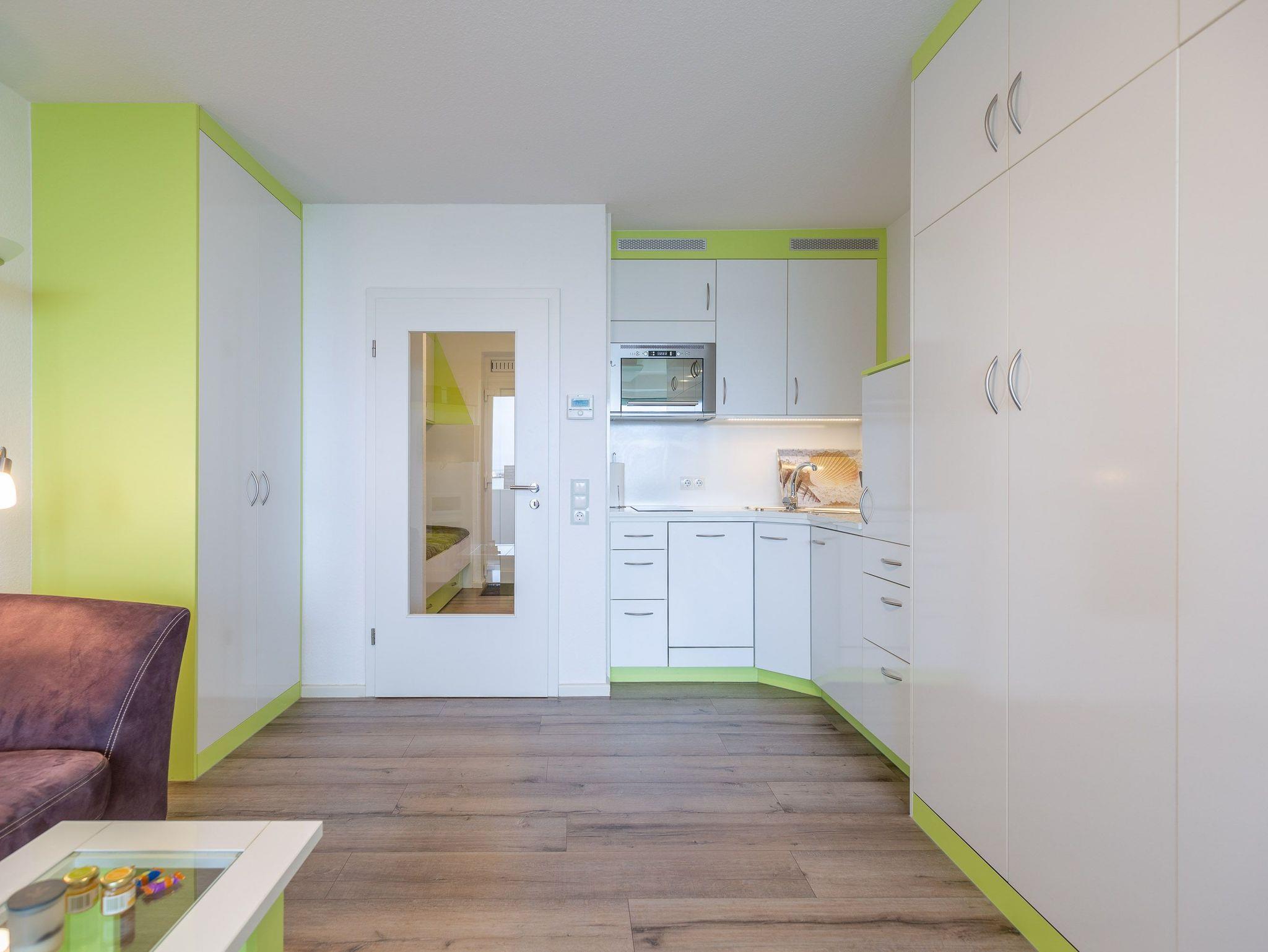 Die hochwertigen Schrankbetten lassen sich getrennt nutzen. Ein Etagenbett im Vorraum bietet eine vom Wohnbereich getrennte Schlafmöglichkeit. Eine integrierte Küche mit Geschirrspüler und ein Flachbildfernseher gehören zum Standard. Zur Wohnung gehört ein meerseitiger Balkon. Ferienwohnung 402 ist mit einem modernen Bad mit Dusche, WC und einem Fenster zum Belüften ausgestattet.