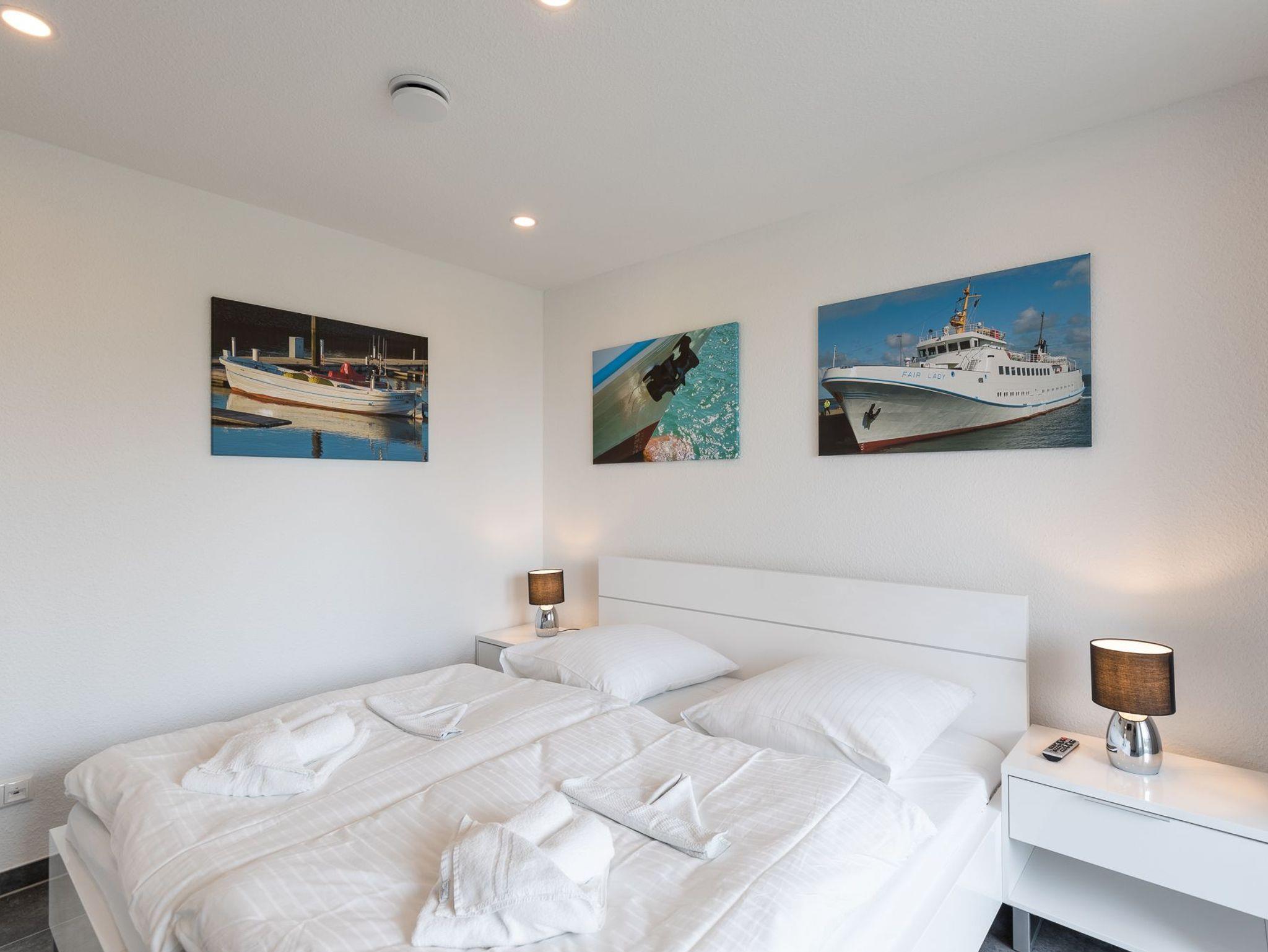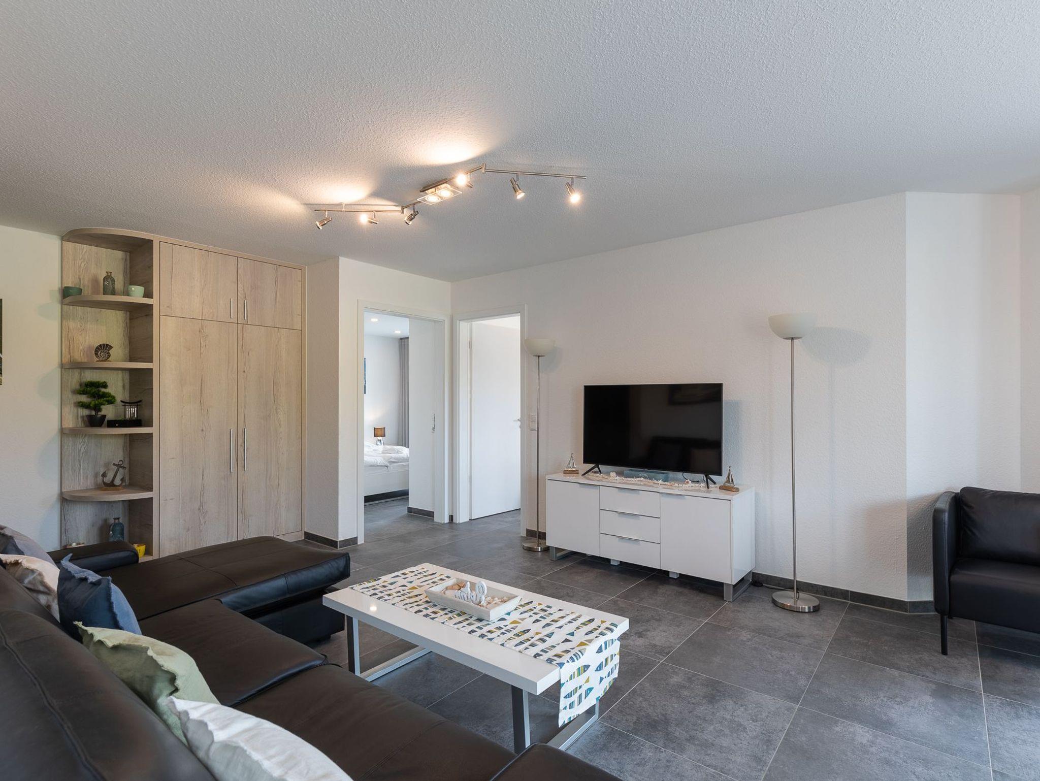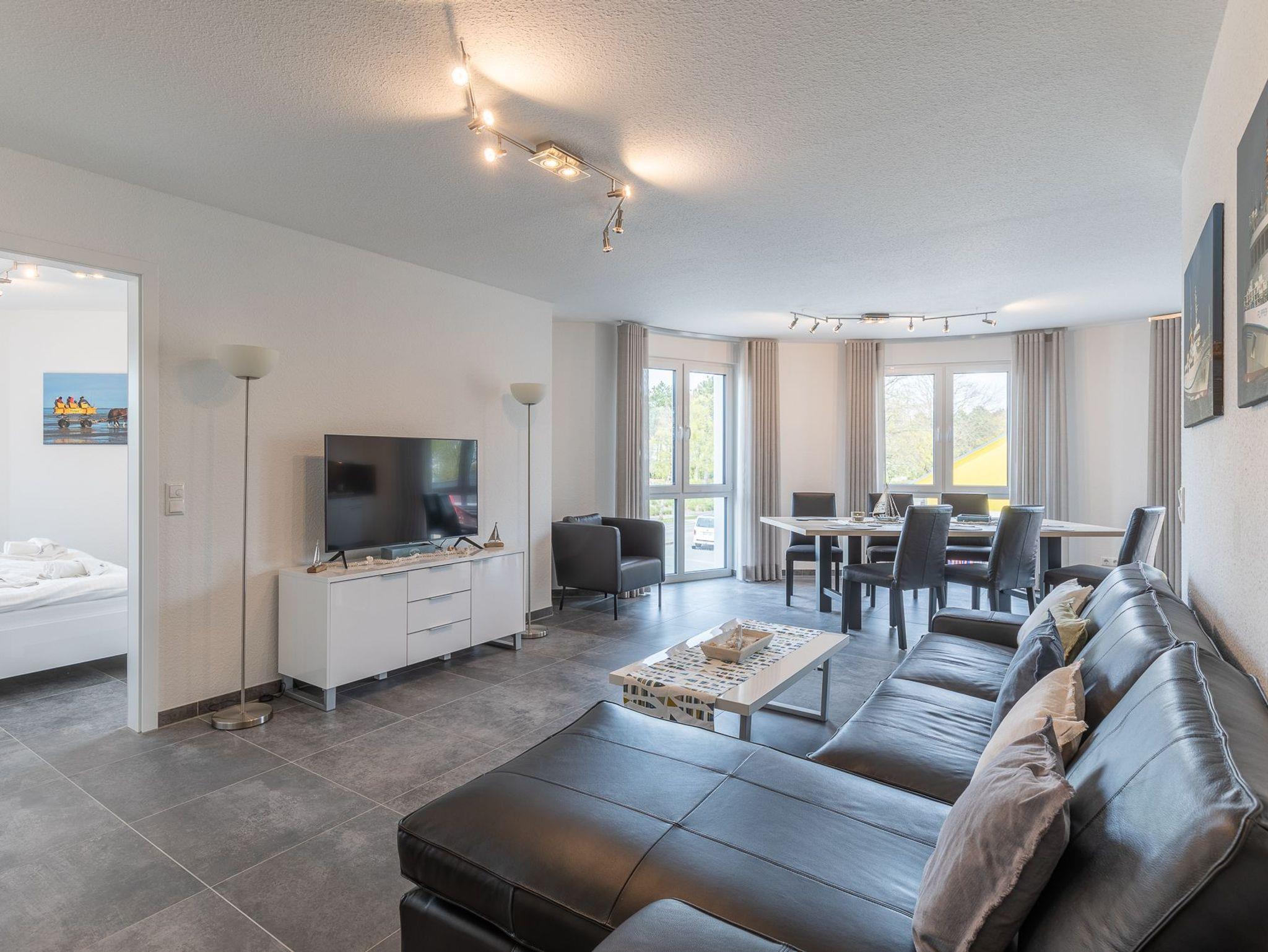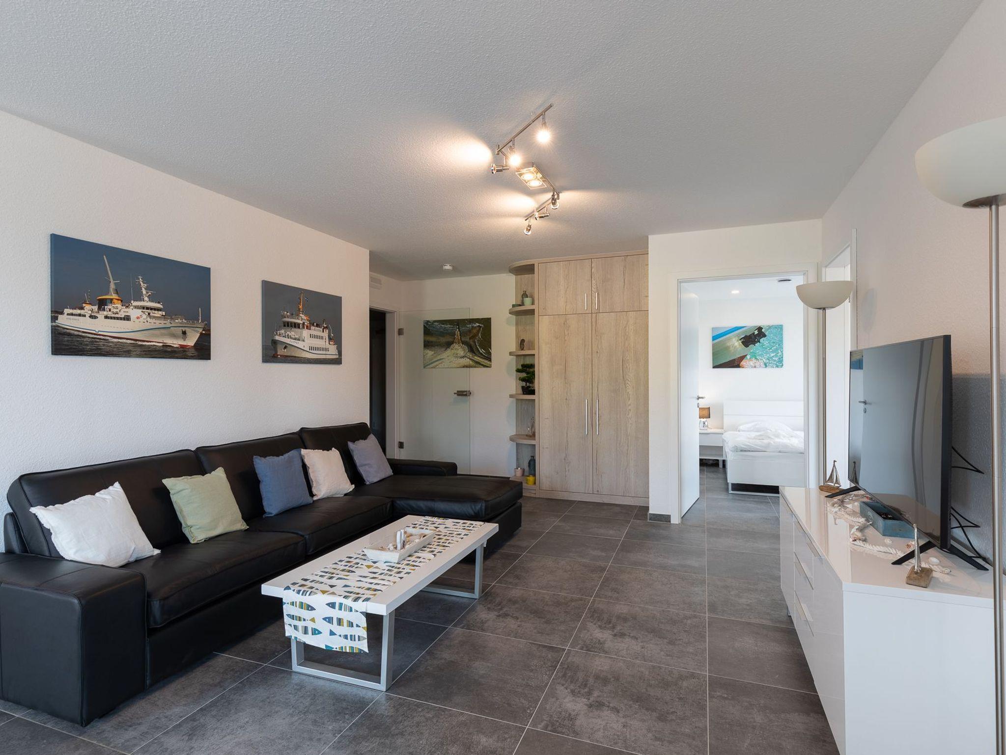 3 Zimmerwohnung mit ca. 90 m² im 1. Obergeschoss für bis zu 4 Personen. 2 Schlafzimmer mit Doppelbett (200 x 180) und TV, 1 Wohnzimmer mit Essplatz, TV Anlage, hochwertige Küche mit Cerankochfeld, Backofen, Geschirrspüler, Kühlschrank mit Gefrierfach, Toaster, Wasserkocher und allem was zur Küche gehört, 1 Duschbad mit ebenerdiger Dusche, Waschbecken, 1 Gäste WC, Lüftungsanlage mit Fußbodenheizung in allen Räumen, 1 Balkon mit Stühlen, Tisch und einer Teilseesicht, Videosprechanlage, Rauchmelder in allen Räumen, 1 Tiefgaragenstellplatz im Haus. Das Haus verfügt über einen Fahrstuhl.