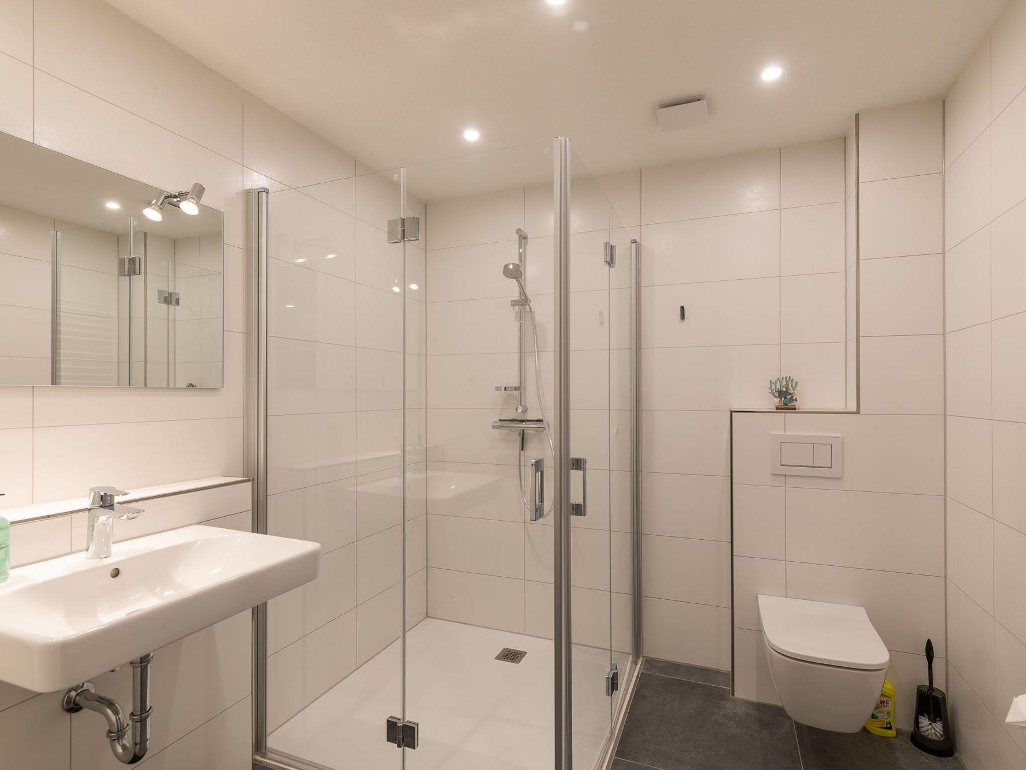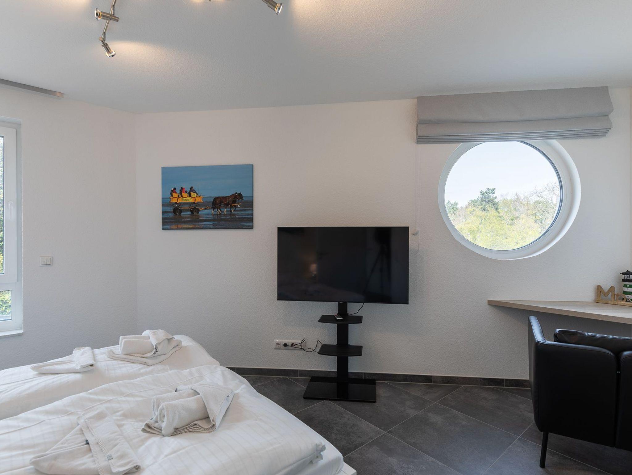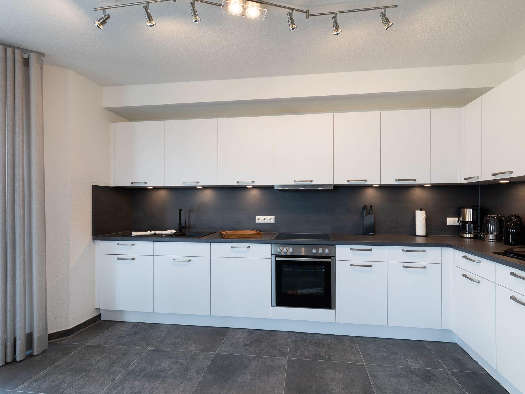 3 Zimmerwohnung mit ca. 90 m² im 1. Obergeschoss für bis zu 4 Personen. 2 Schlafzimmer mit Doppelbett (200 x 180) und TV, 1 Wohnzimmer mit Essplatz, TV Anlage, hochwertige Küche mit Cerankochfeld, Backofen, Geschirrspüler, Kühlschrank mit Gefrierfach, Toaster, Wasserkocher und allem was zur Küche gehört, 1 Duschbad mit ebenerdiger Dusche, Waschbecken, 1 Gäste WC, Lüftungsanlage mit Fußbodenheizung in allen Räumen, 1 Balkon mit Stühlen, Tisch und einer Teilseesicht, Videosprechanlage, Rauchmelder in allen Räumen, 1 Tiefgaragenstellplatz im Haus. Das Haus verfügt über einen Fahrstuhl.