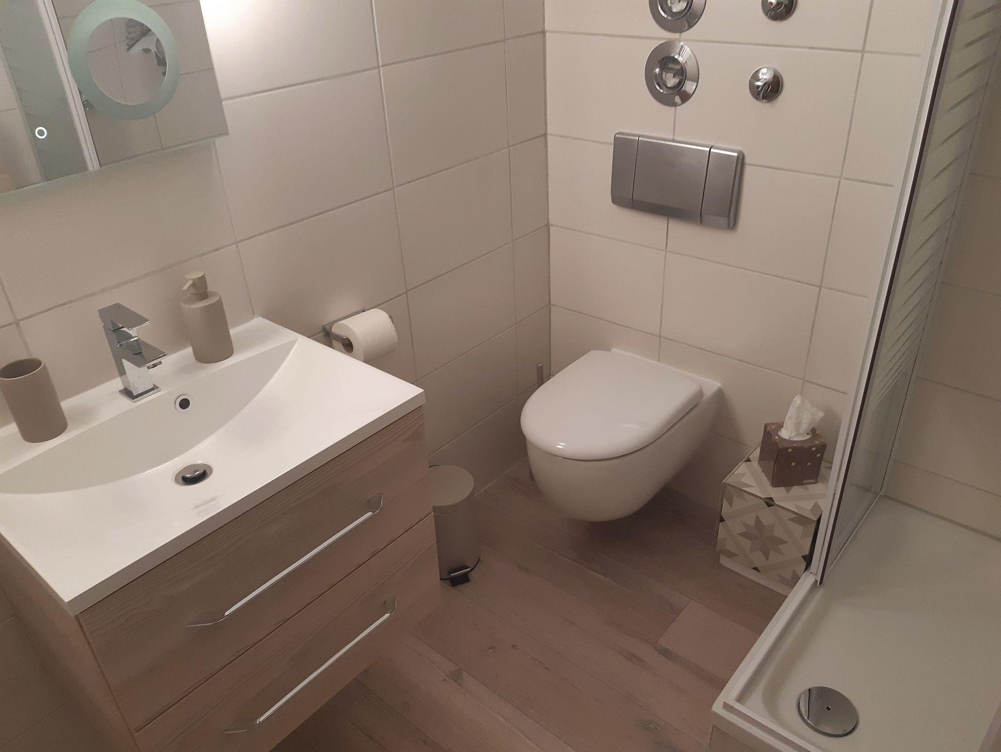 • Neues Bad mit vielen Ablagemöglichkeiten und Föhn