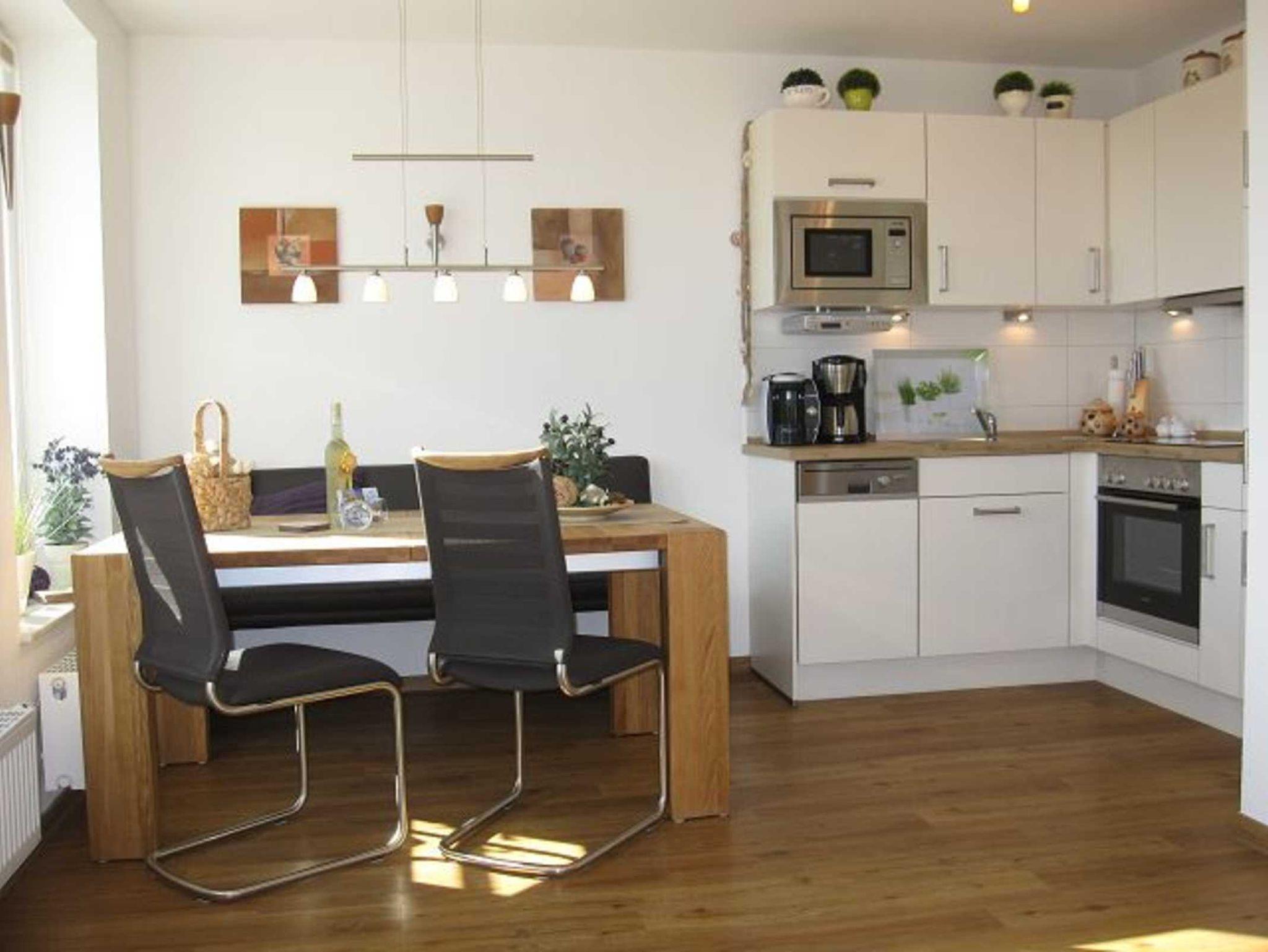 * separater Essplatz mit bequemer Lederbank und Schwingstühlen für bis zu 6 Personen großzügig ausgestattet, voll ausgestatteter Küchenbereich mit Geschirrspüler, Mikrowelle, Cerankochfeld mit Backofen, Kühlschrank mit Gefrierfach, Küchenradio mit CD