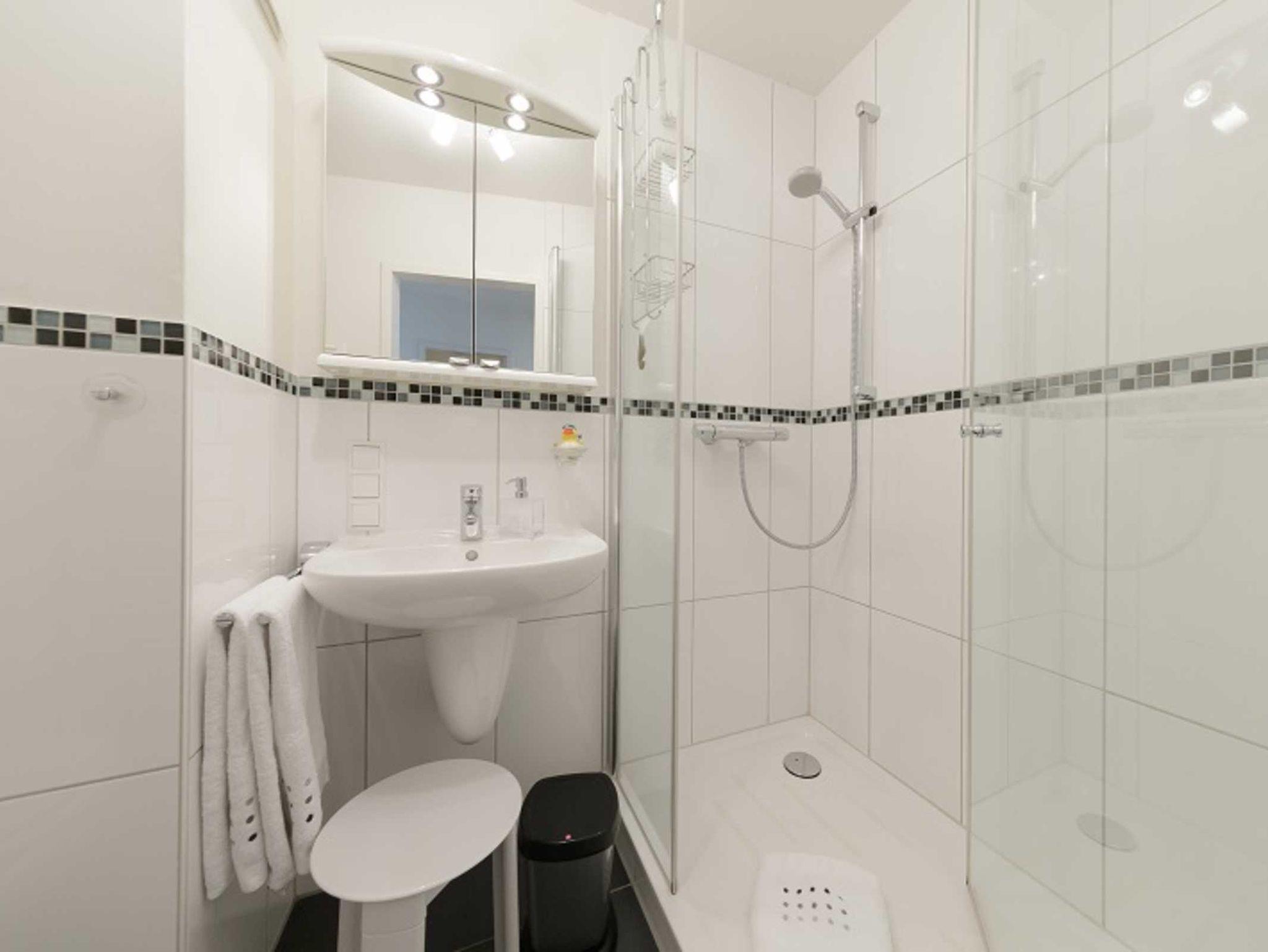 Das Badezimmer ist u. a. ausgestattet mit einer 140 cm x 75 cm x 2,5 cm großen Duschwanne. Die Duschkabine ist 2 m hoch und besteht aus klarem Sicherheitsglas mit nach innen und außen zu öffnender Pendeltür.