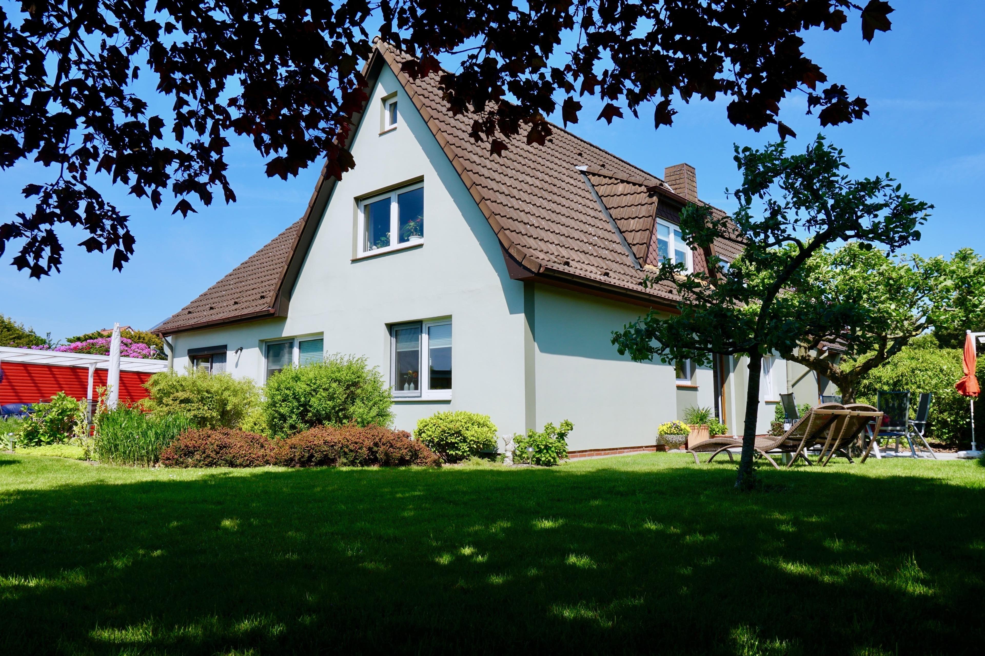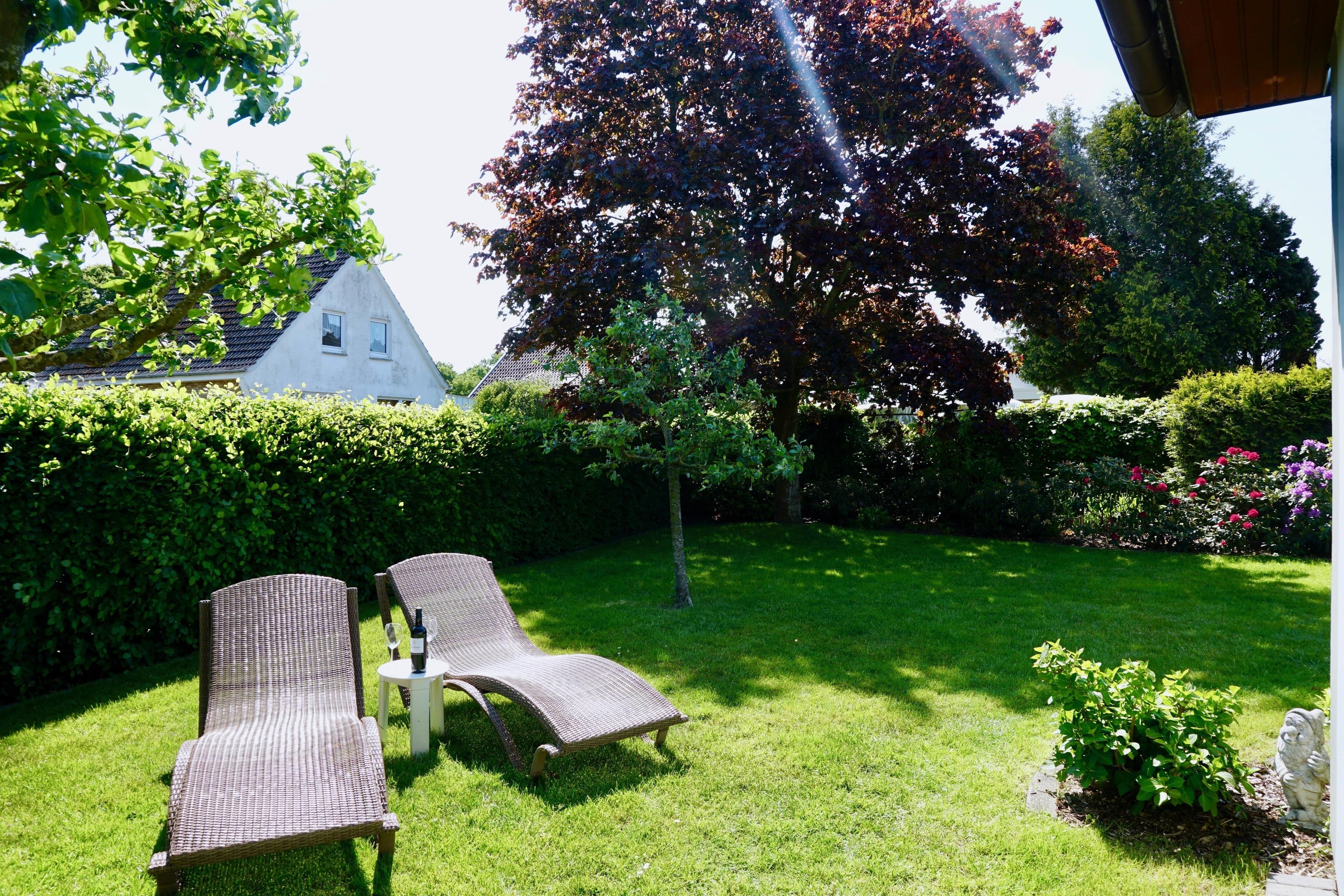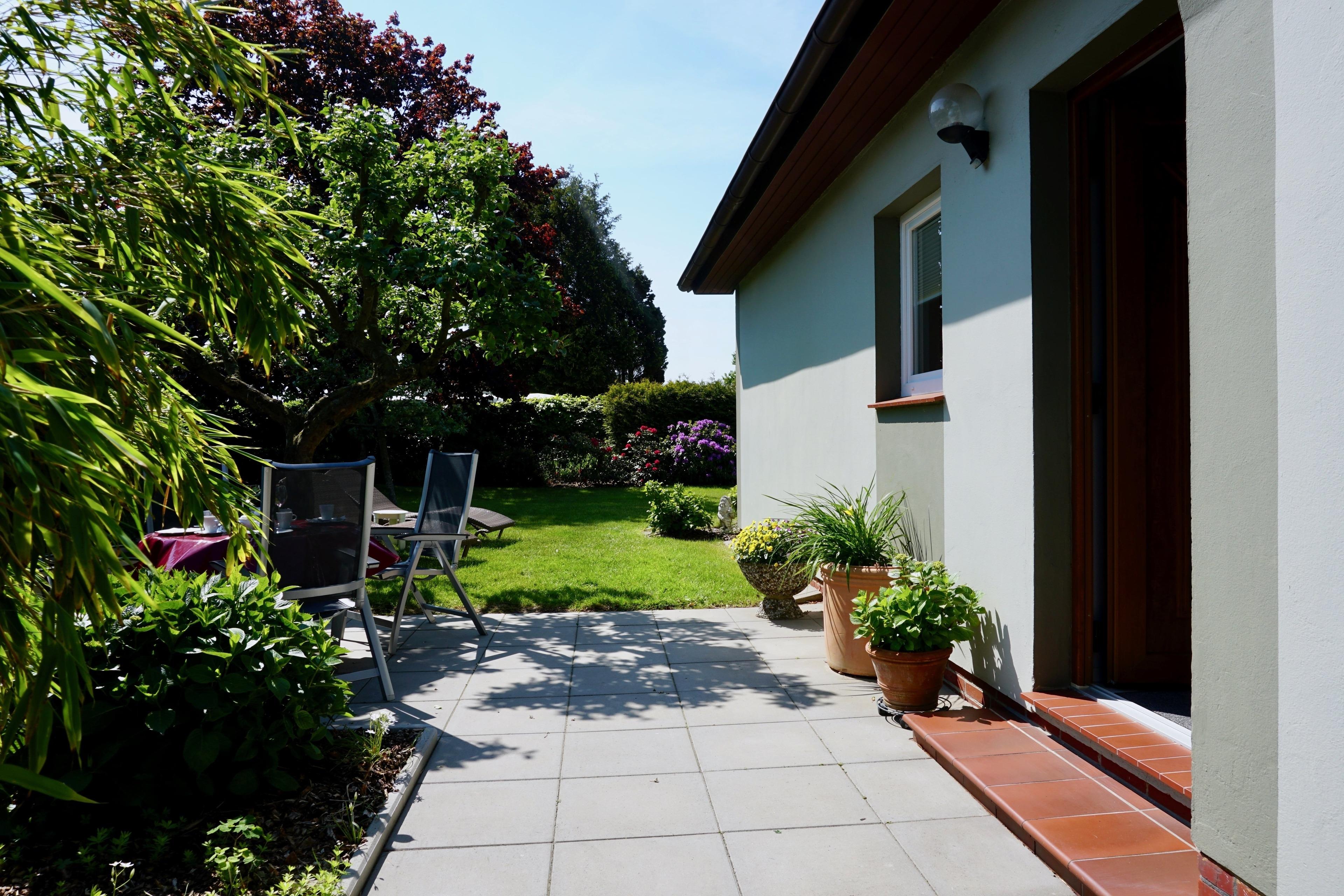 Die zentral gelegene und ebenerdige Ferienwohnung hat über die schöne Terrasse einen Zugang zum Garten. Nehmen Sie also Platz und genießen Sie den Ausblick ins Grüne. Der Garten ist zudem mit einer Sichtschutzhecke eingefasst, und der schöne Busch- und Baumbestand verspricht Entspannung pur.