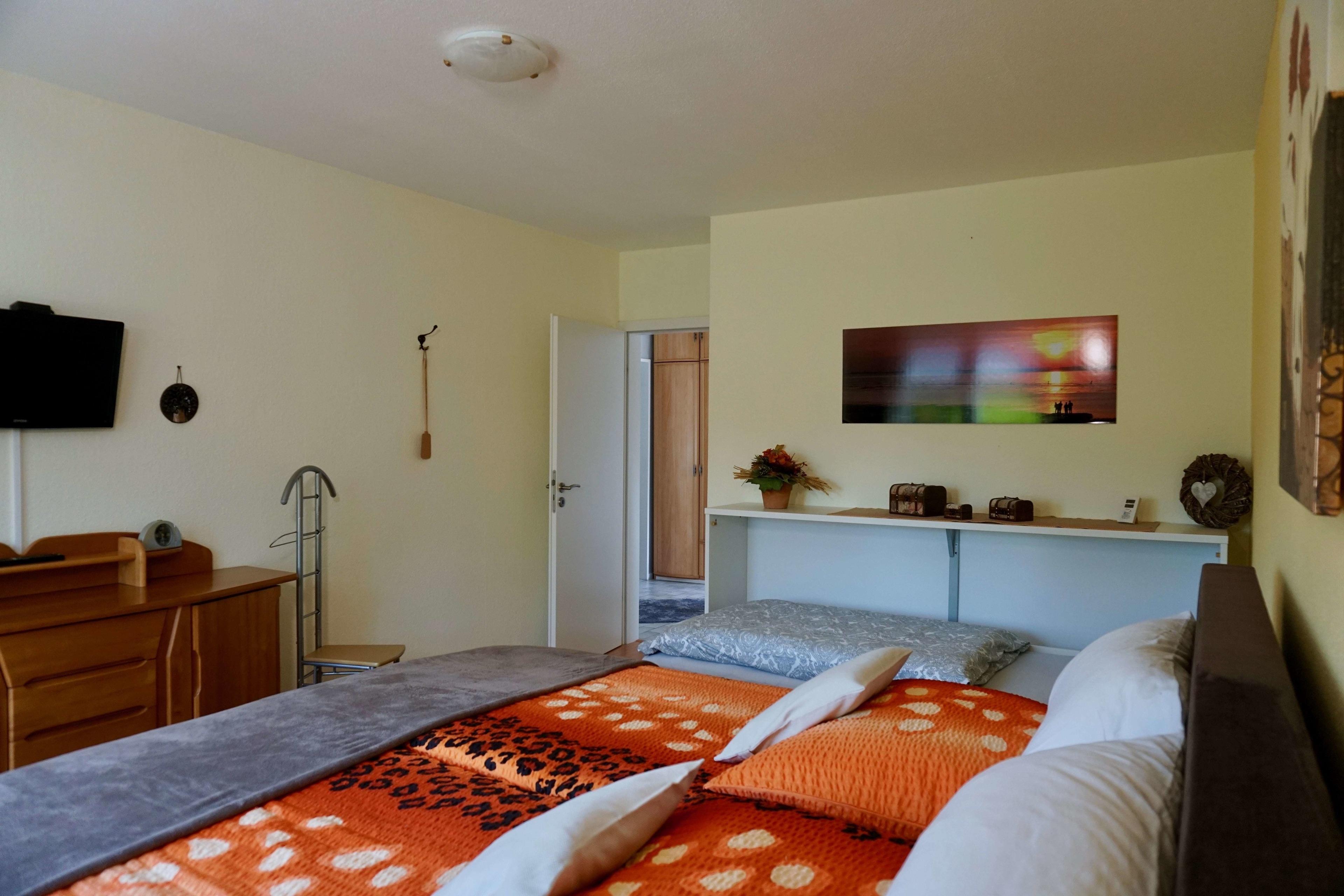 Die mit WLAN ausgestattete Wohnung besteht aus einem Schlafzimmer mit gemütlichem Boxspringbett und einem zusätzlichen Schrankbett – von hier aus können Sie abends TV schauen und die schönen Erlebnisse des Tages Revue passieren lassen.