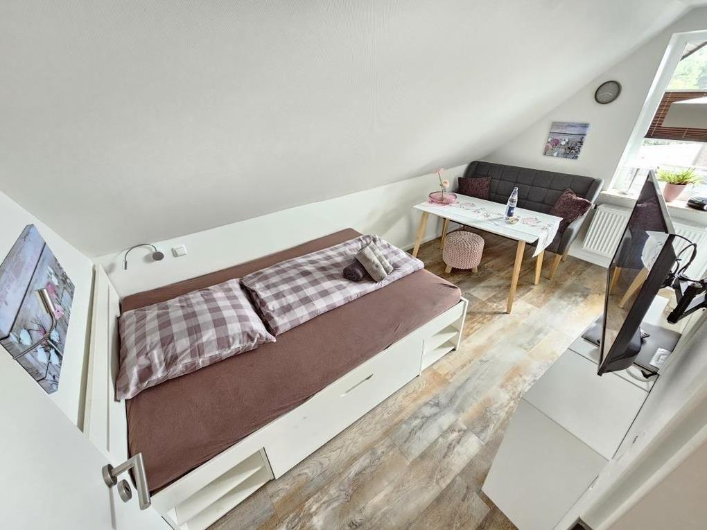 Den modernen Fernseher haben Sie sowohl vom Esstisch als auch aus dem gemütlichen Doppelbett im Blick. Die einladende Schlafstätte (140x200cm) lädt bis zu zwei Gäste zum Träumen ein.