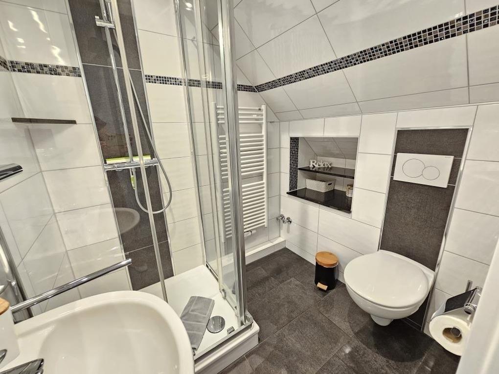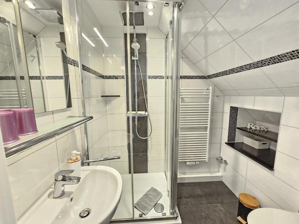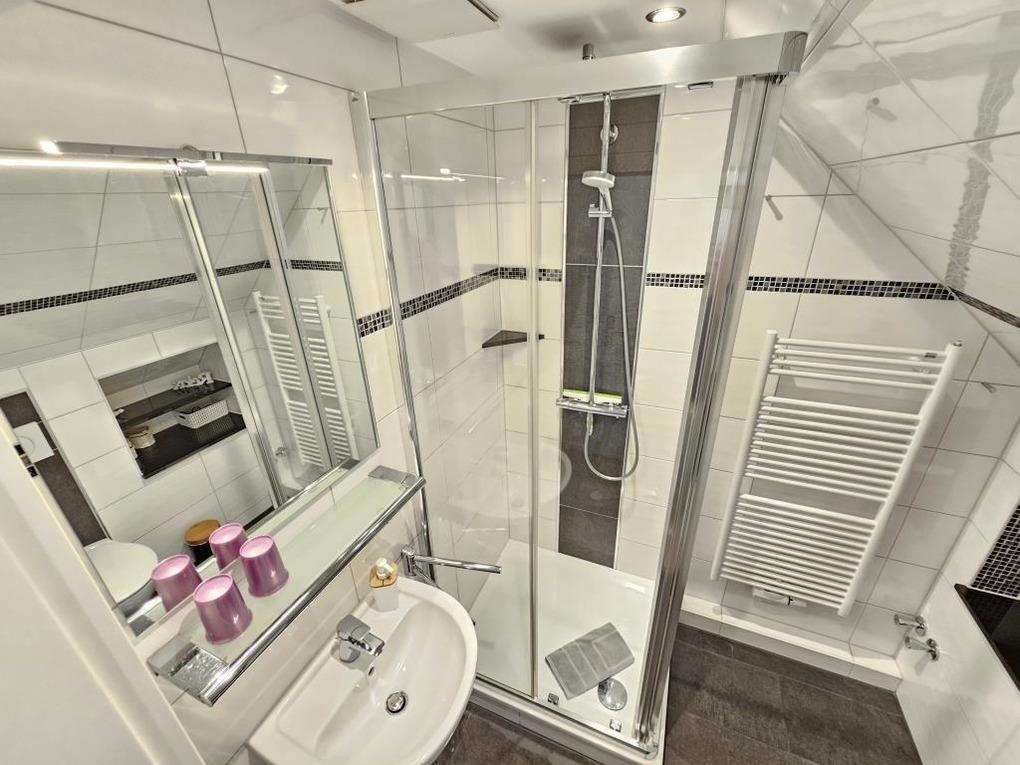 Das moderne Duschbad wurde durchdacht und großzügig gestaltet. Die schöne Dusche mit Regenduschkopf bietet Ihnen eine feste Kabine und eine Ablage. Weiterer Stauraum wurde geschickt in das Bad integriert. Waschbecken, Spiegel, Handtuchwärmer, Föhn und WC runden den hell gefliesten Raum stimmig ab.