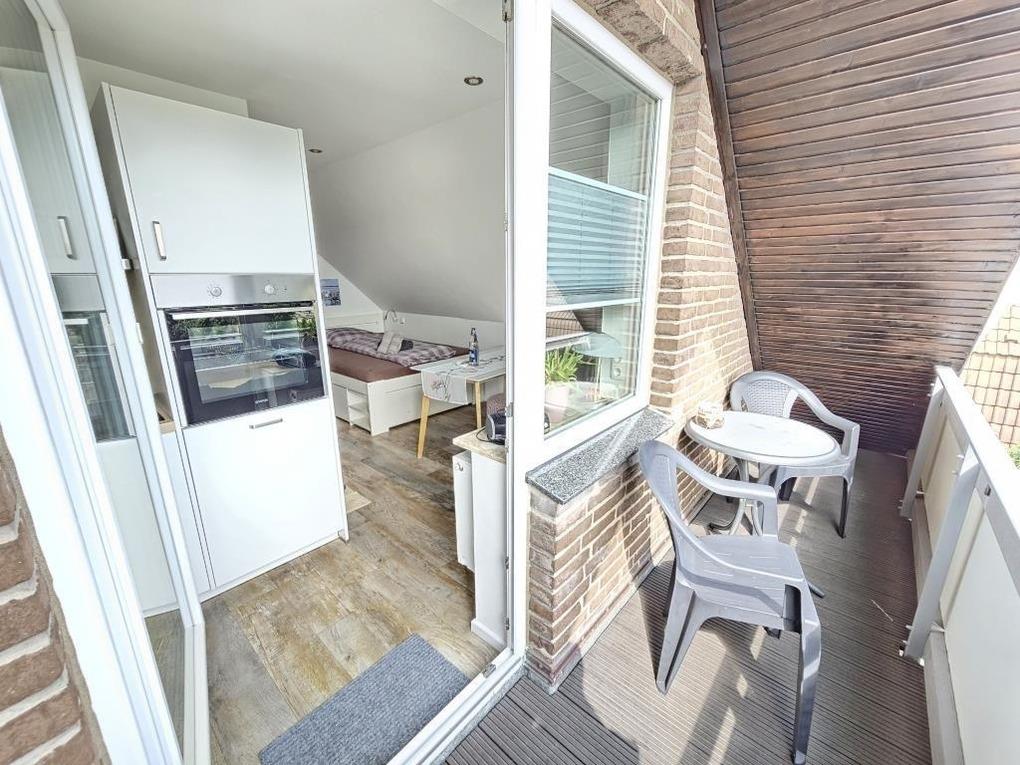 Zum Appartement gehört ein einladender, überdachter Balkon, welchen Sie vom Wohn- und Schlafzimmer aus betreten können. Balkonstühle stehen zur Verfügung, so dass Sie ganz entspannt an der frischen Nordseeluft verweilen können.