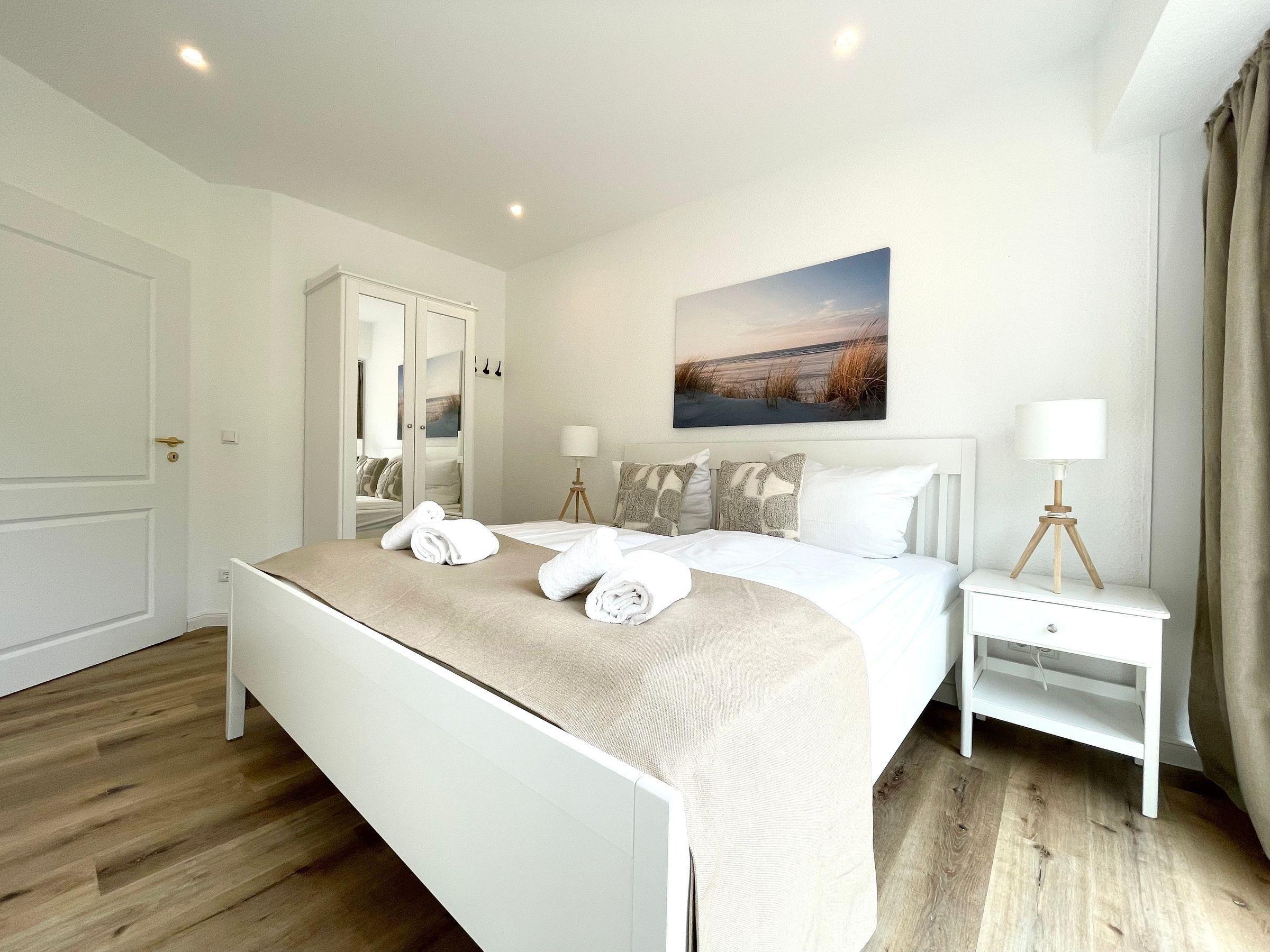 Die großzügige Ferienwohnung bietet Platz für bis zu 8 Personen und verfügt über 3 Schlafzimmer sowie ein komfortables Schlafsofa im Wohnzimmer. Zwei Schlafzimmer sind mit Doppelbetten (180 cm) ausgestattet, während das dritte Schlafzimmer ein Einzelbett (140 cm) bereithält. Die beiden Badezimmer, inklusive einer kleinen Wellness-Oase mit Whirlpool-Badewanne und Sauna, garantieren Entspannung pur. Die gut ausgestattete Küche bietet optimale Bedingungen für gemeinsame Kochabende. Im stilvoll eingerichteten Wohnzimmer mit großem Sofa lässt es sich gemütlich verweilen. Die Wohnung im Erdgeschoss gewährleistet einen barrierearmen Zugang und schafft mit großen Fenstern eine freundliche Atmosphäre. Gemeinschaftlich nutzbar sind Waschmaschinen, Trockner und ein Fahrradkeller im Haus. Ein kleiner Spielplatz für Kinder ist ebenfalls vorhanden. Ein Bäcker im Haus sorgt saisonal für frische Backwaren.