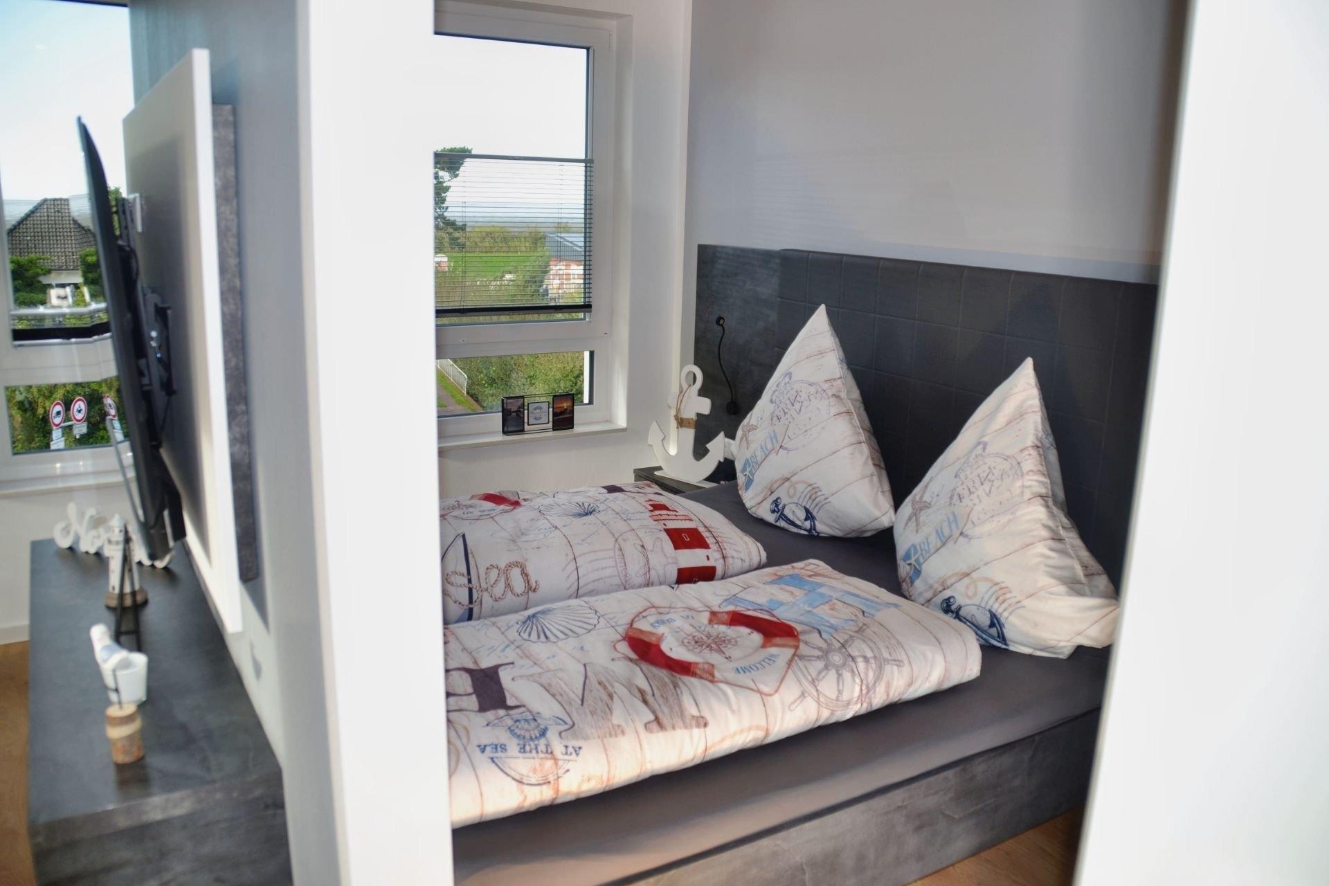 Das geschmackvoll eingerichtete Schlafzimmer ist mit einem komfortablen Doppelbett und einem Smart-TV ausgestattet und verspricht ruhige Nächte. Die elektronischen Außenrollos sorgen für Privatsphäre und eine angenehme Dunkelheit zum Schlafen. Das moderne Badezimmer mit Dusche rundet das Angebot ab und bietet zusätzlichen Komfort.