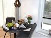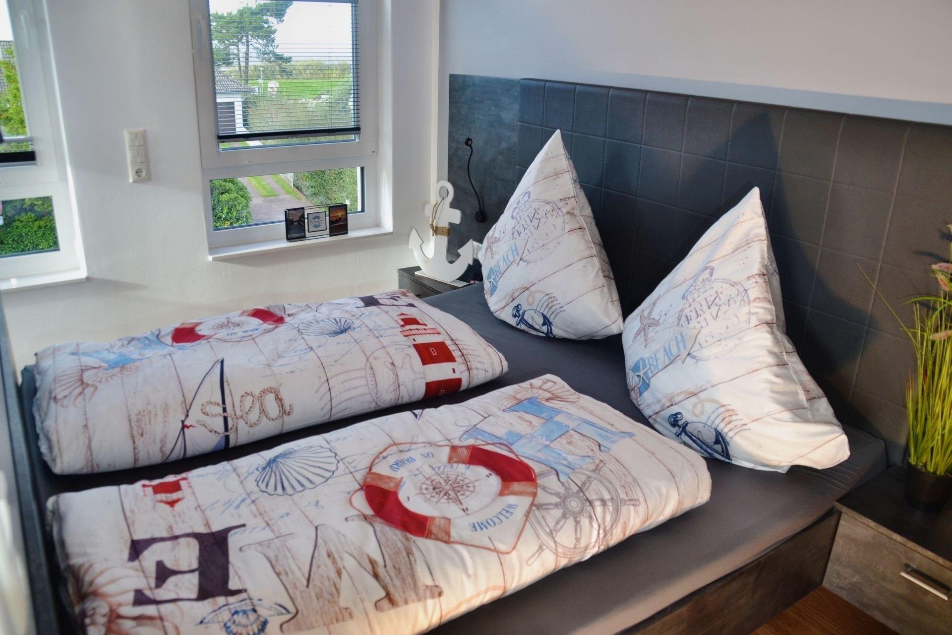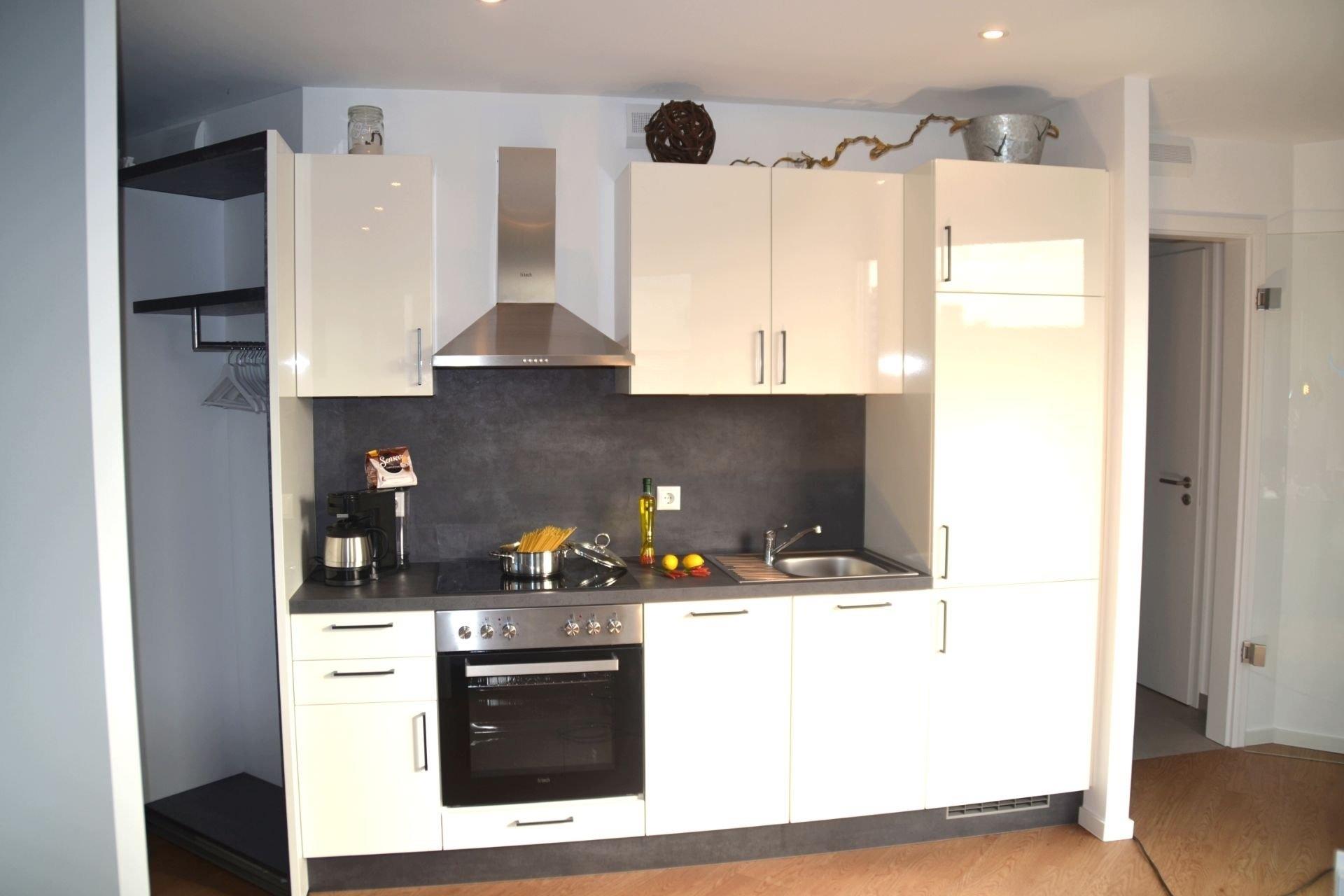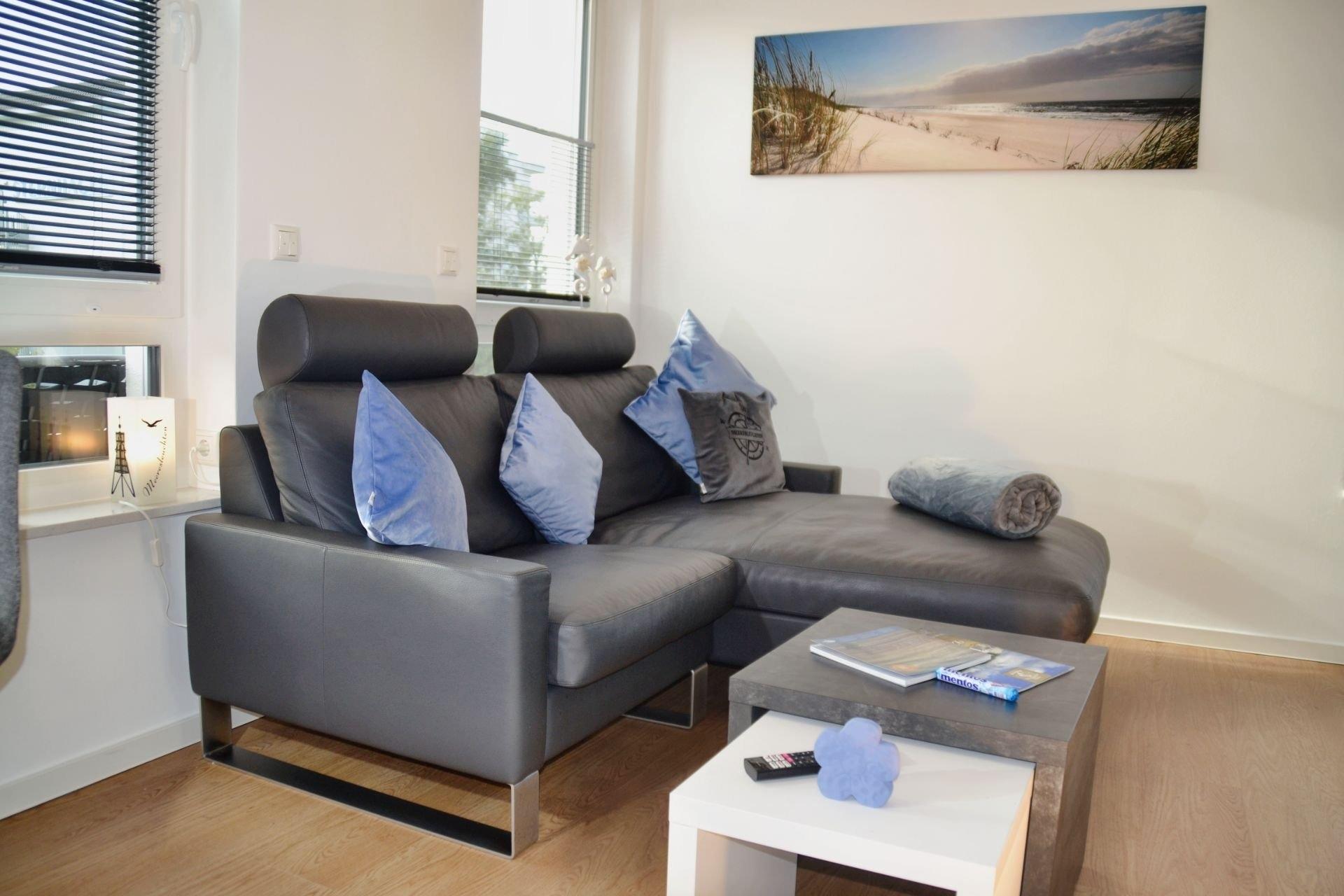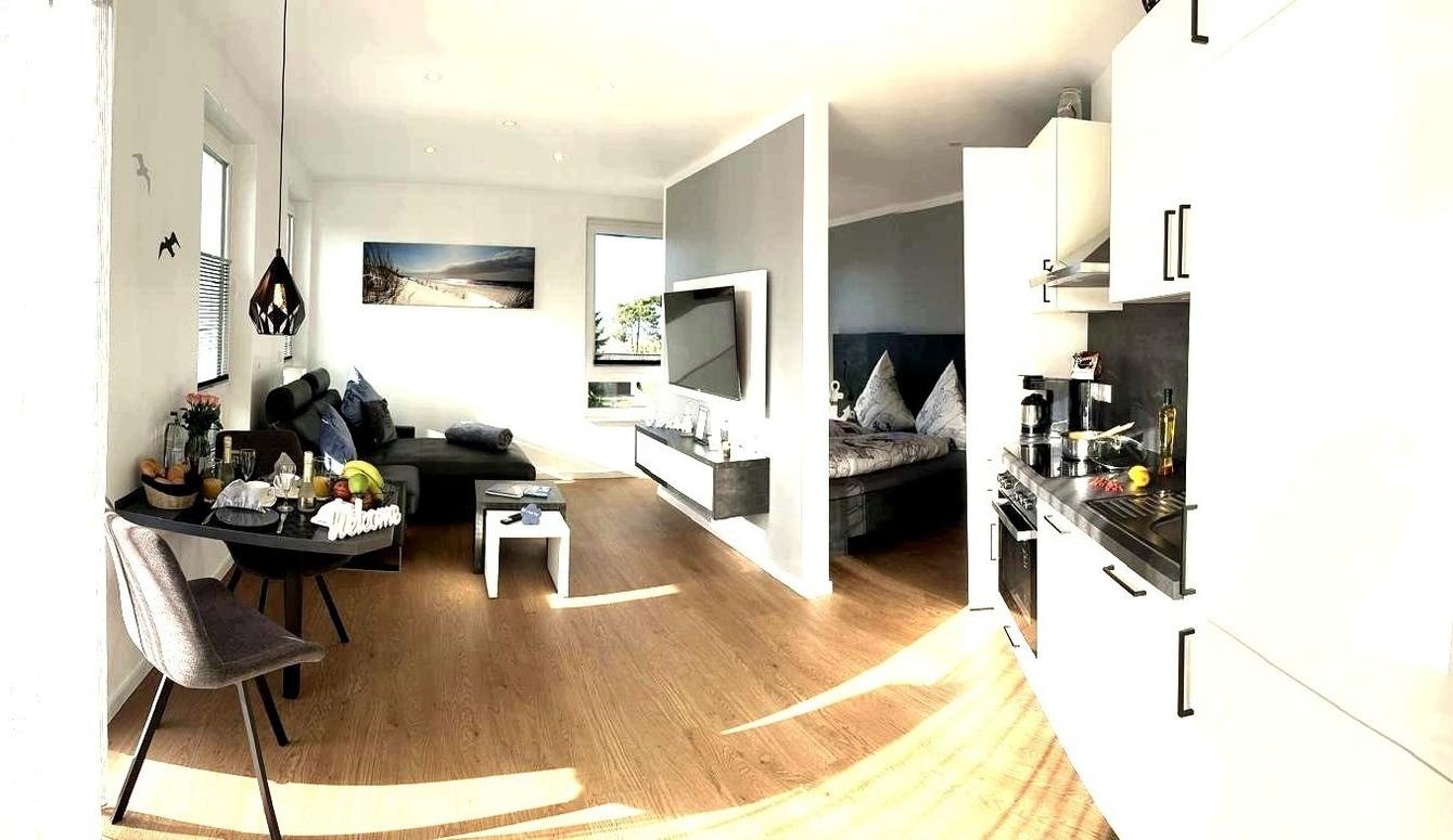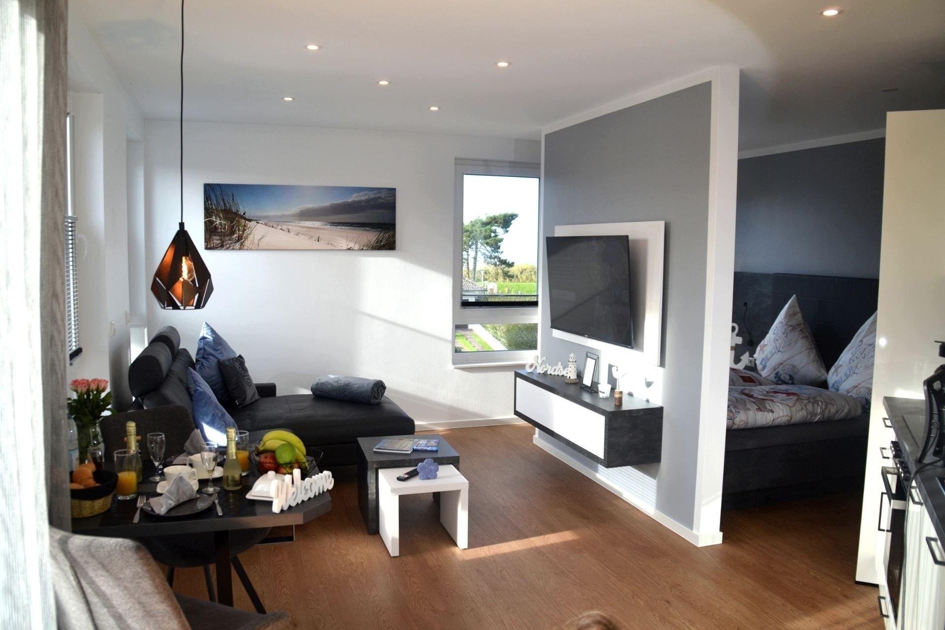 Das große, offen gestaltete Zimmer verbindet Wohnen, Schlafen, Kochen und Essen harmonisch miteinander und bietet nach einem Tag am nahegelegenen Sandstrand von Cuxhaven Duhnen den idealen Rahmen, um den Abend ausklingen zu lassen. Während Ihr Abendessen in der vollausgestatteten Küchenzeile köchelt, können Sie sich bereits auf der Couch entspannen oder den Esstisch decken.