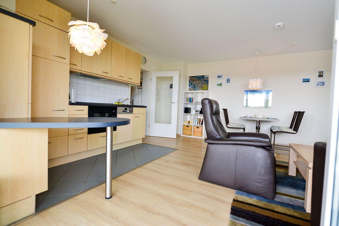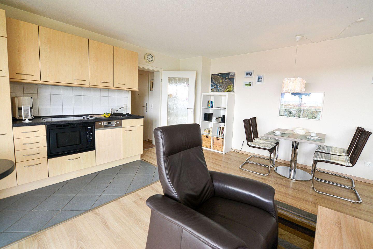 Die vollwertige Ausstattung der Ferienwohnung wird Sie keine Annehmlichkeiten des Alltags vermissen lassen und bietet Ihnen alles, was Sie für einen Urlaub ohne Abstriche an der Nordsee benötigen. Die schöne und vollwertige Küchenzeile eignet sich, um auch aufwendigere Gerichte zuzubereiten und typische nordische Gerichte auszuprobieren, der Wohnbereich lädt zu gemütlichen Abenden vor dem Flatscreen TV ein und das schöne Bad garantiert Erholung und neue Energie an jedem Ihrer Urlaubstage.