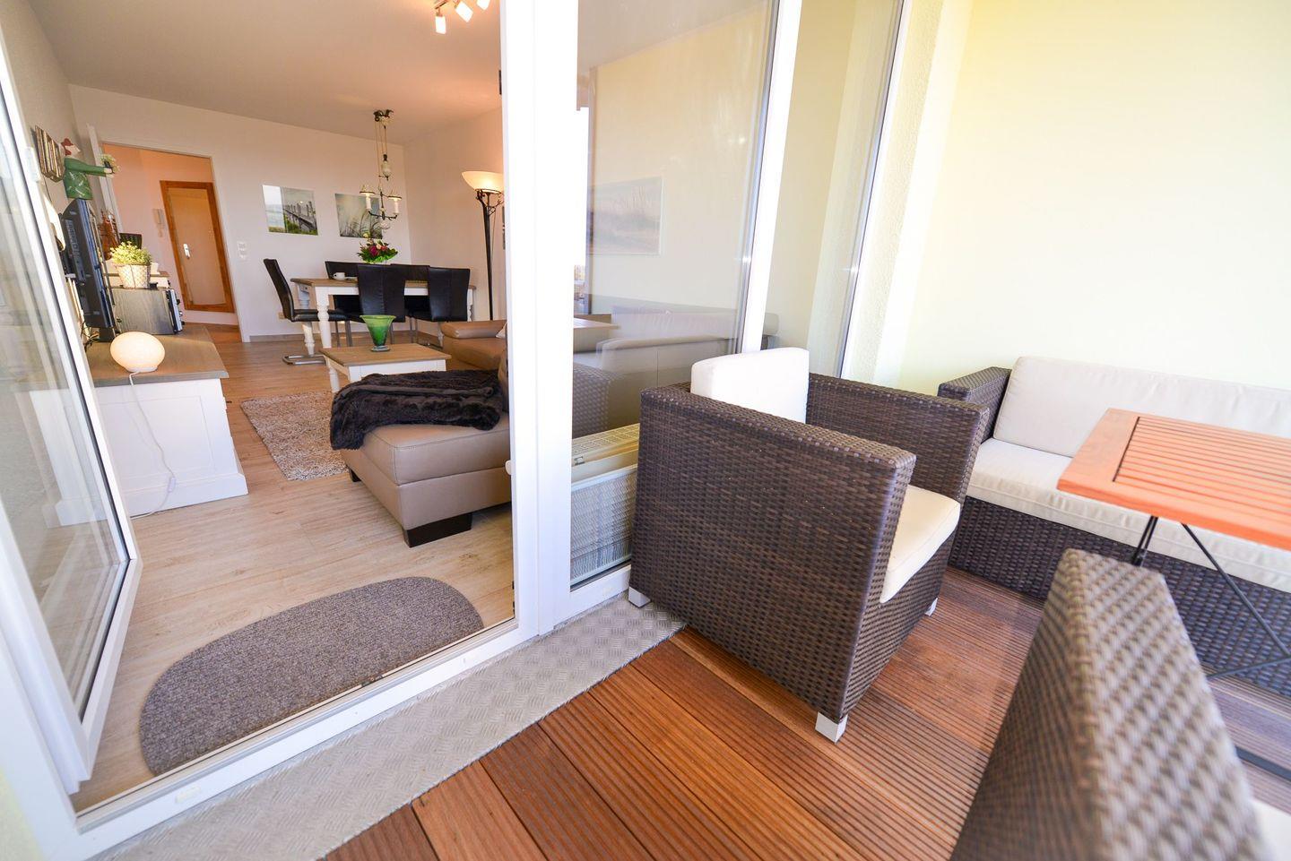 Komfortable Ferienwohnung in Cuxhaven mit direktem Meerblick und zwei überdachten Balkonen für entspannte Urlaubstage.