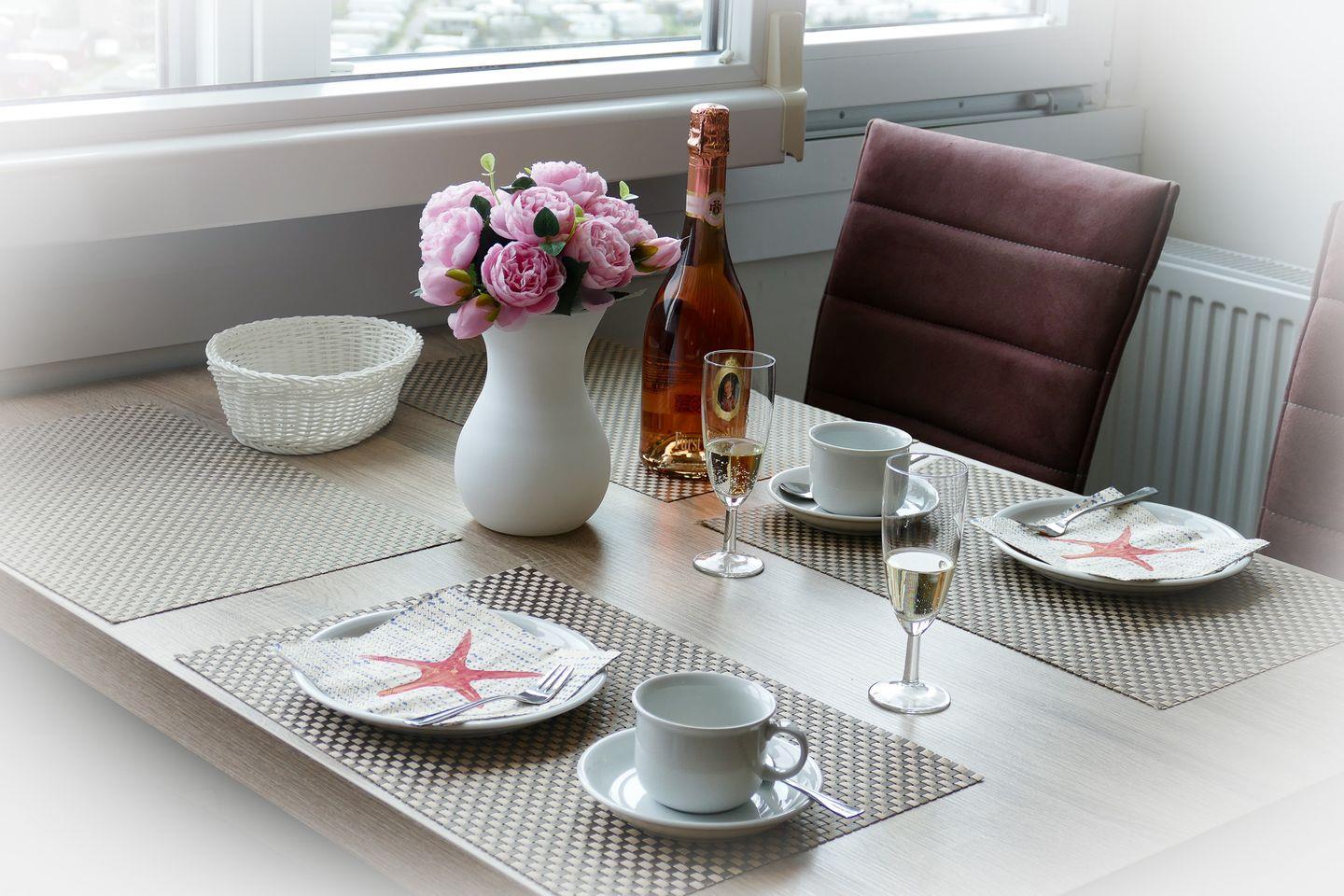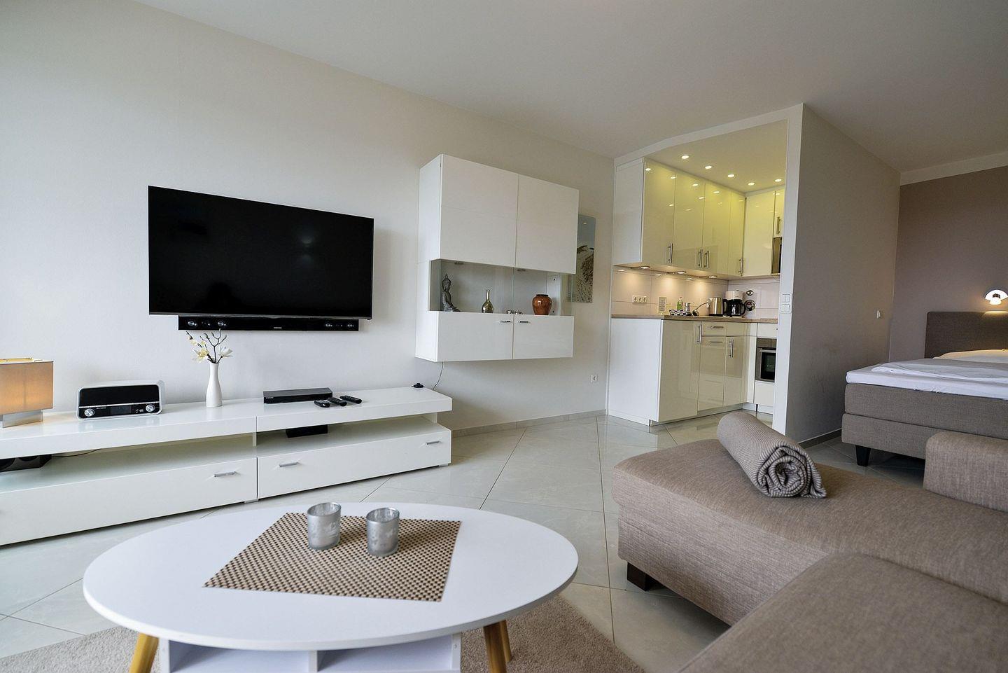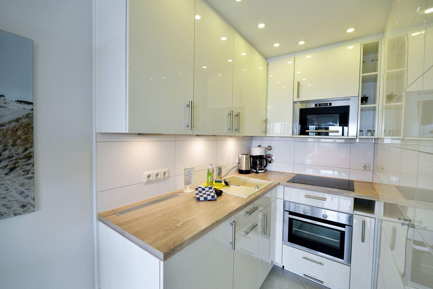Die lichtdurchflutete Ferienwohnung mit seitlicher Seesicht befindet sich in direkter Strandlage mit einer modernen, offenen und vollausgestatteten Küche, sodass Sie jeden Urlaubstag mit einem entspannten Frühstück am Meer beginnen können.