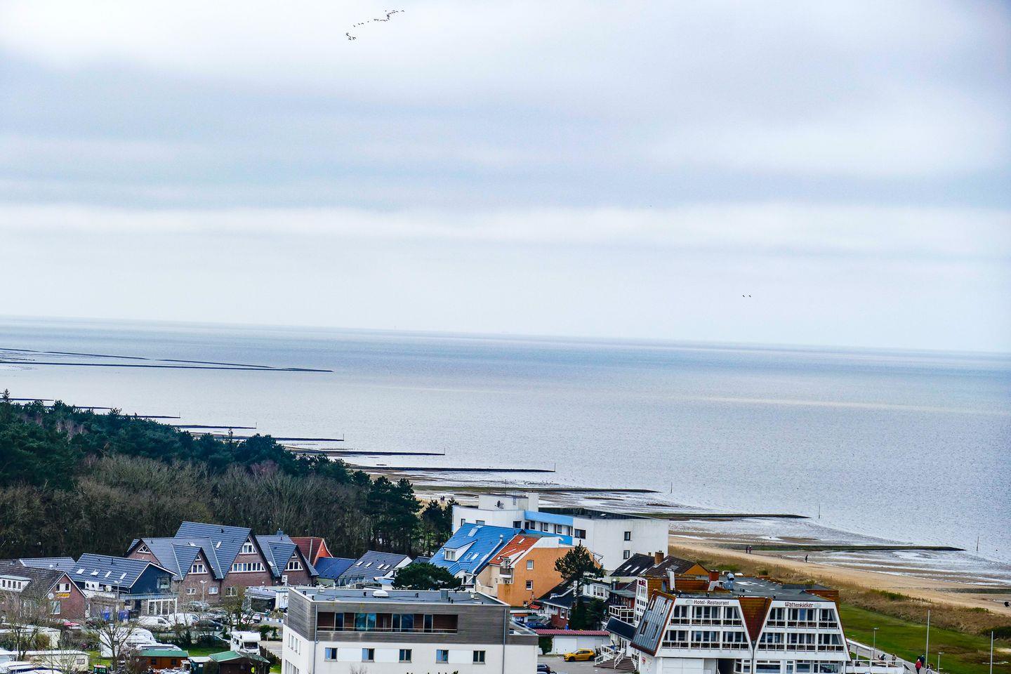 Exklusive Ferienwohnung in Cuxhaven mit seitlicher Seesicht, Sauna, Schwimmbad und direkter Strandlage für entspannte Urlaubstage.