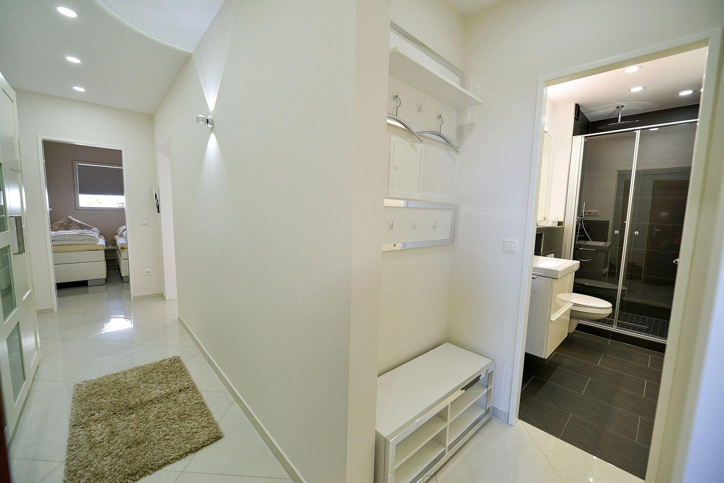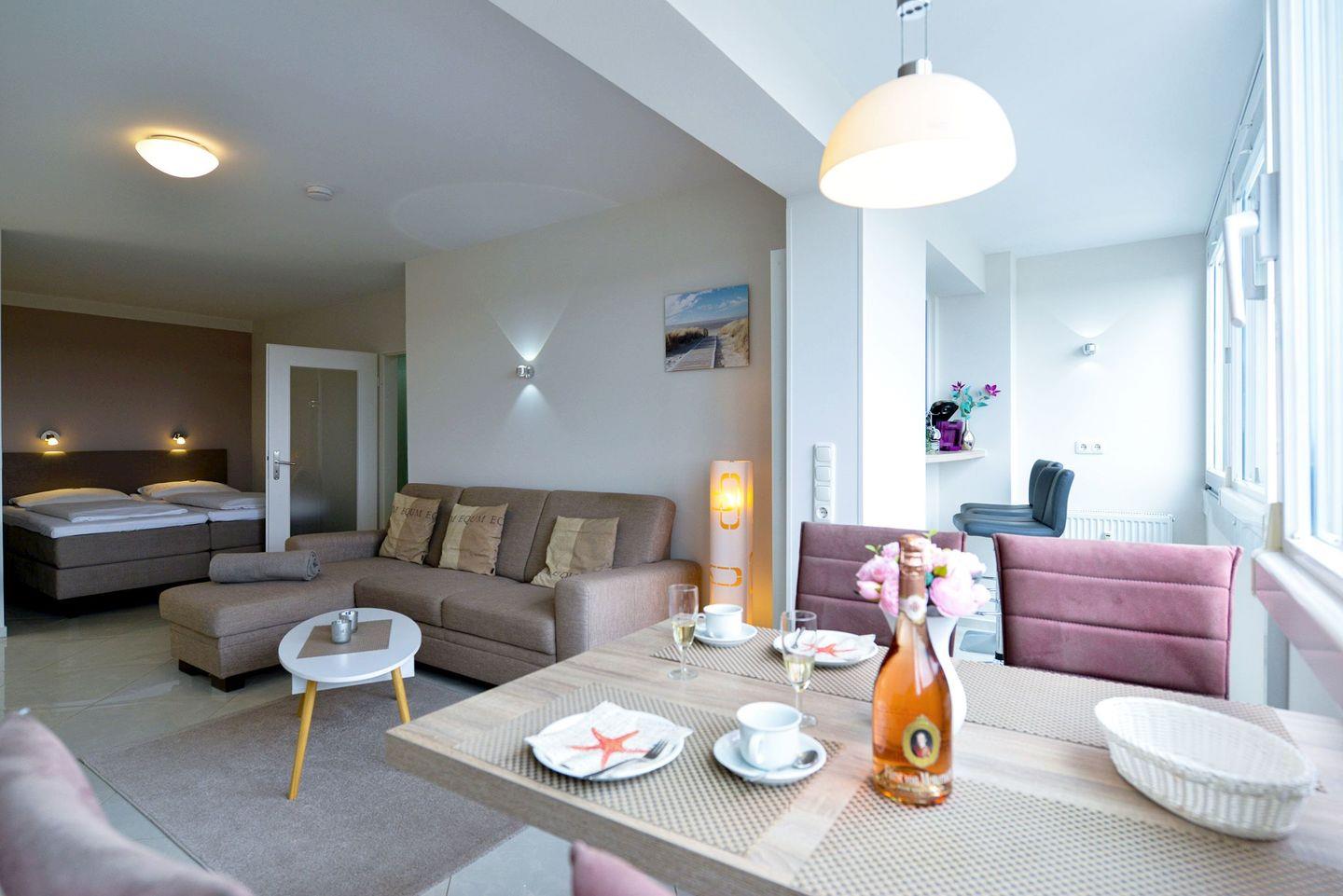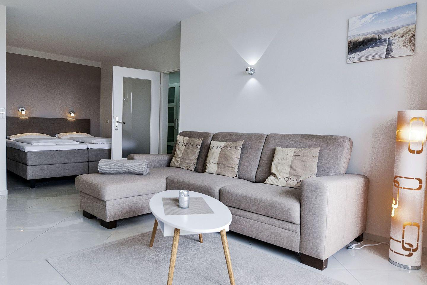 Die ca. 50m² große Ferienwohnung für bis zu 4 Personen begrüßt Sie mit elegantem modernem Flair, Schwimmbad, Sauna und viel Raum für einen entspannten Urlaub im schönen Norden Deutschlands ? Meeresrauschen inklusive!