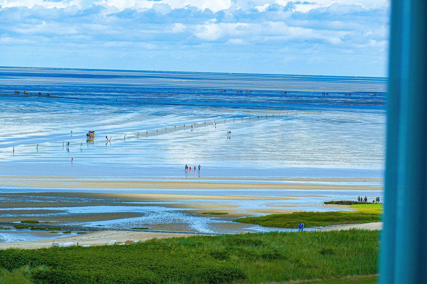 Moderne Ferienwohnung in Cuxhaven mit Panoramablick aufs Meer und Zugang zu Schwimmbad und Sauna.