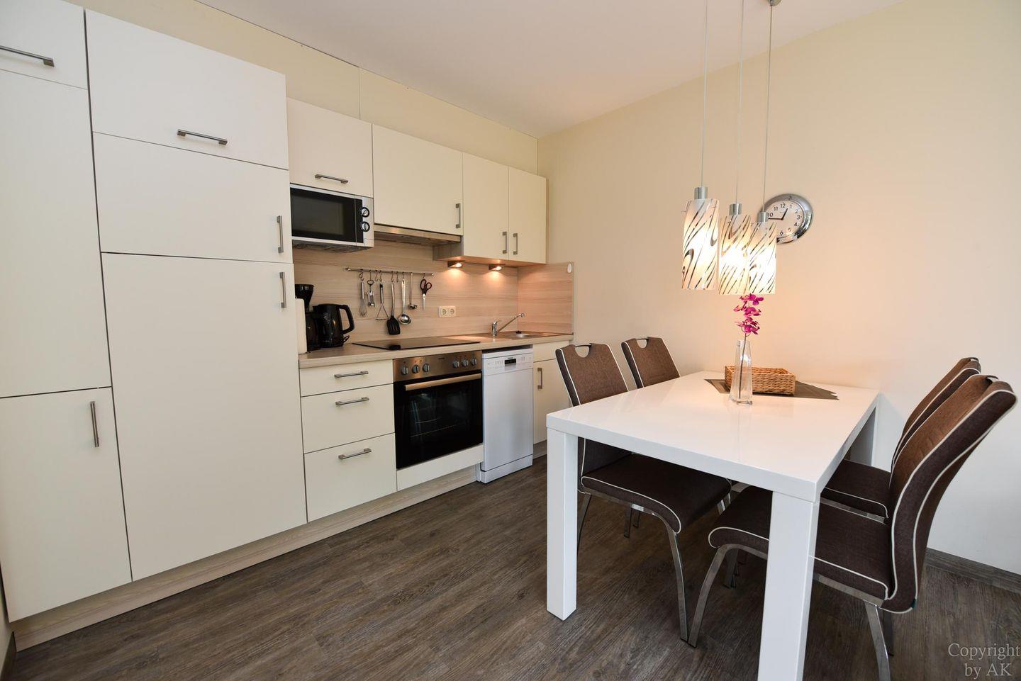 Die voll ausgestattete Küchenzeile lässt keine Wünsche offen und überzeugt durch moderne und hochwertige Ausstattung. Hier finden Sie unter anderem einen Vier-Platten-Ceranfeldherd mit Backofen, eine Mikrowelle, einen Geschirrspüler und eine Kaffeemaschine.