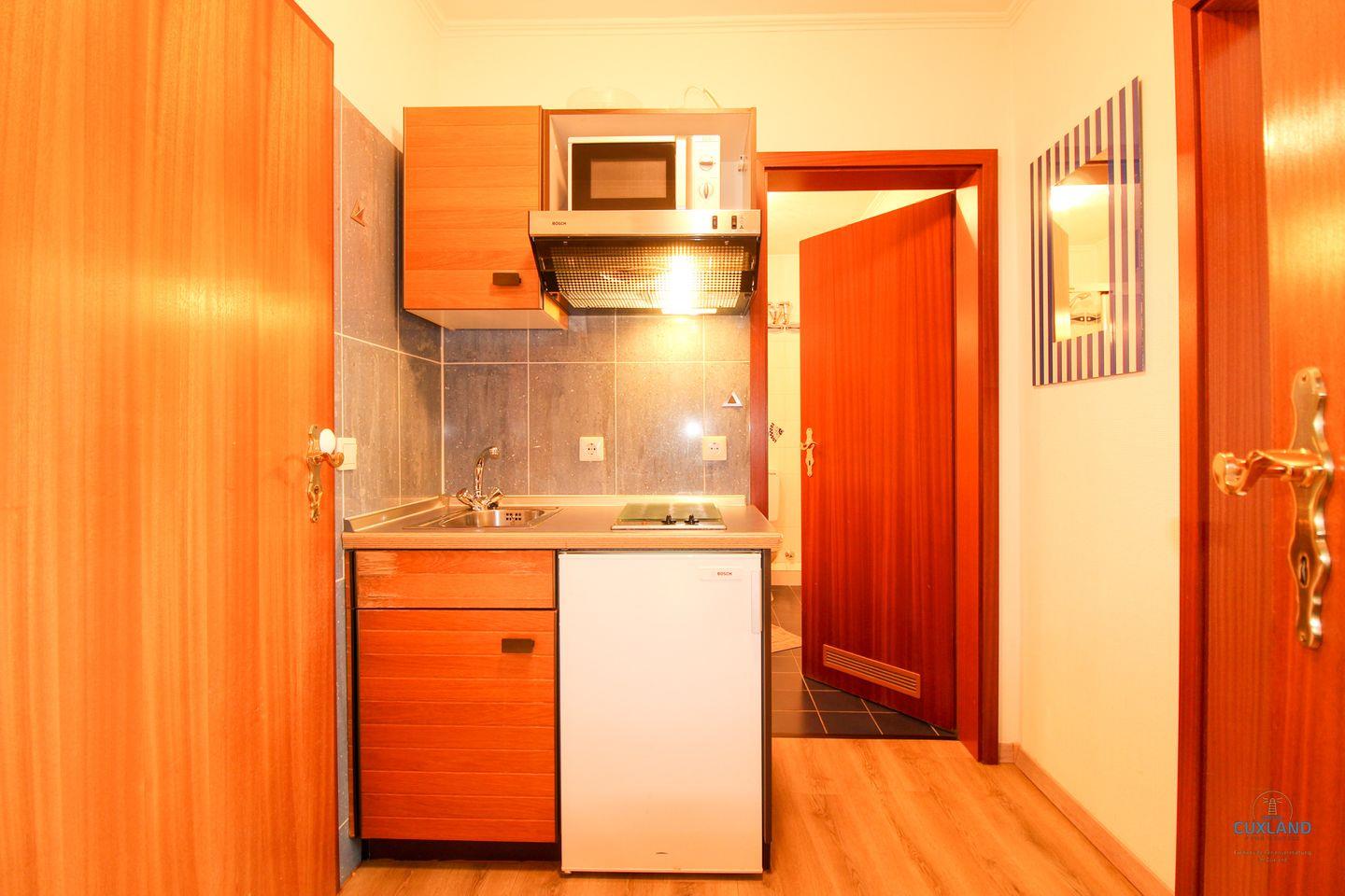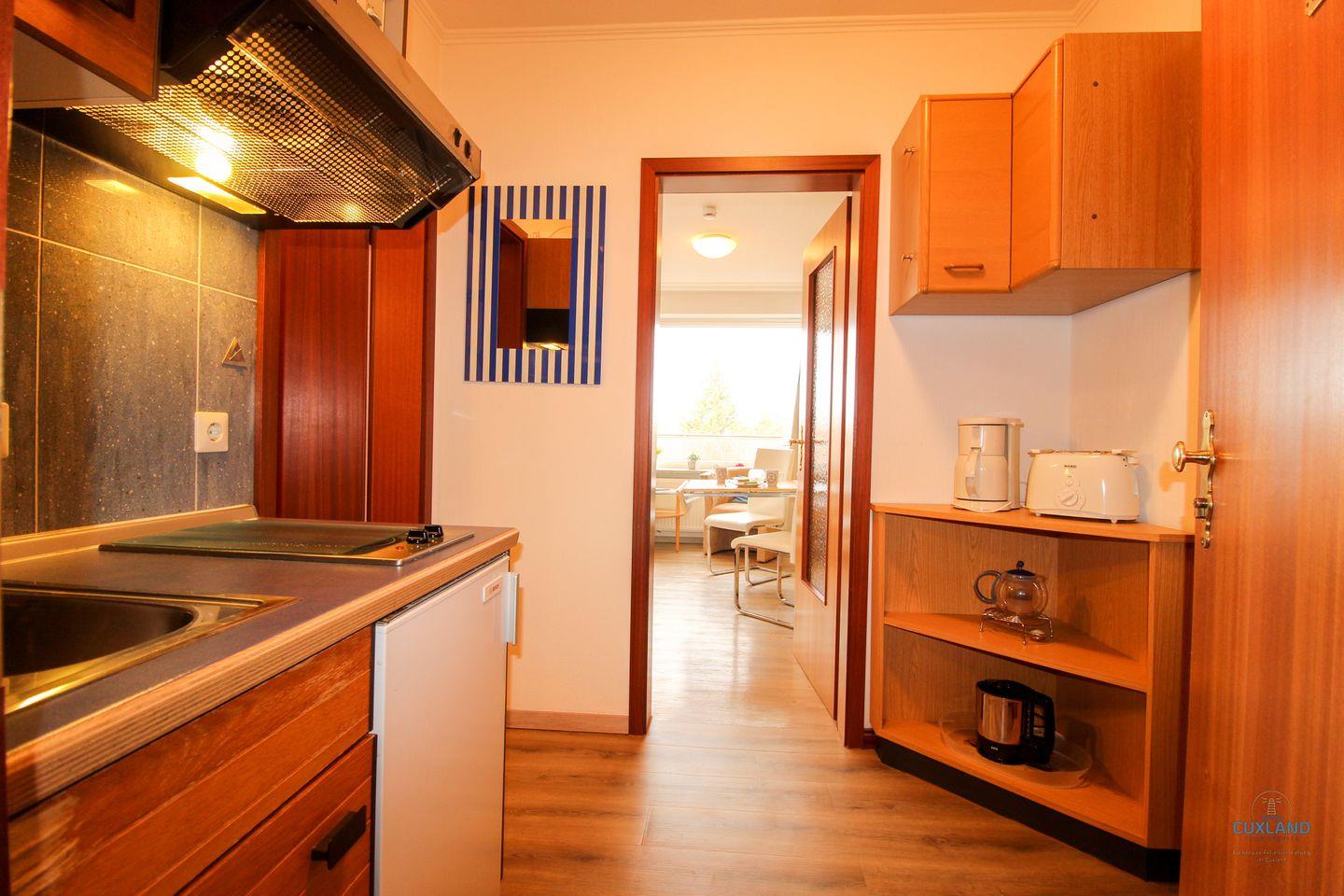 Gemütliches 29qm Ferienappartement in der 2. Etage des Haus Elbe in Döse. Wohn- und Schlafraum mit Blick auf die großzügige Terrasse. Kleine, gut ausgestattete Küche für Frühstück oder Snacks. Geräumiges Badezimmer in maritimem Blau. Kostenfreies WLAN und Parkplatz vor dem Haus.