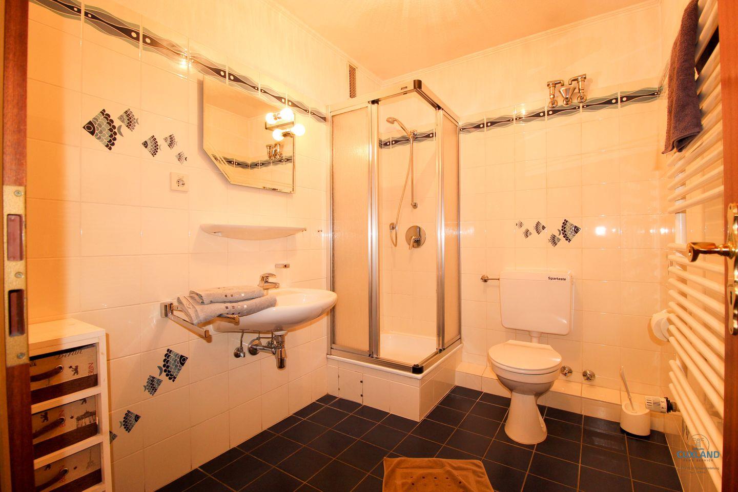 benötigt wird. Das geräumige Badezimmer, welches in maritimen blau gehalten