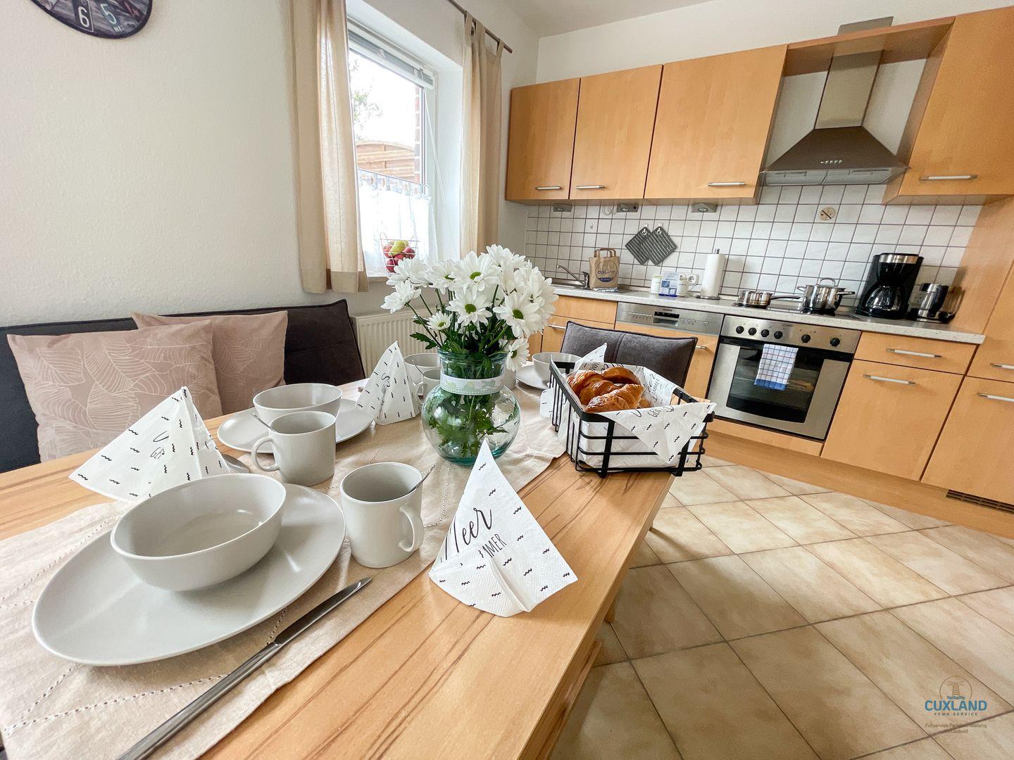 Essbereich mit offener Küche, in welcher sich jede Menge Leckereien zaubern