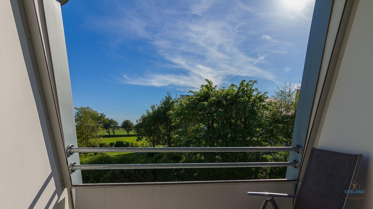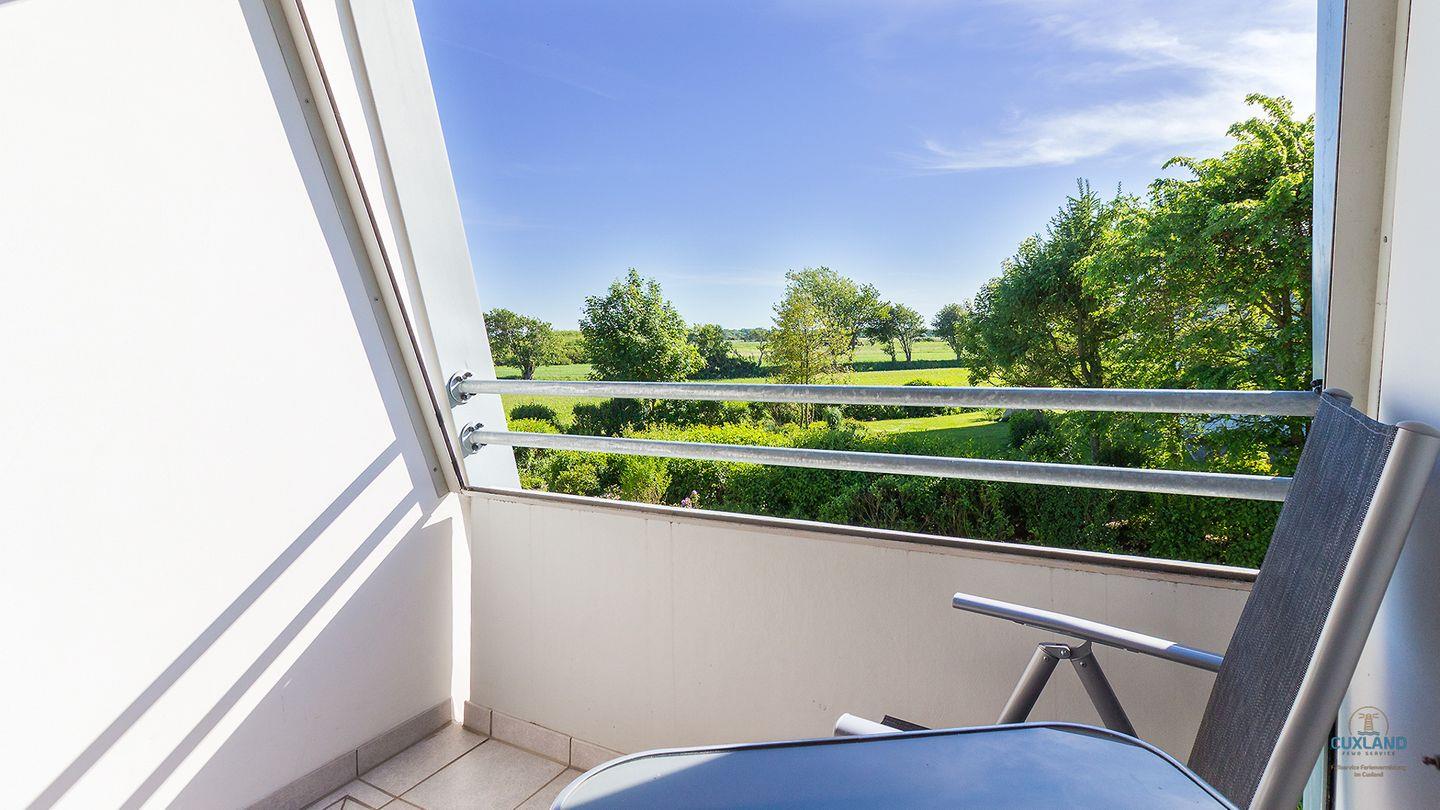Moderne Ferienwohnung mit Balkon und Blick auf die Duhner Heide, nahe Strand und Ortszentrum.