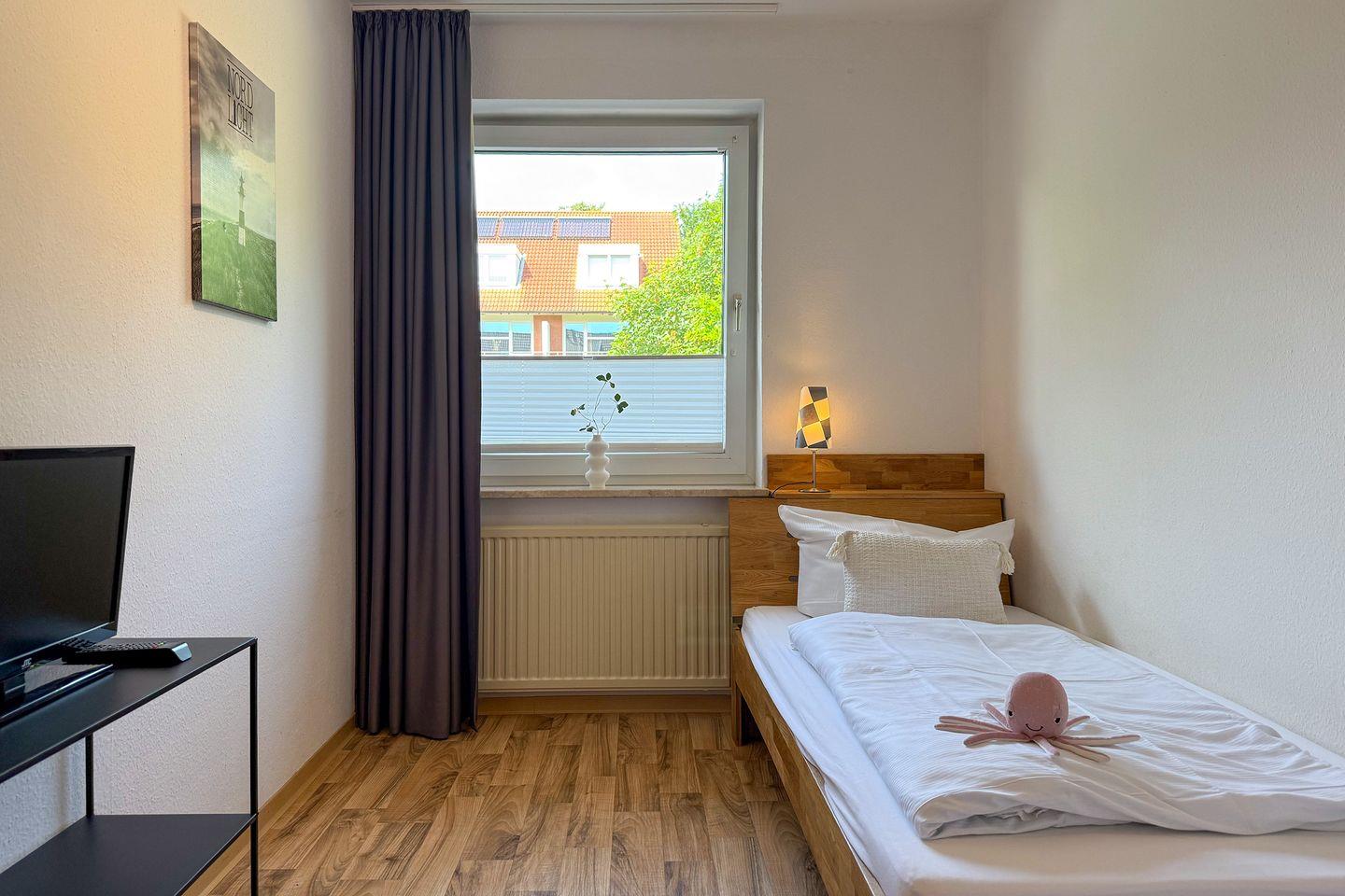 Die Ferienwohnung 7 im Landhaus Hubertus in Cuxhaven bietet auf 68 m² Platz für bis zu 4 Personen. Sie liegt im Erdgeschoss, verfügt über zwei Schlafzimmer, ein modernes Bad mit Dusche und Wanne, eine geschlossene Küche mit Spülmaschine sowie einen überdachten Terrassenbereich mit Garten. WLAN, TV, Privatparkplatz sowie gemeinschaftliche Waschmaschine und Trockner stehen zur Verfügung.