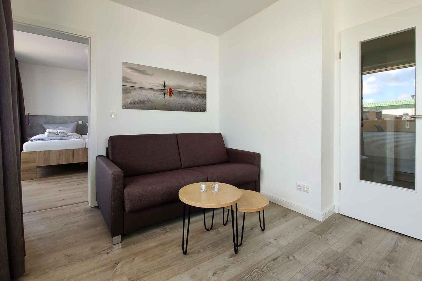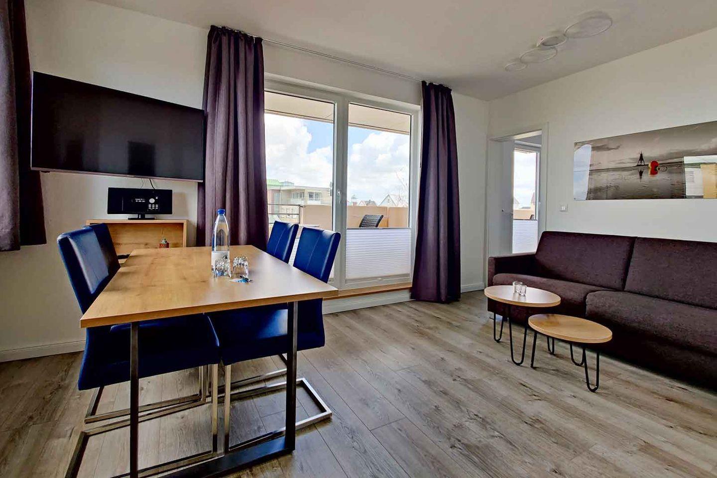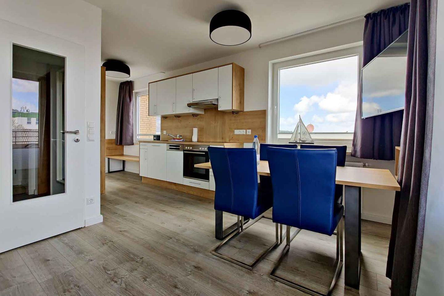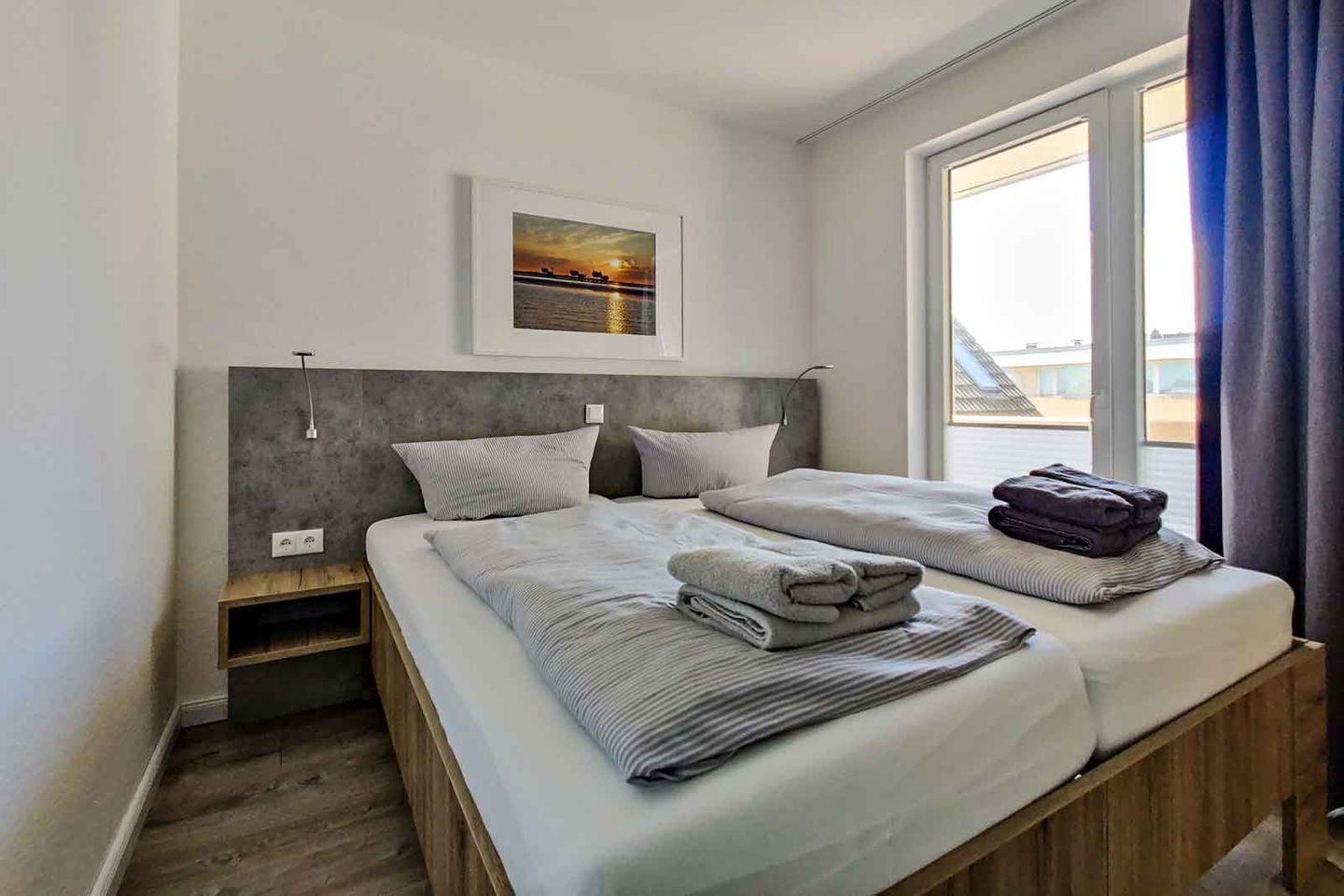 Die 2021 sanierte / renovierte Ferienwohnung punktet auf allen Ebenen. Im geschmackvoll eingerichteten Wohnraum befinden sich die offene Küche, der Essbereich und ein Schlafsofa mit eigener Matratze. Zwei Schlafzimmer (eines davon mit Wärmekabine) und zwei Duschbäder ergänzen das Wohnkonzept. Zwei der drei Balkone bieten nicht nur die frische Luft der Nordsee sondern auch einen Blick aufs Meer. Zur Wohnung gehört ein KFZ-Außenstellplatz.