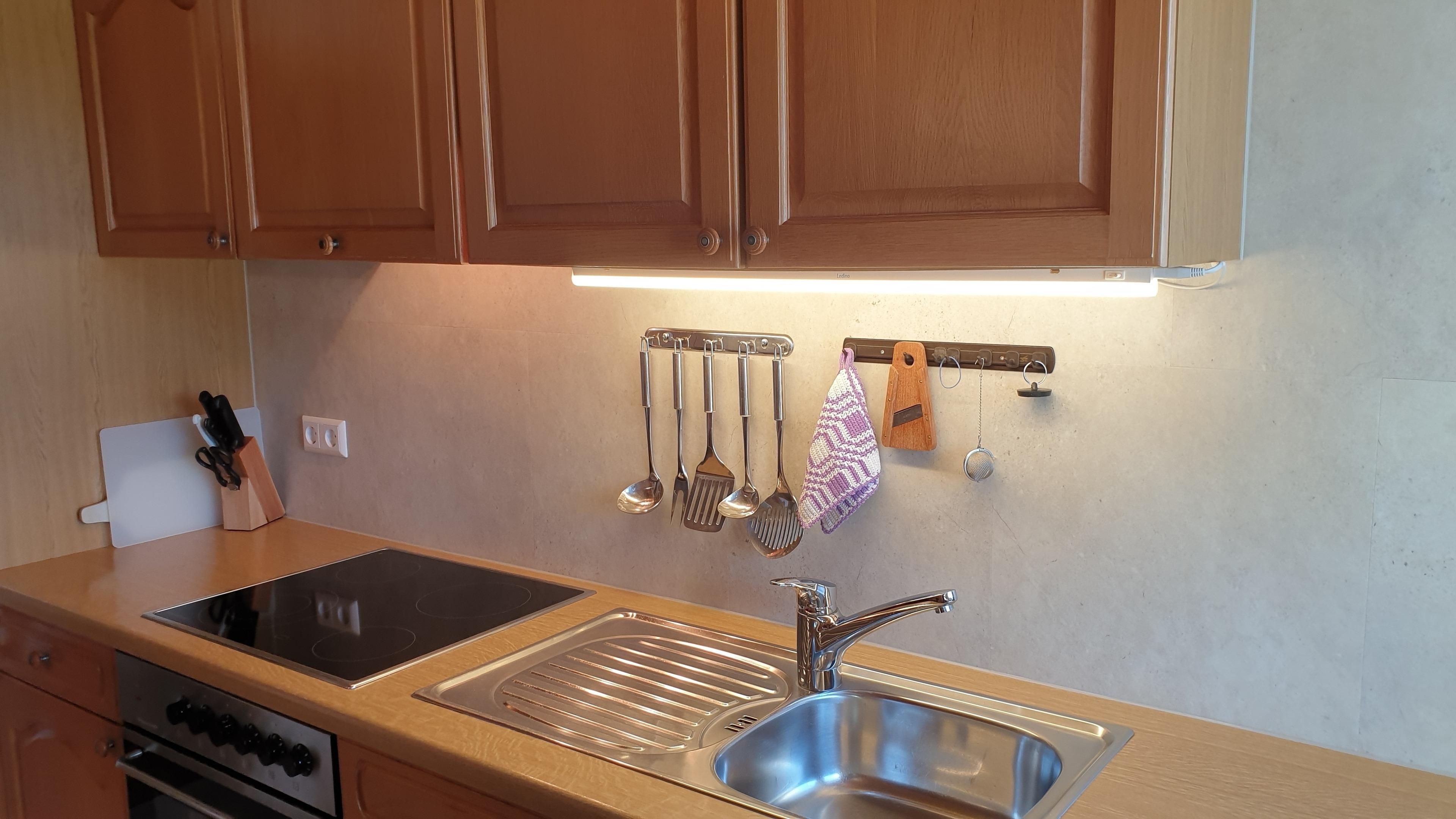 die umfangreich eingerichtete Küchenzeile ist mit Geschirrspüler, Herd mit Backofen, Brotmaschine, Mikrowelle, Wasser-/Eierkocher, Toaster, Mixer, Waffeleisen, Kaffeemaschine, Senseo-Padmaschine, Pürierstab etc. ausgestattet.