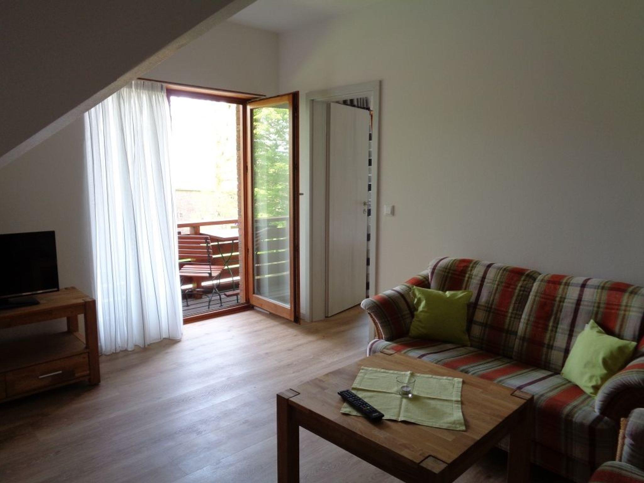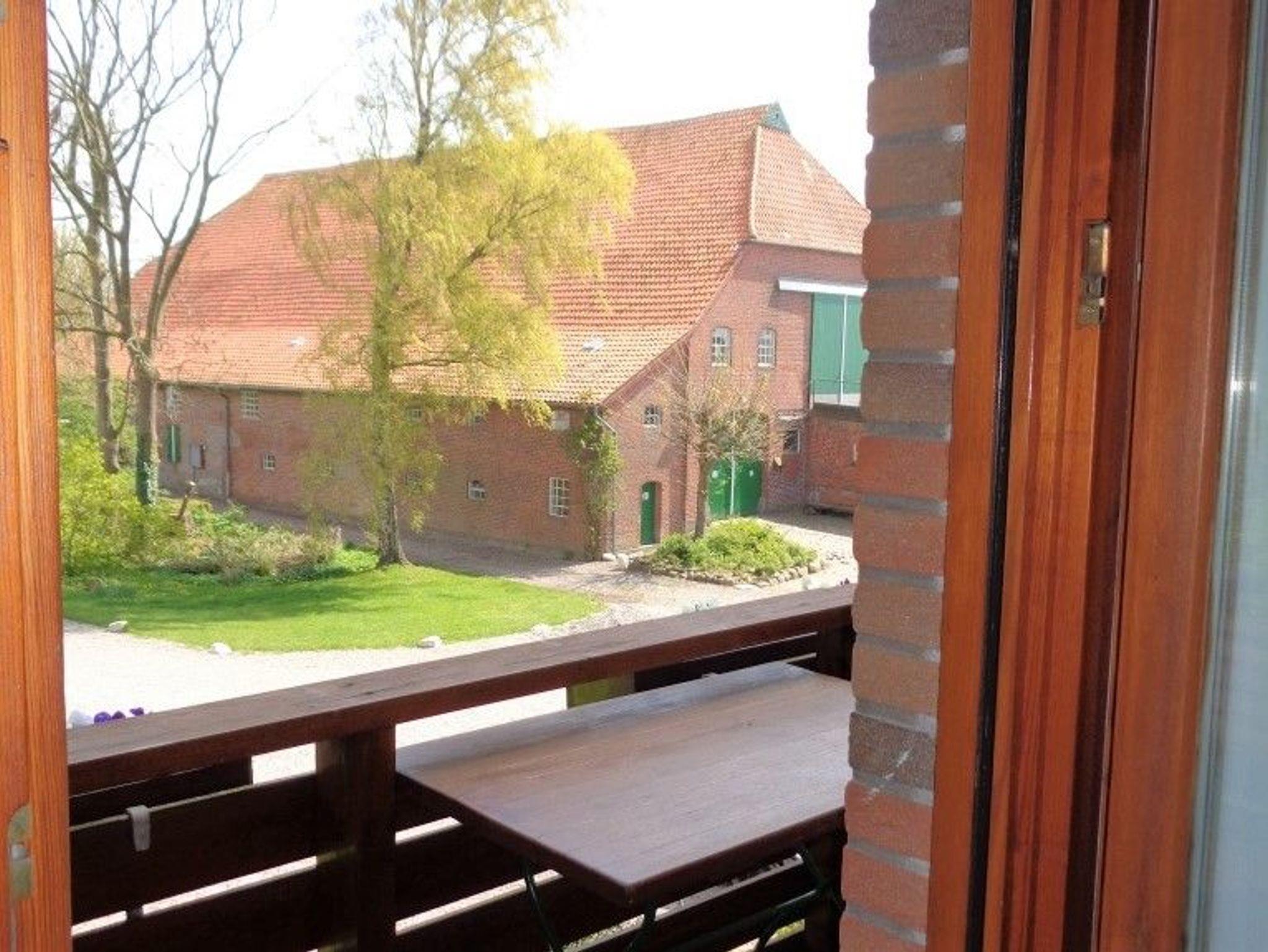 Moderne Ferienwohnung Hoffeld im sanierten Bauernhaus mit Balkon und Blick auf den Hof, ideal für naturnahe Erholung in Dahme.