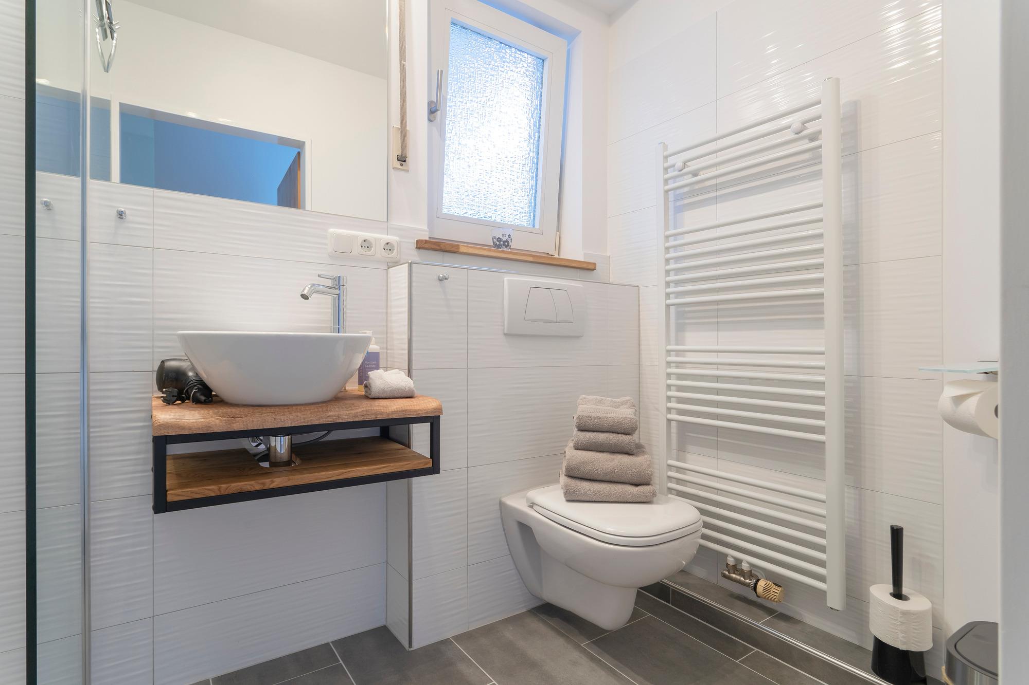 Schönes Bad mit bodengleicher Dusche, Türen sind breit genug für einen Rollstuhl. In den letzten Jahren wurde die Wohnung regelmäßig von geübten Rollstuhlfahrern gebucht. Bitte beachten Sie, dass wir die Wohnung nicht als rollstuhlfreundlich oder gar barrierefrei anbieten.