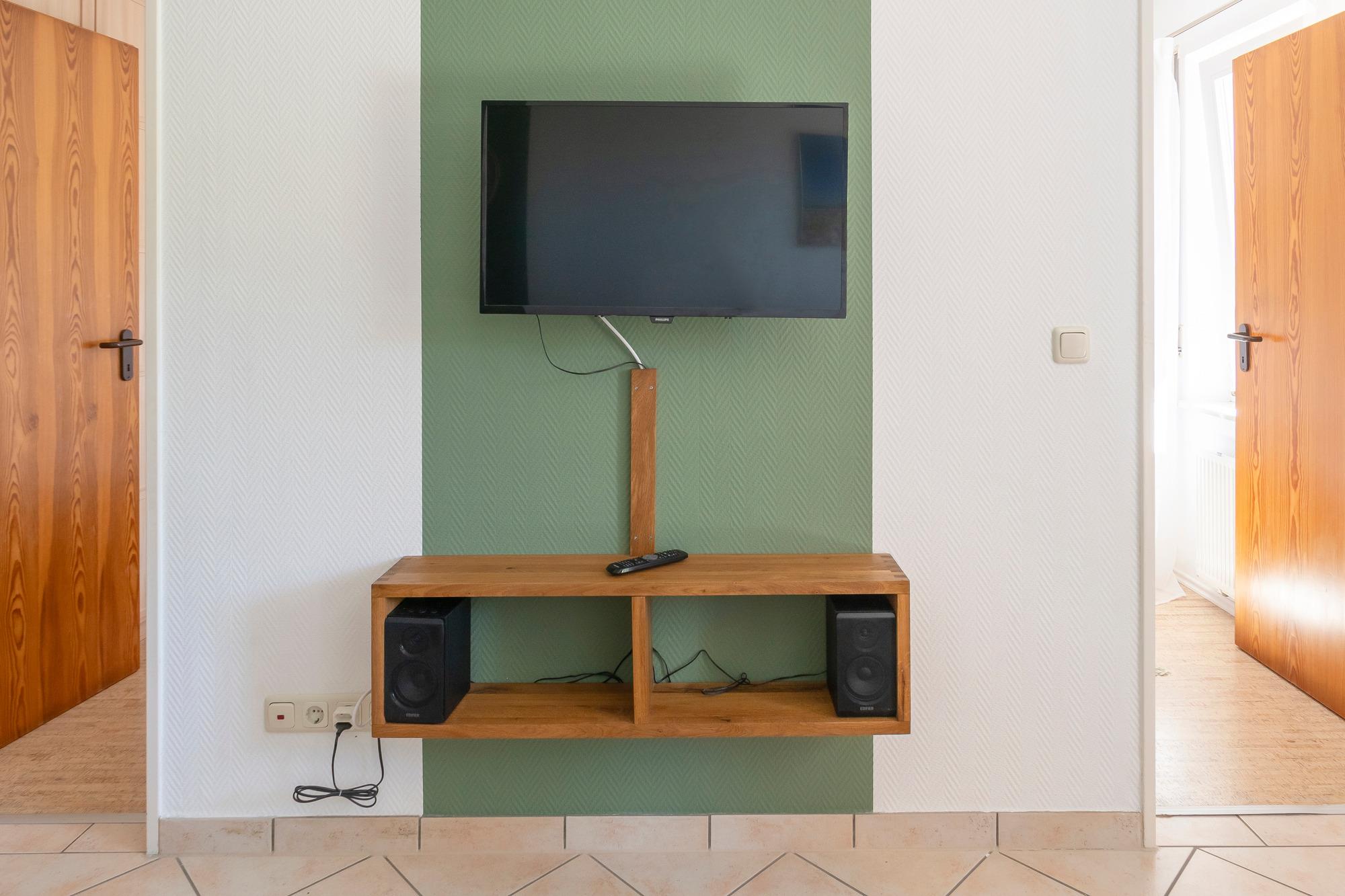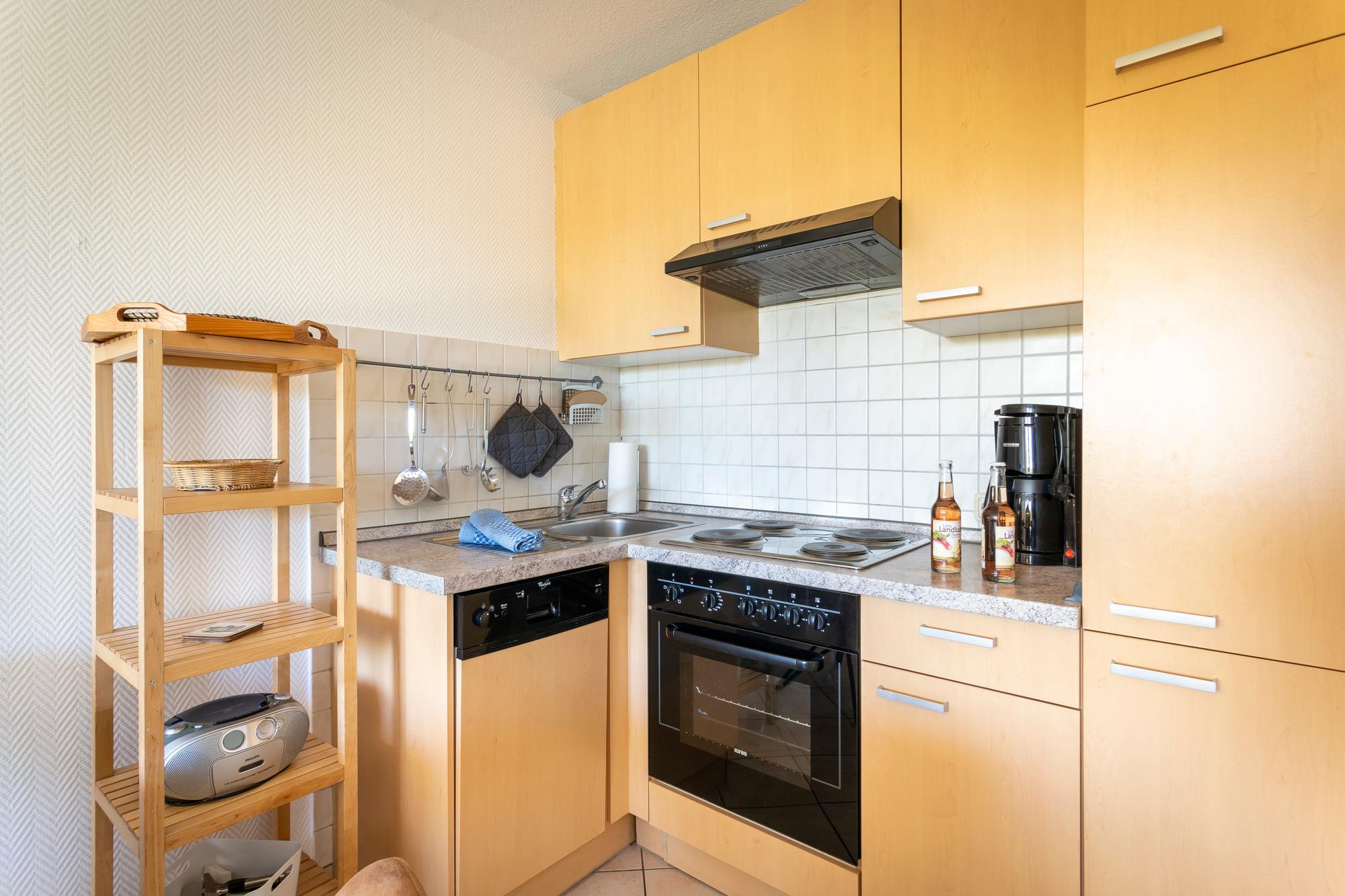 Erdgeschosswohnung mit zwei Schlafzimmern, Wohnküche mit gut ausgestattetem Küchenblock (Spülmaschine, Backofen, Kühlschrank mit Gefrierfach), möblierte Süd-Terrasse, Rolläden, im Kinderzimmer ist ein festes Bett (190 x 90 cm) und als zweites Bett wahlweise ein Kinder-Gitterbett oder ein offenes Bett in 160 x 80 cm für Kinder bis ca. 10 Jahre. Nummerierter Parkplatz direkt am Haus. Internet über LAN und WLAN (via Freifunk).