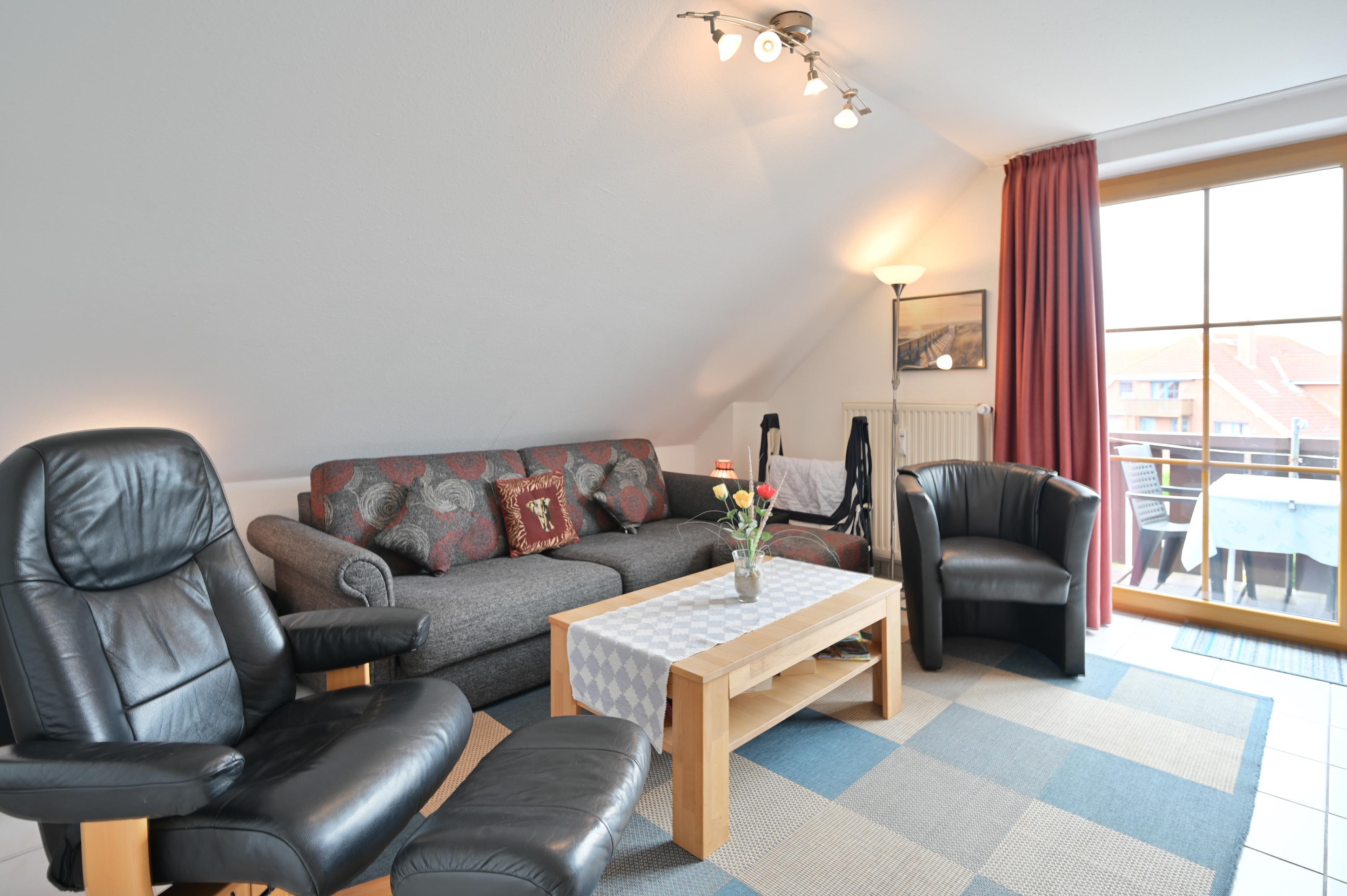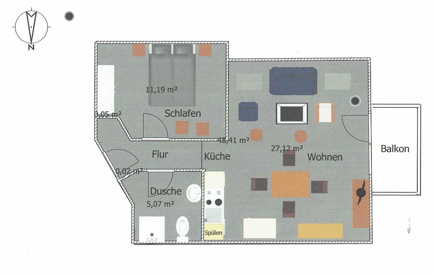 Außerdem befinden sich in der Wohnung ein Esstisch mit 4 Schwingstühlen, eine neue voll augestattete Küchenzeile (mit Spülmaschine, Mikrowelle, Kleinbackofen, Gefrierfach). Es besteht ein Zugang vom Wohnraum zum möblierten Süd-West-Balkon.