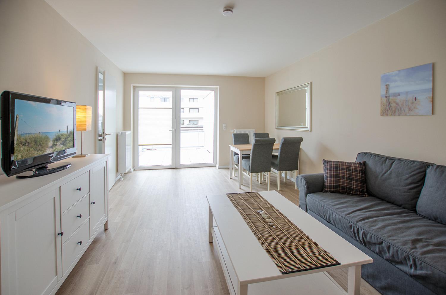 Das Wohnzimmer ist mit Schlafsofa, Couchtisch, Sideboard und TV und mit Esstisch für 4 Personen eingerichtet. Von hier aus haben Sie Zugang zum großen, sonnigen Balkon.