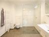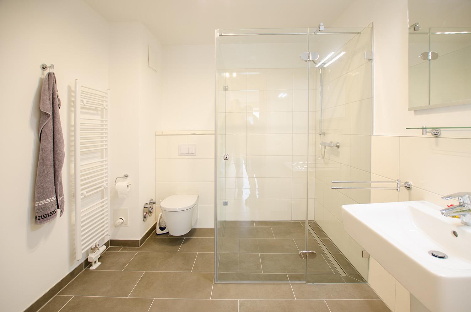 Das Badezimmer verfügt über eine große ebenerdige Dusche und WC.