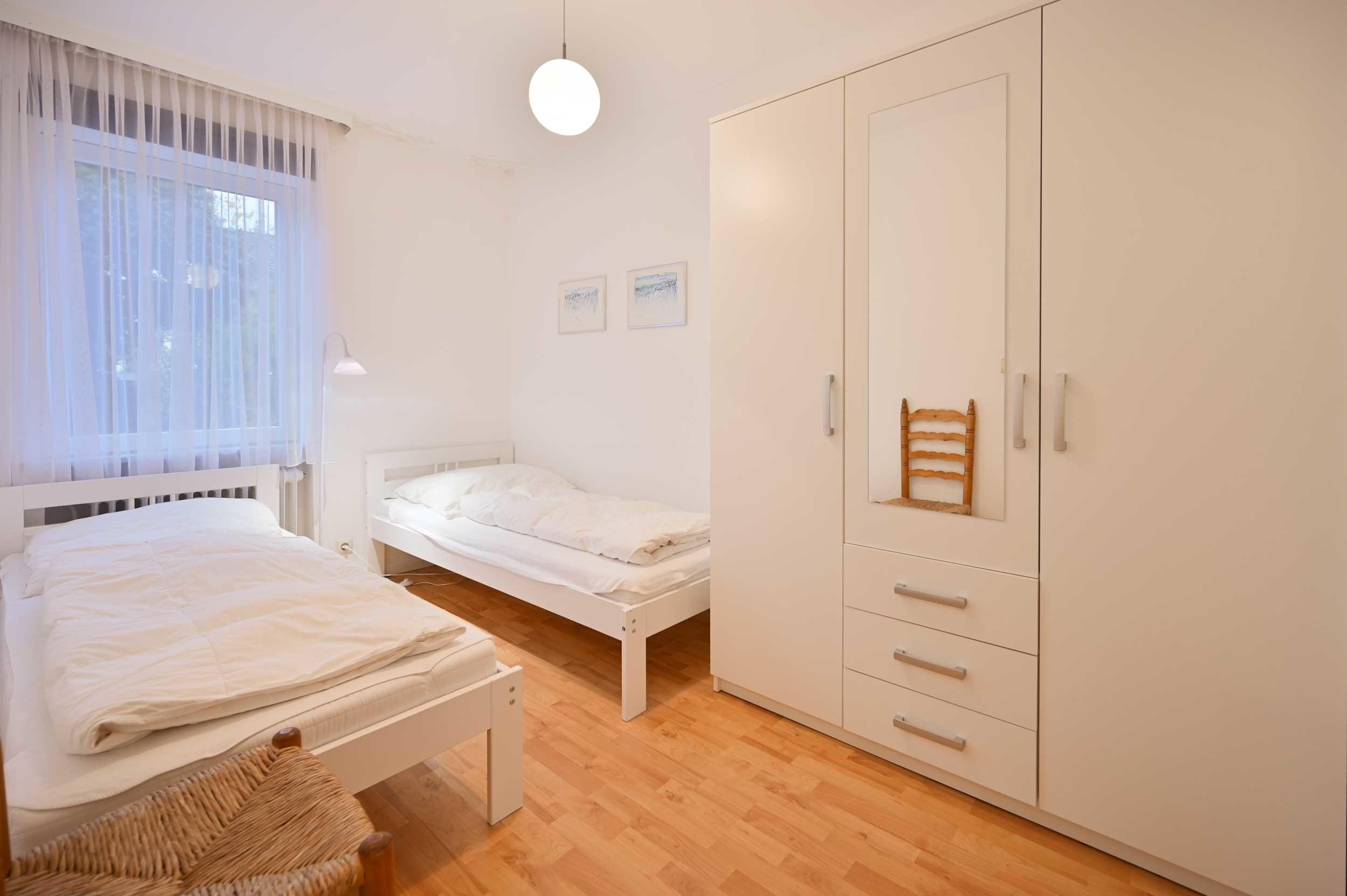 Das separate Schlafzimmer ist mit zwei Einzelbetten ausgestattet. Zur Wohnung der Familie Borowski gehören zudem eine Küche und ein Bad mit Dusche und WC. Darüber hinaus können es sich Gäste auf der zur Wohnung gehörenden Terrasse gemütlich machen.