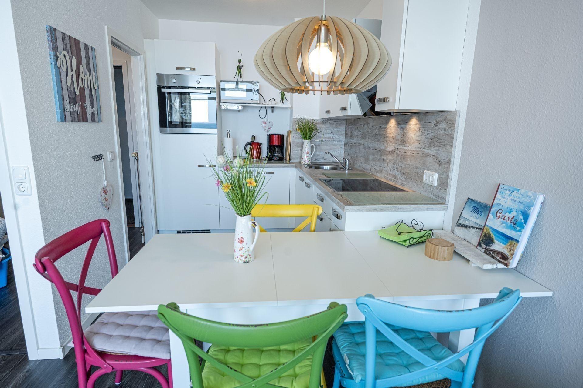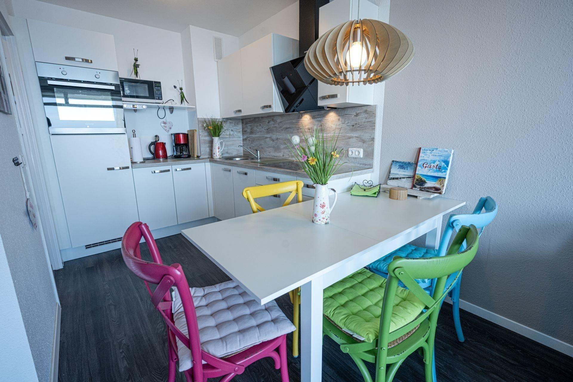 Die Küche ist mit Backofen, Mikrowelle, Geschirrspüler uvm. ausgestattet und über die Essecke mit dem Wohnbereich verbunden.