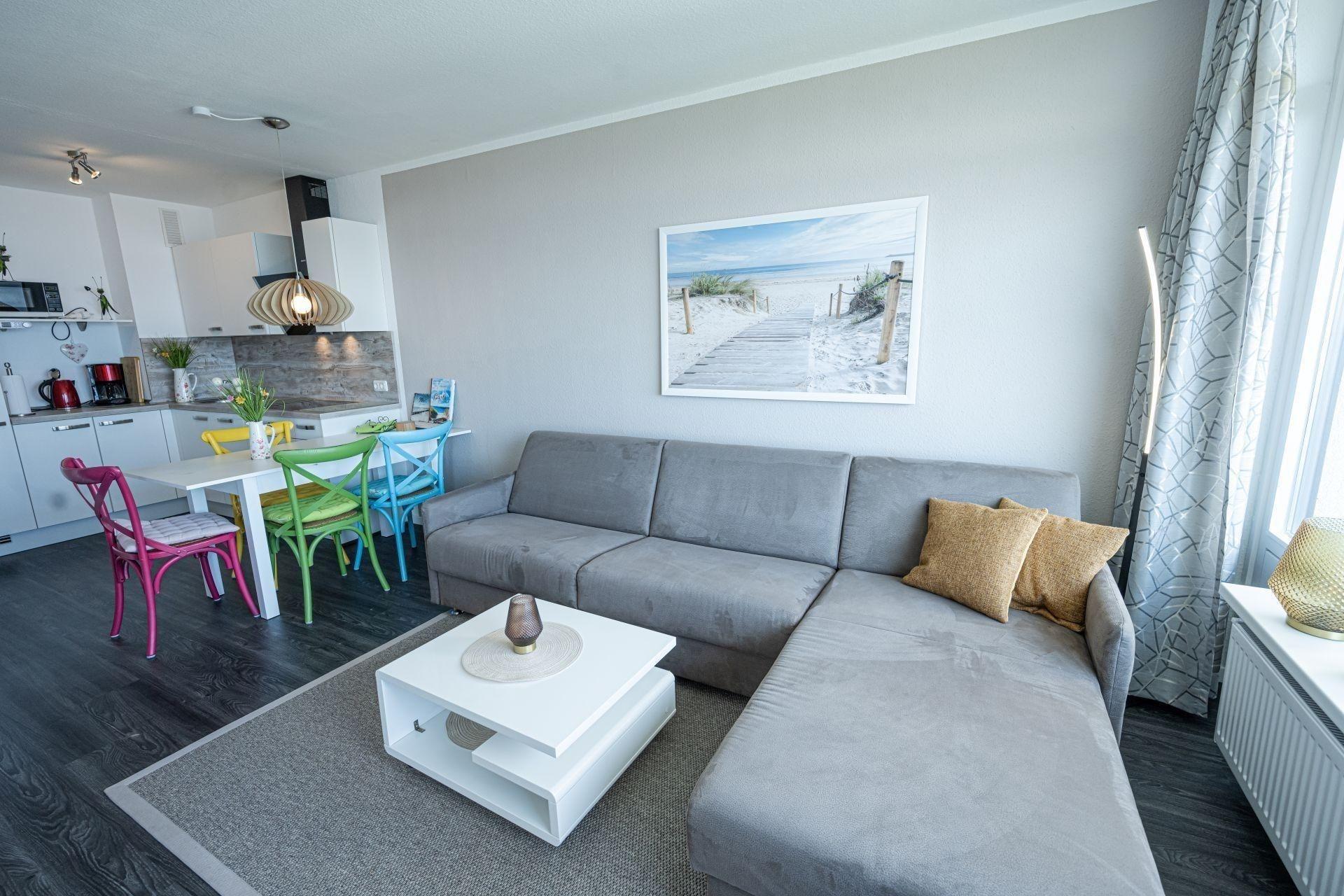 Das Schlafzimmer verfügt über ein Doppelbett, das Ecksofa im Wohnzimmer kann ebenfalls als Schlafmöglichkeit (160 cm) genutzt werden. Sowohl Schlaf- als auch Wohnzimmer sind jeweils mit einem Fernseher ausgestattet. WLAN gehört selbstverständlich dazu.